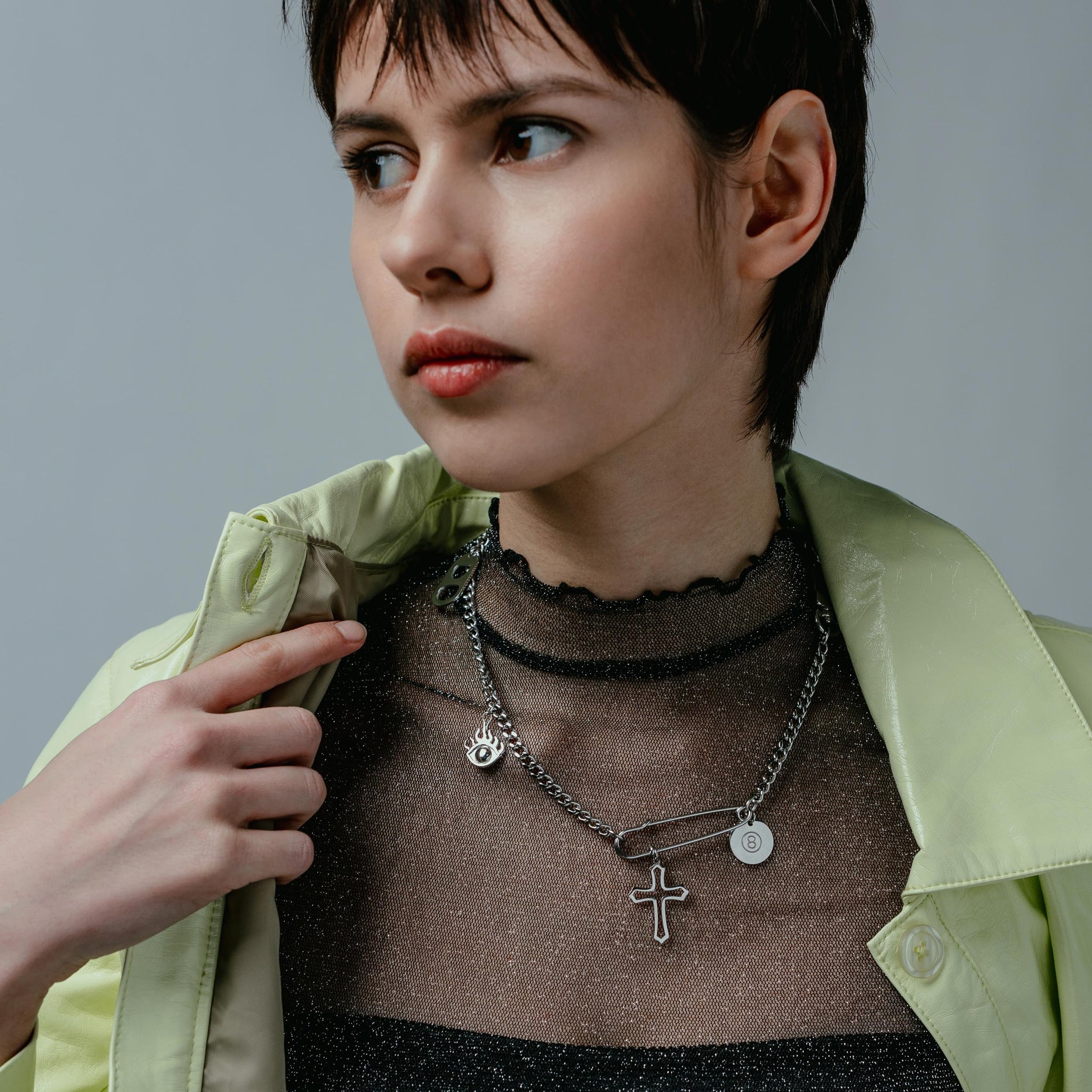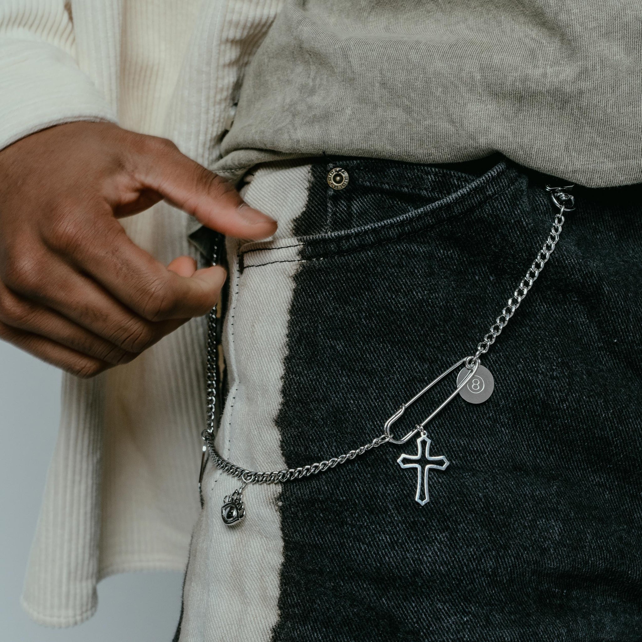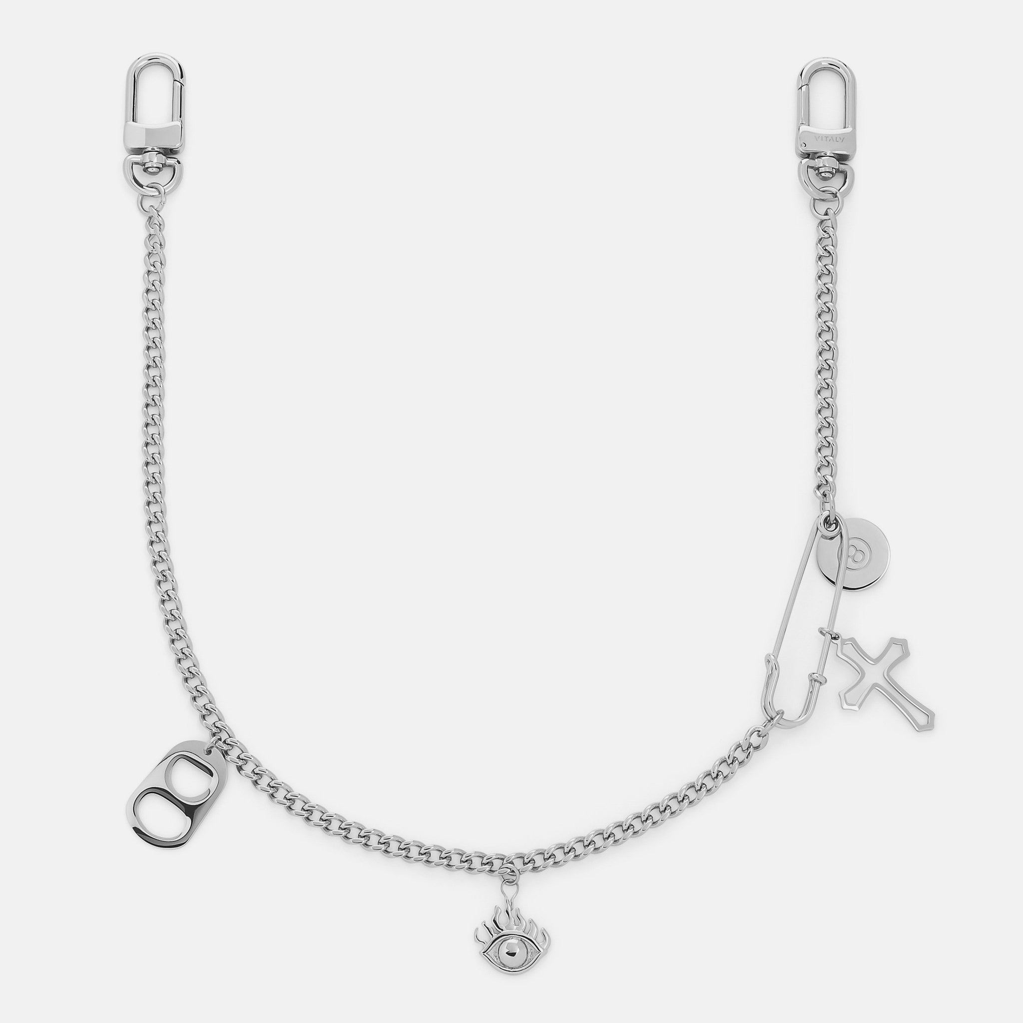 Taking its name from the word meaning "add as an extra or subordinate part," this wallet chain features four dangling charms that centre around an oversized safety pin. Can also be worn as a necklace.