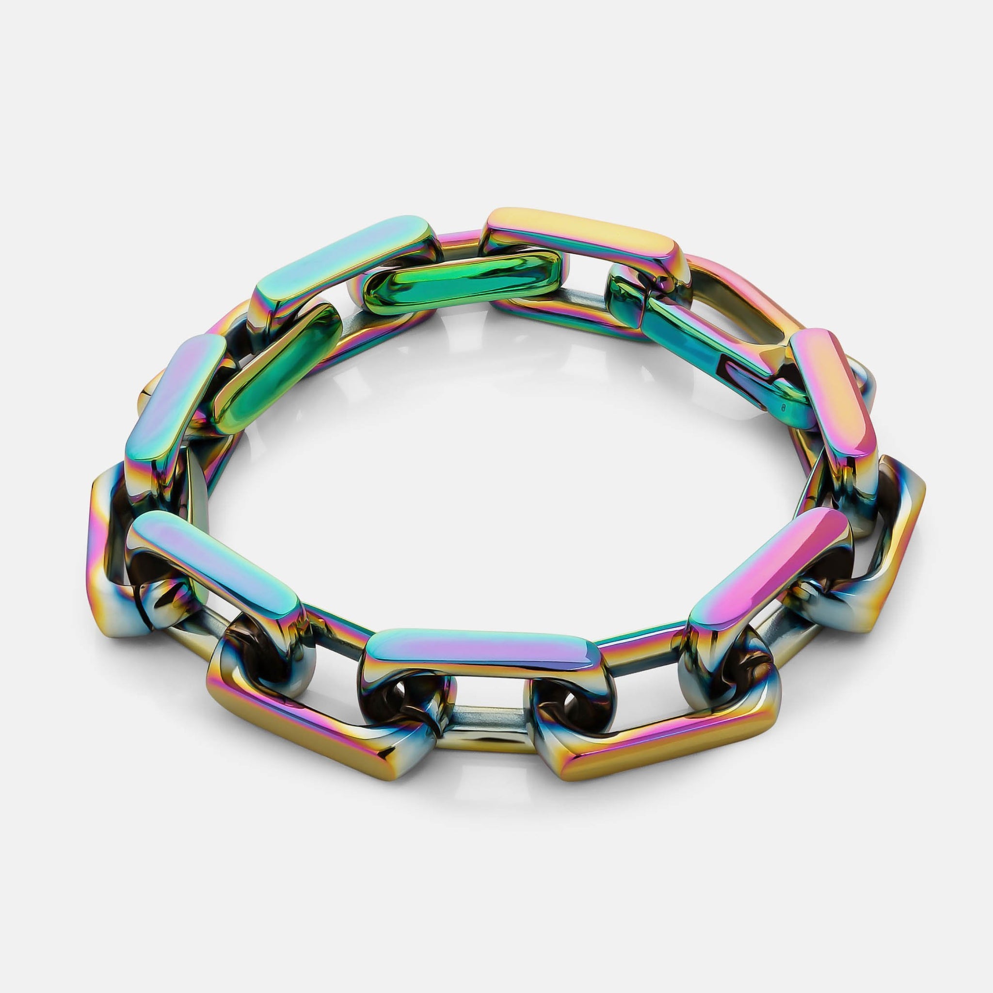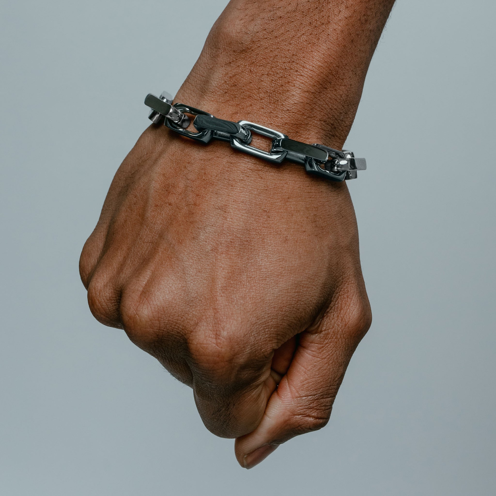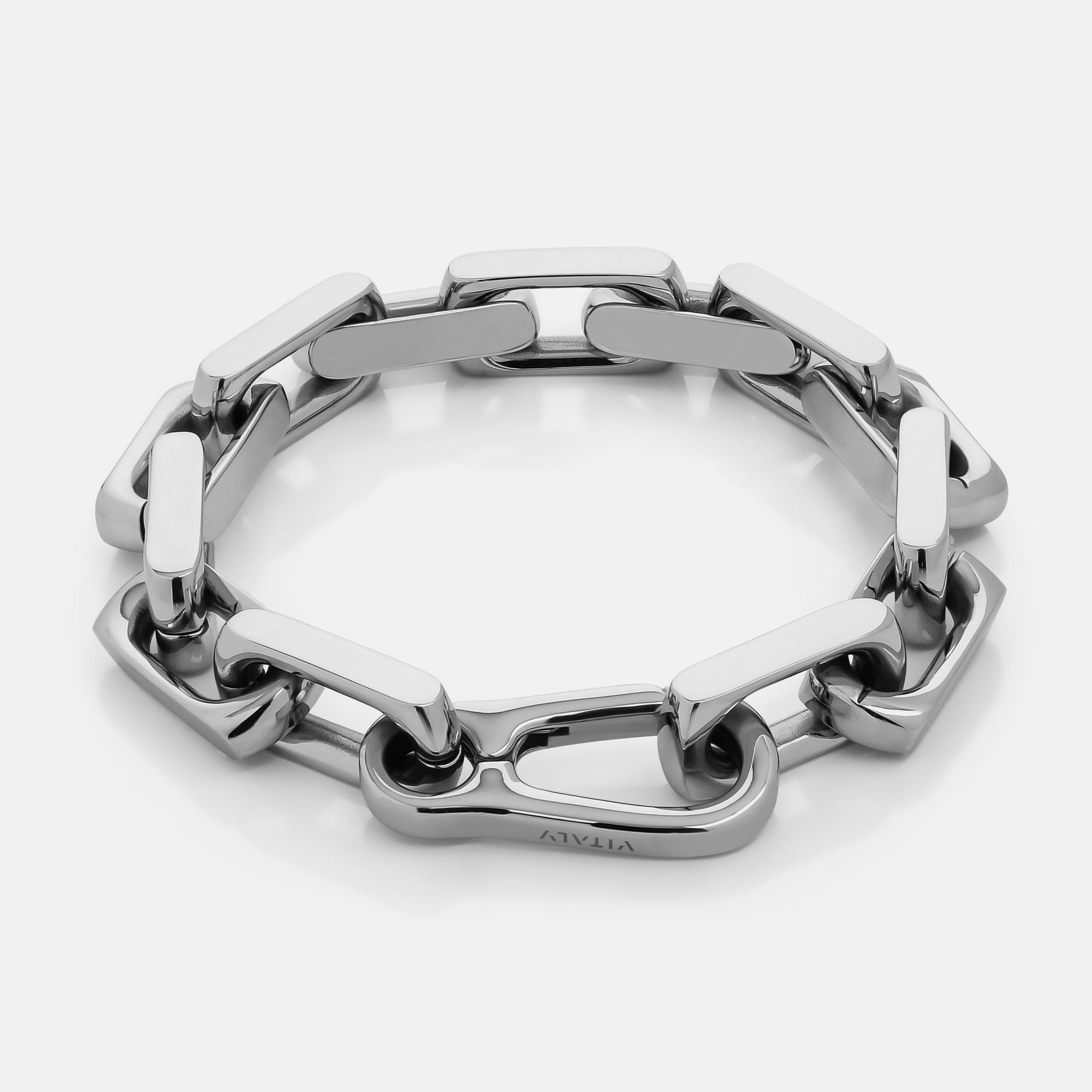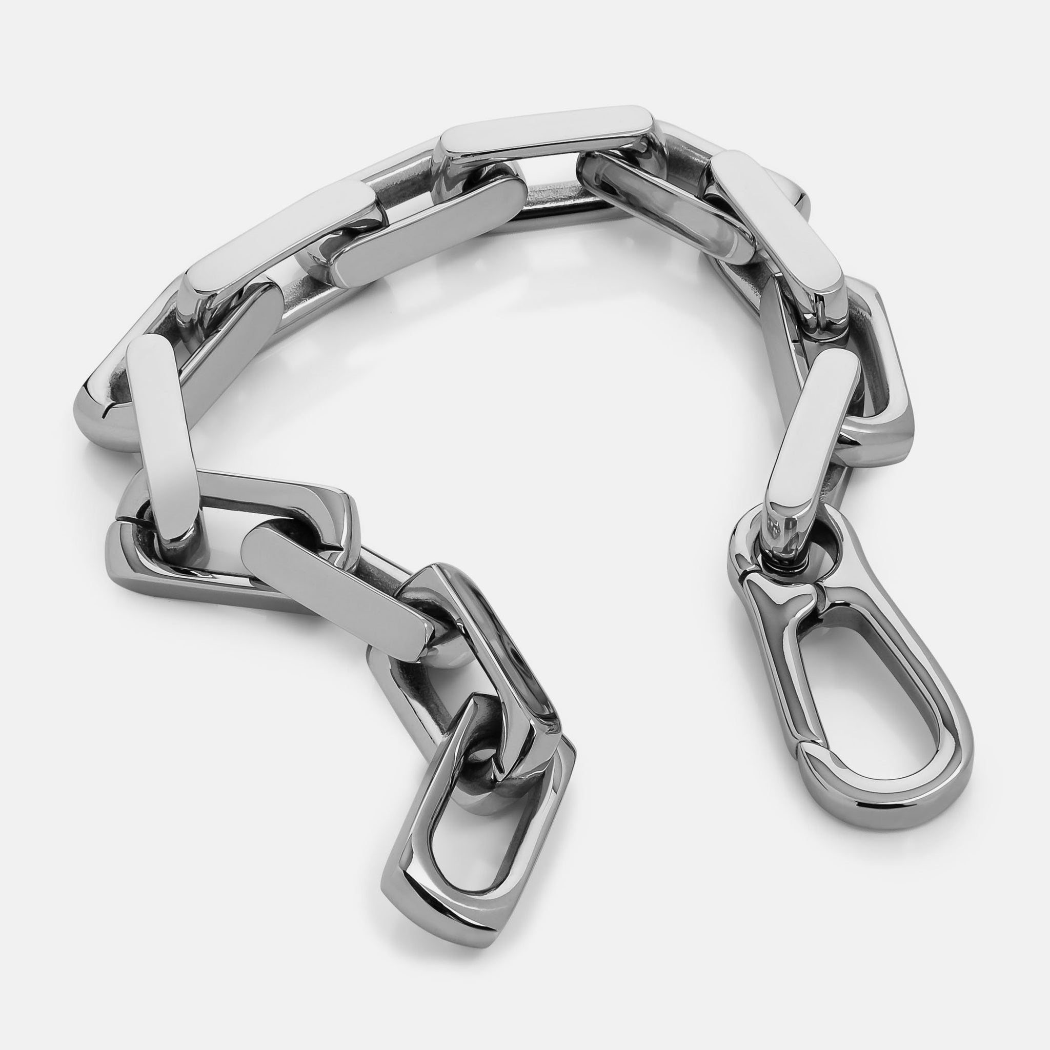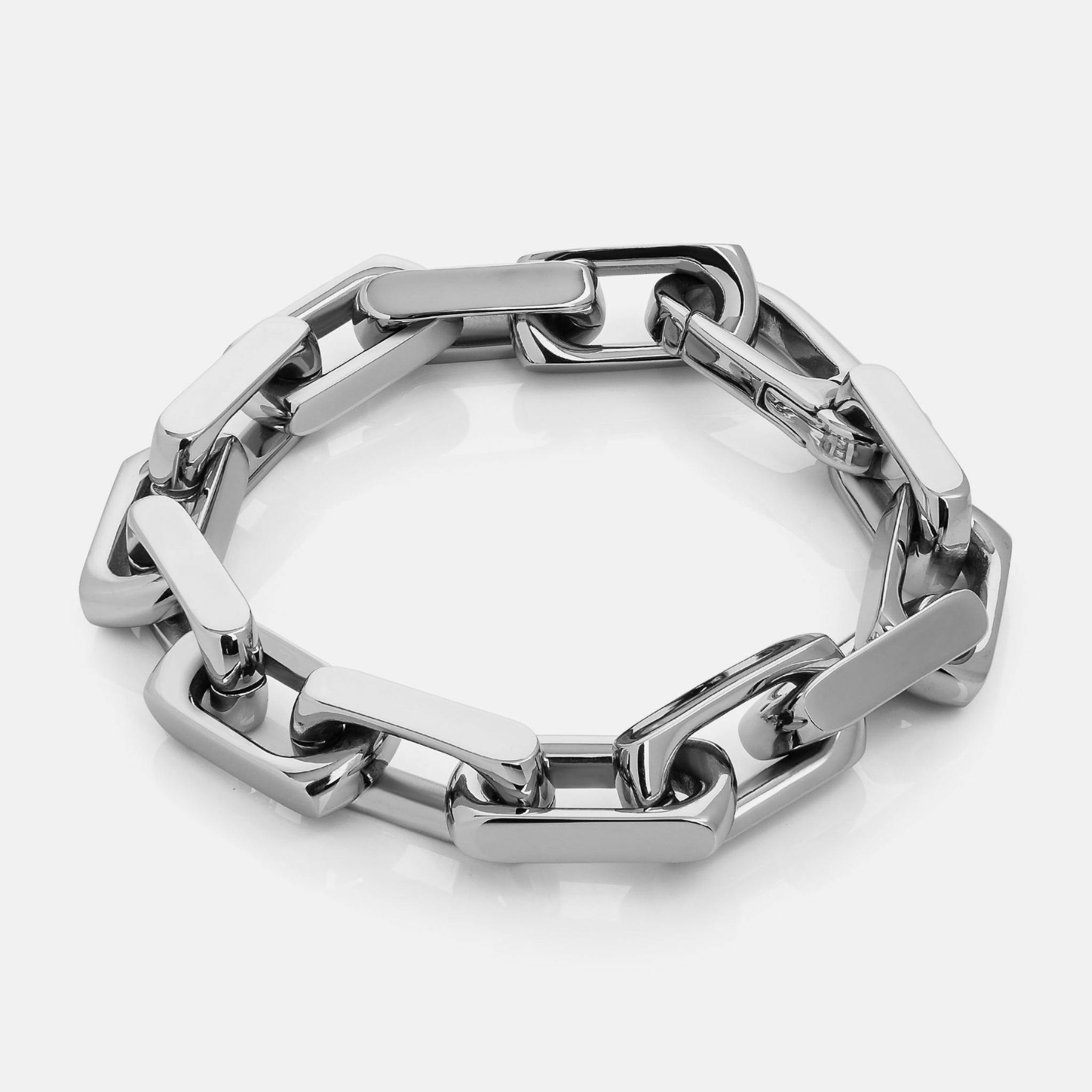 This bold, chunky bracelet features highly-polished squared-off links that snap shut with a low-profile carabiner.