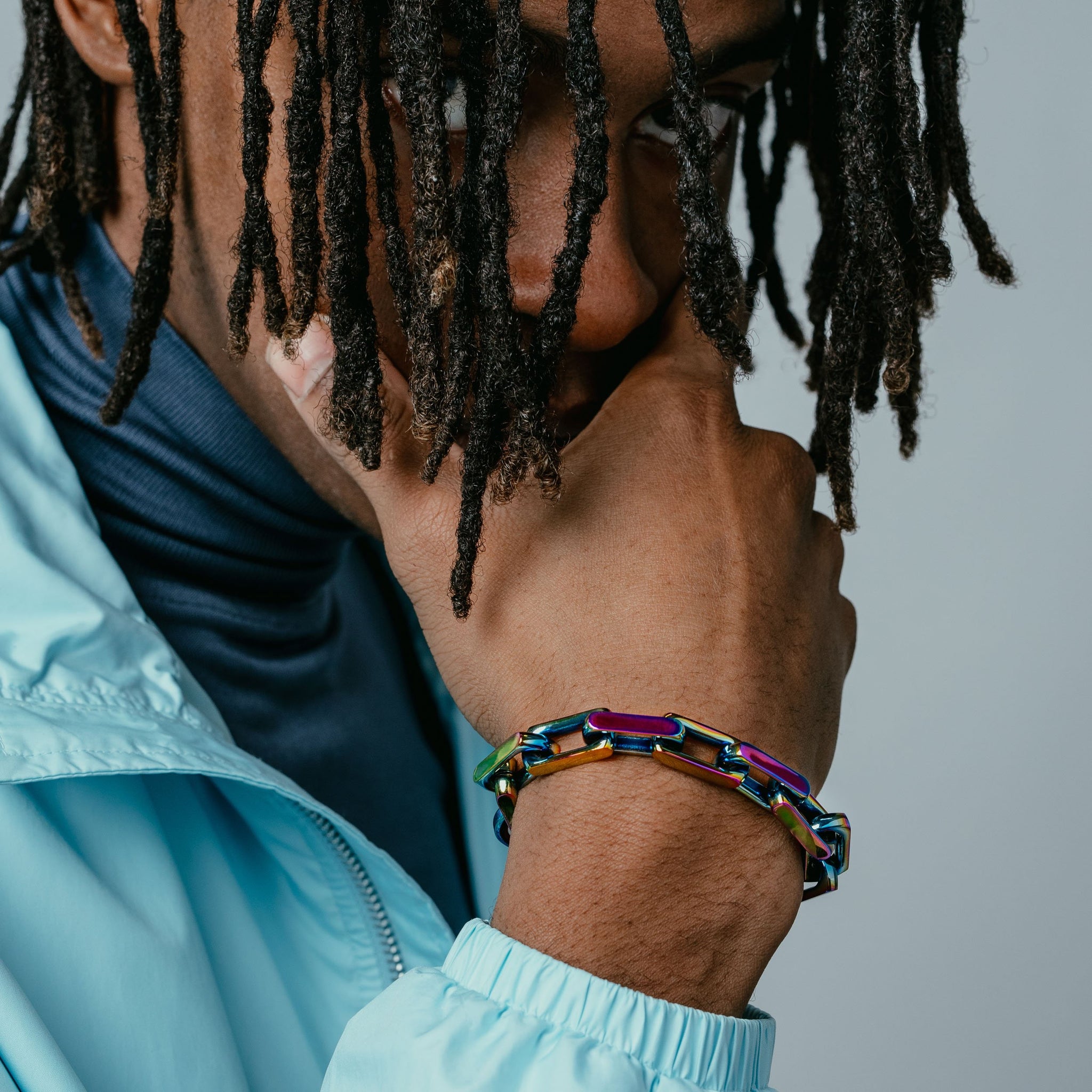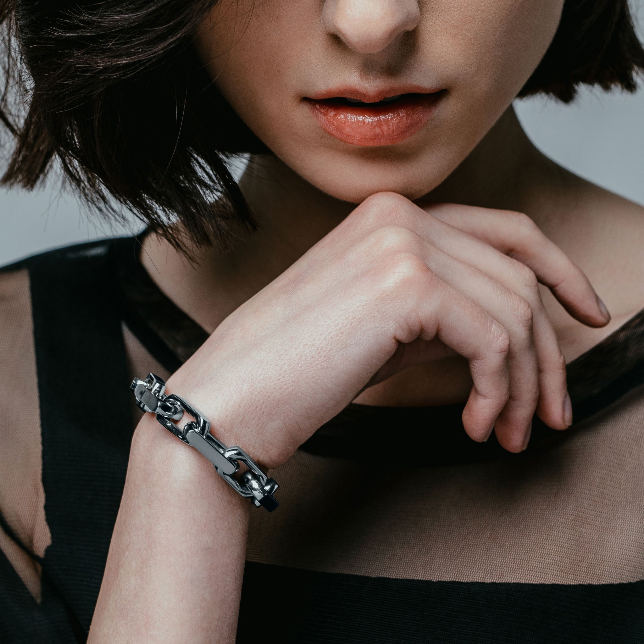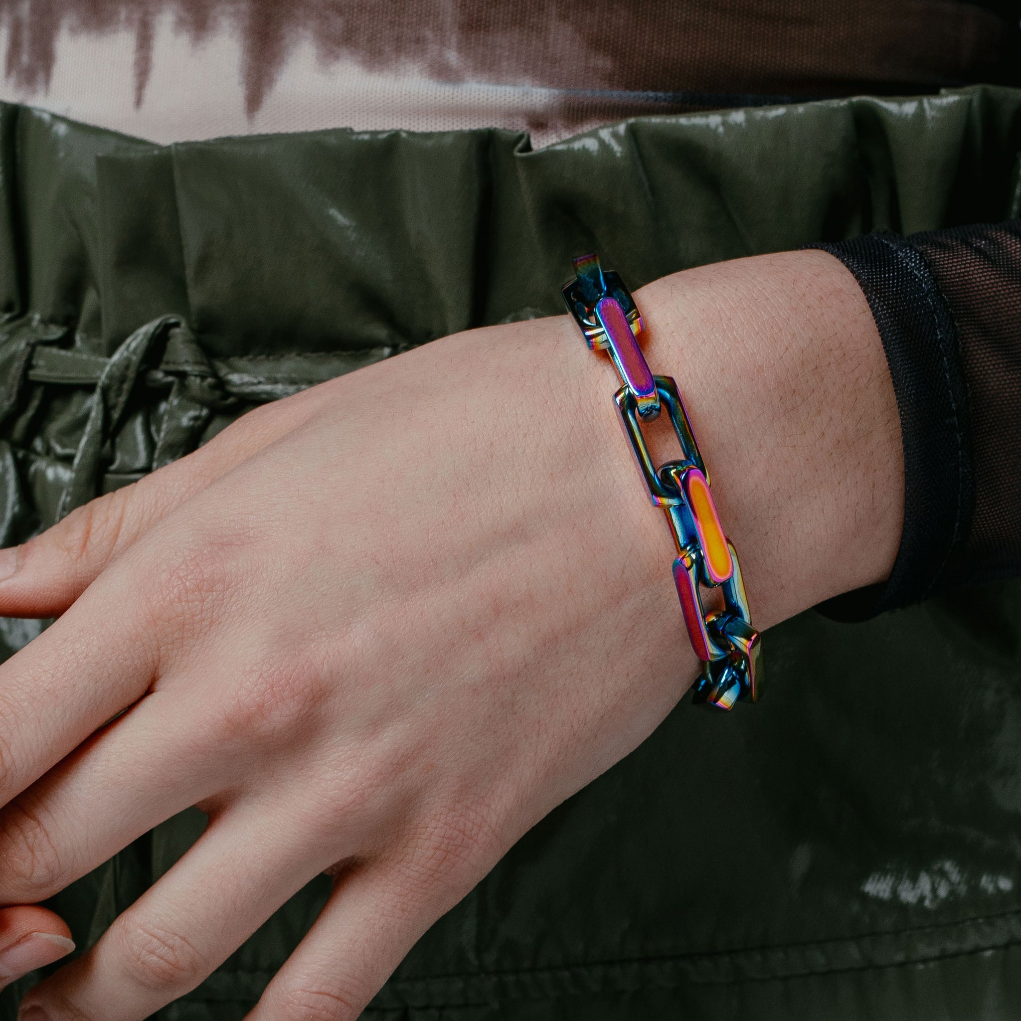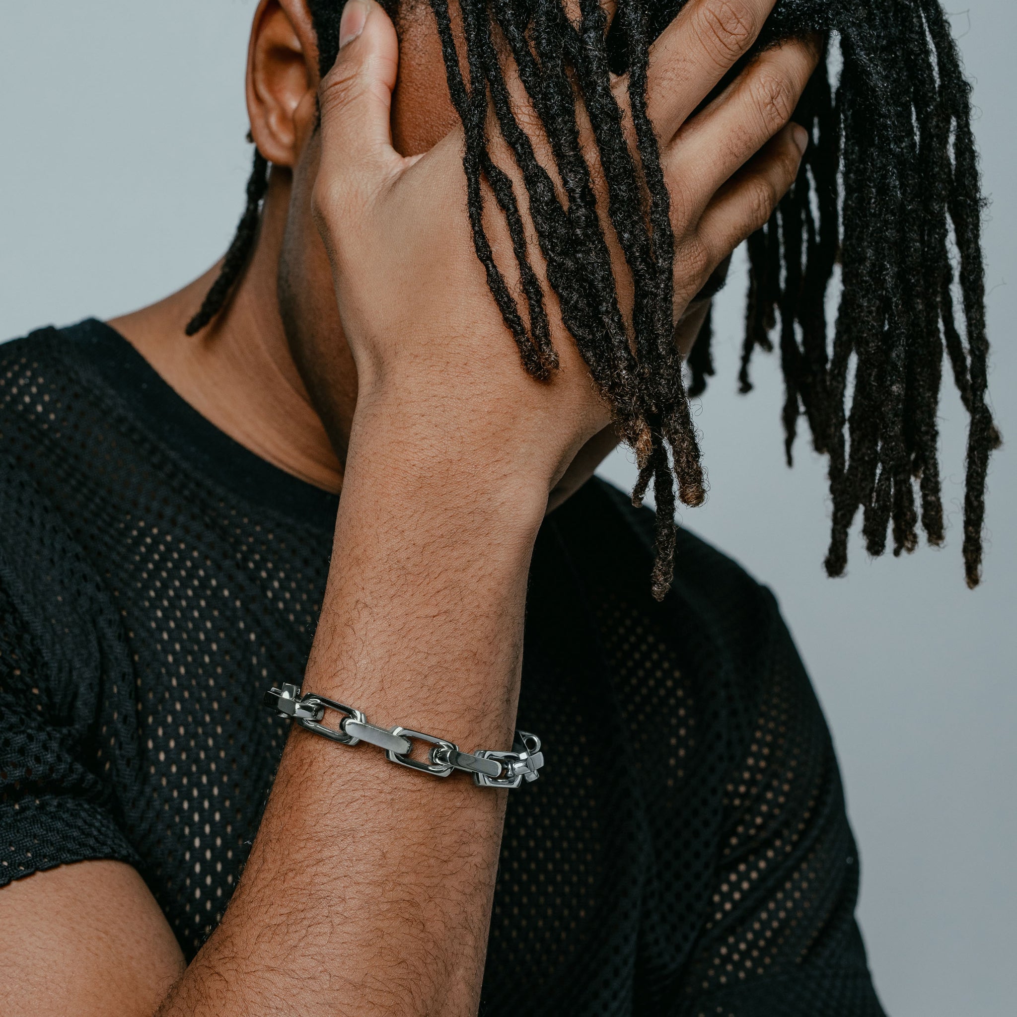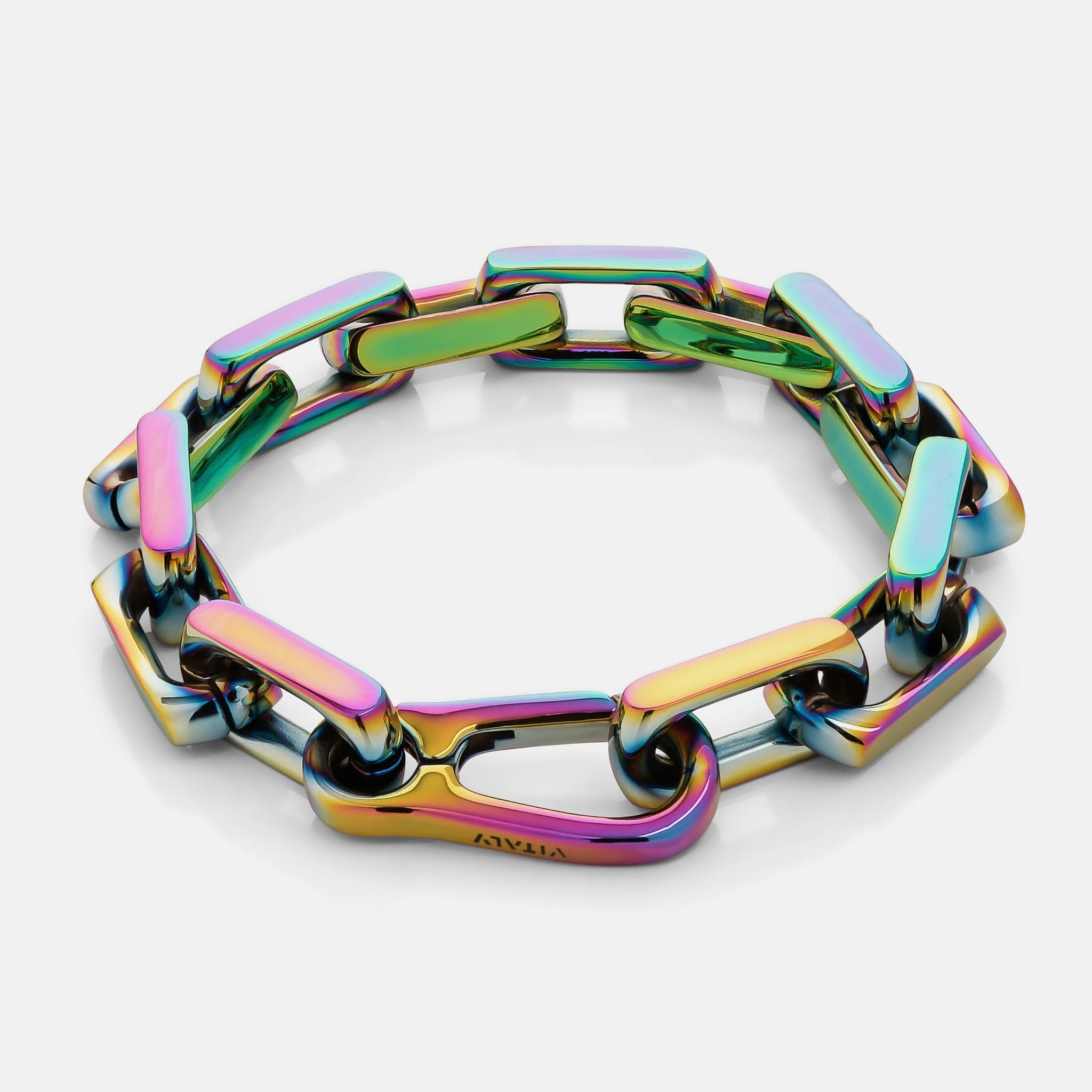 This bold, chunky bracelet features highly-polished squared-off links that snap shut with a low-profile carabiner.