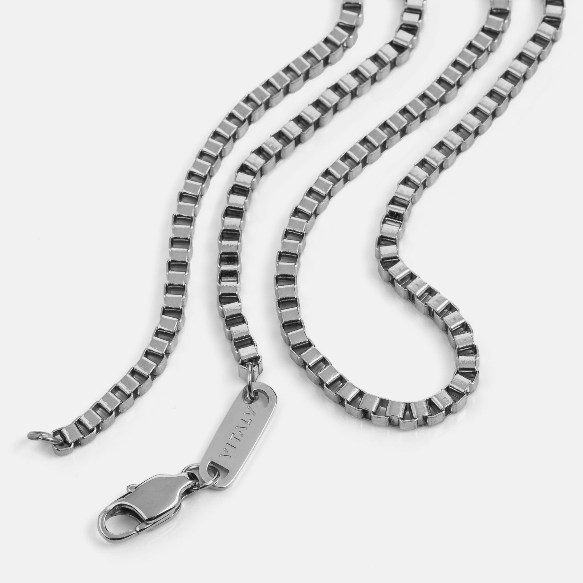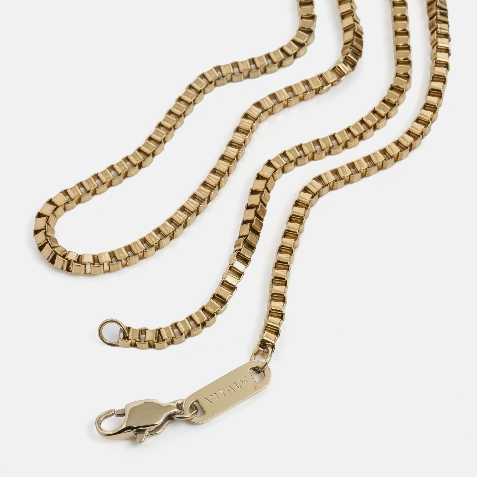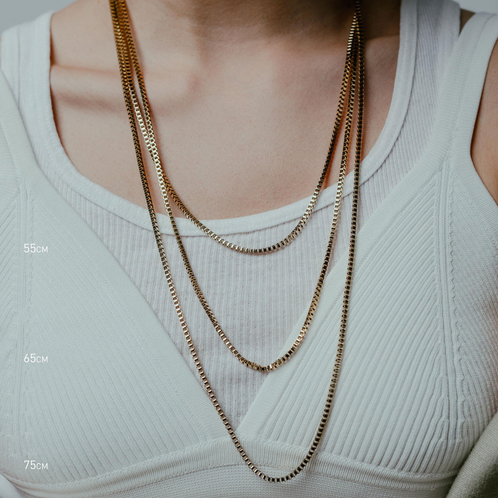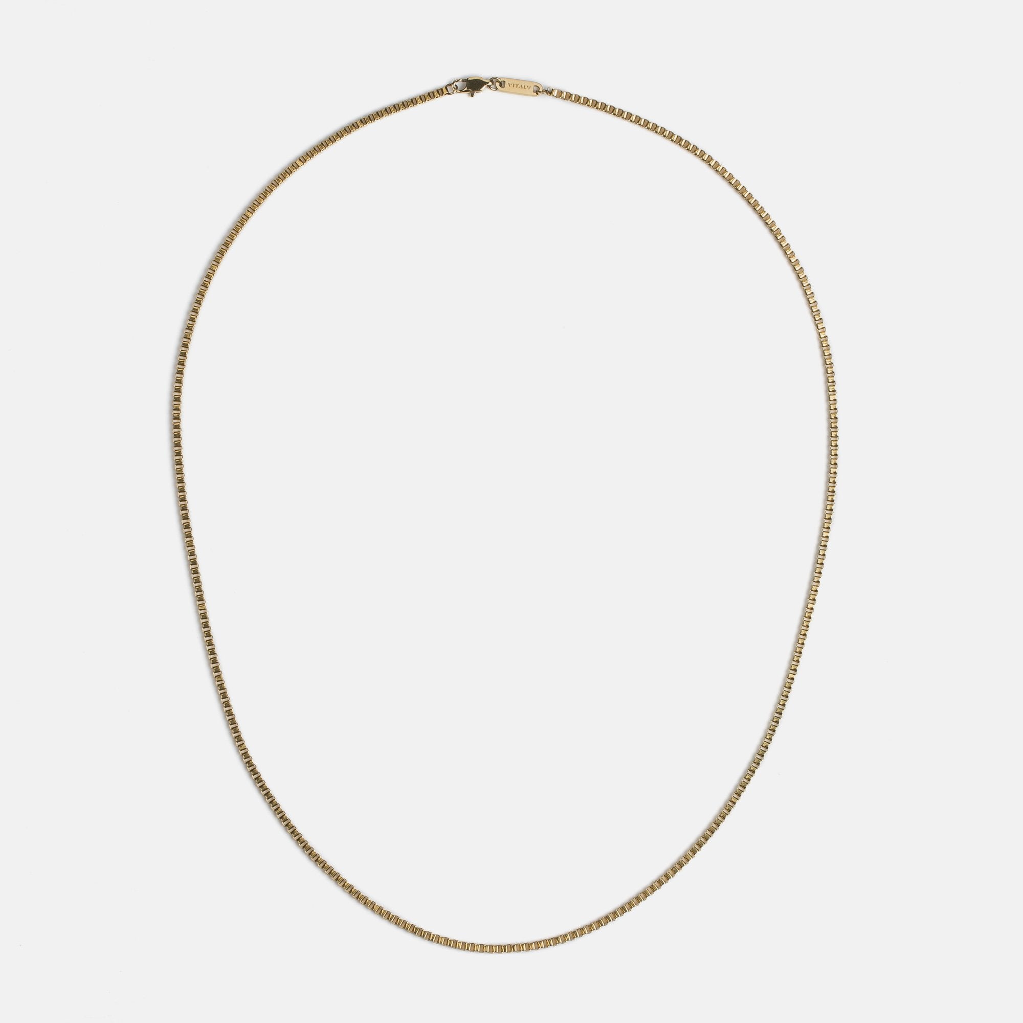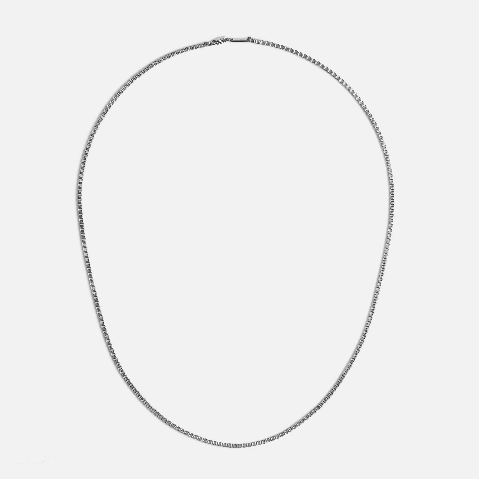 Single 55cm, 65cm or 75cm length square box chain. 2.4mm thick. Designed for layering.