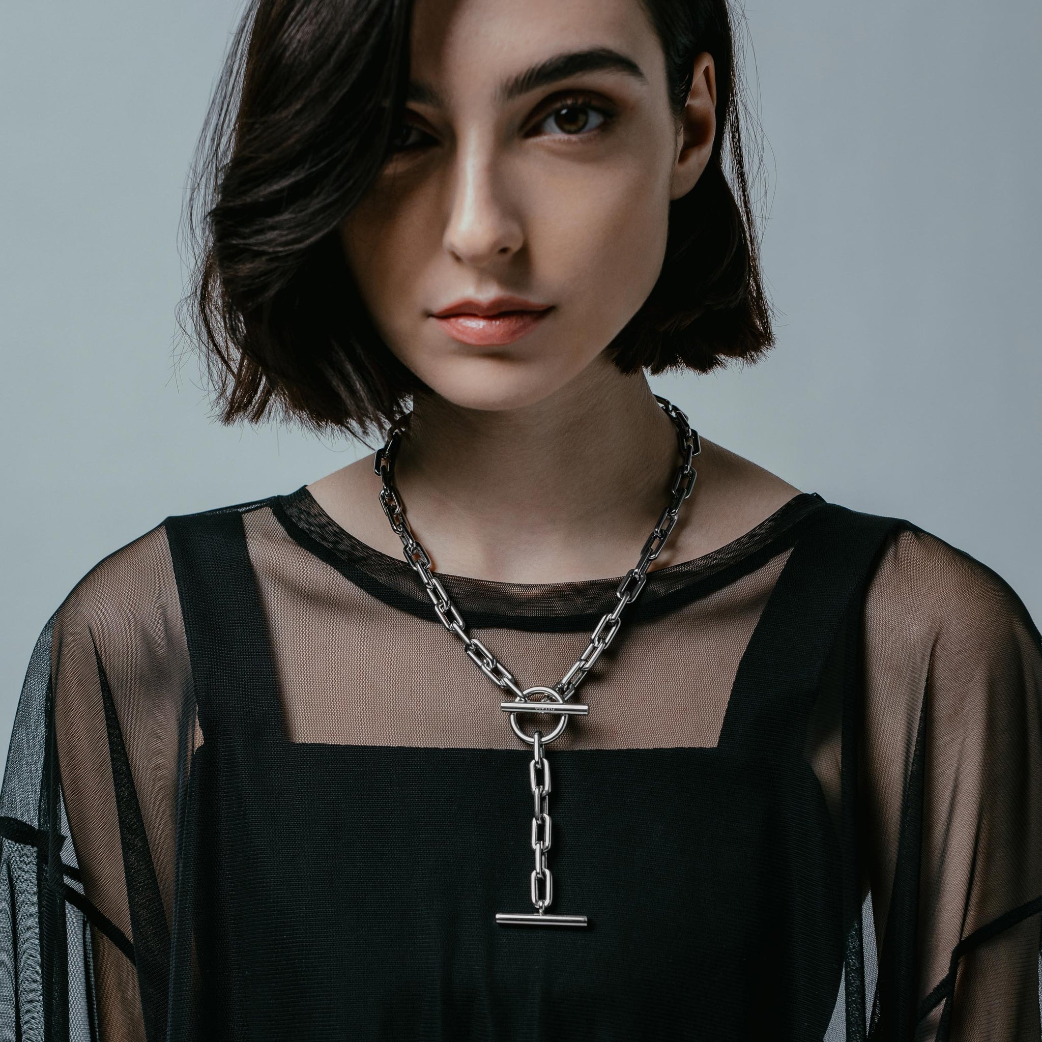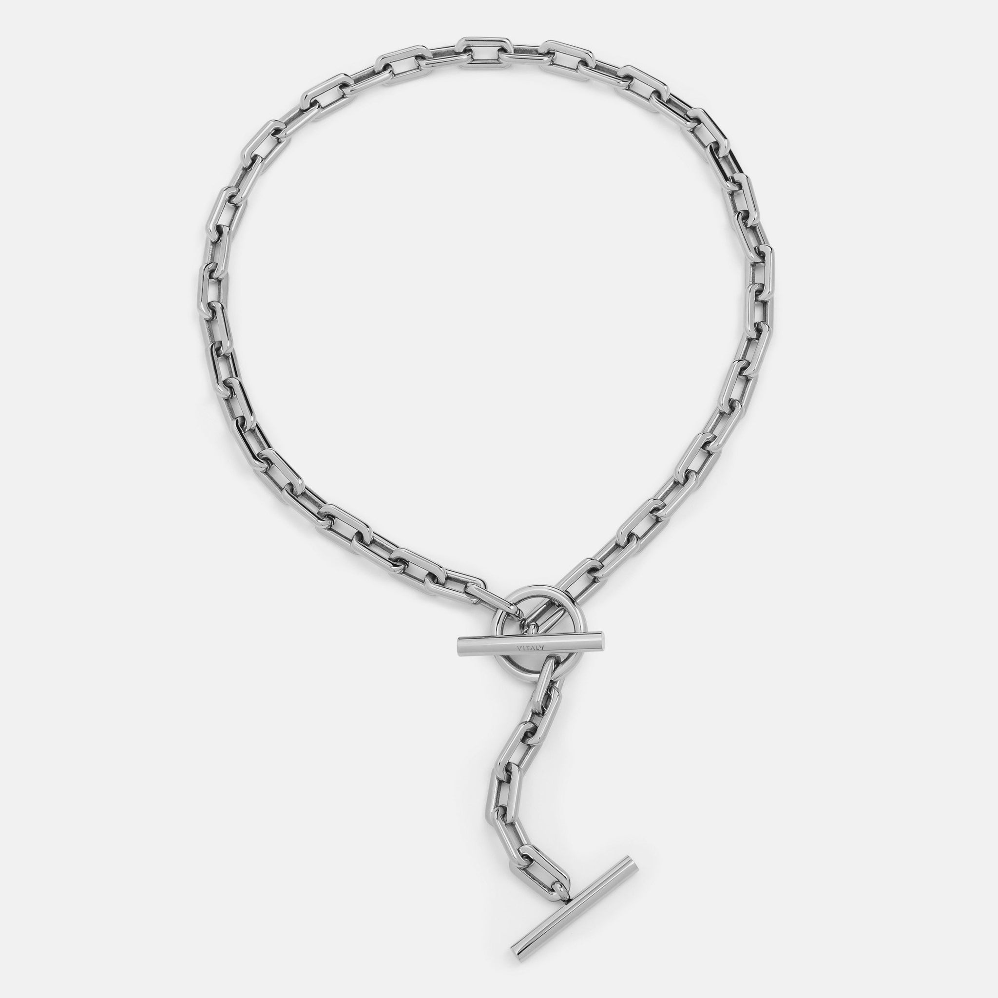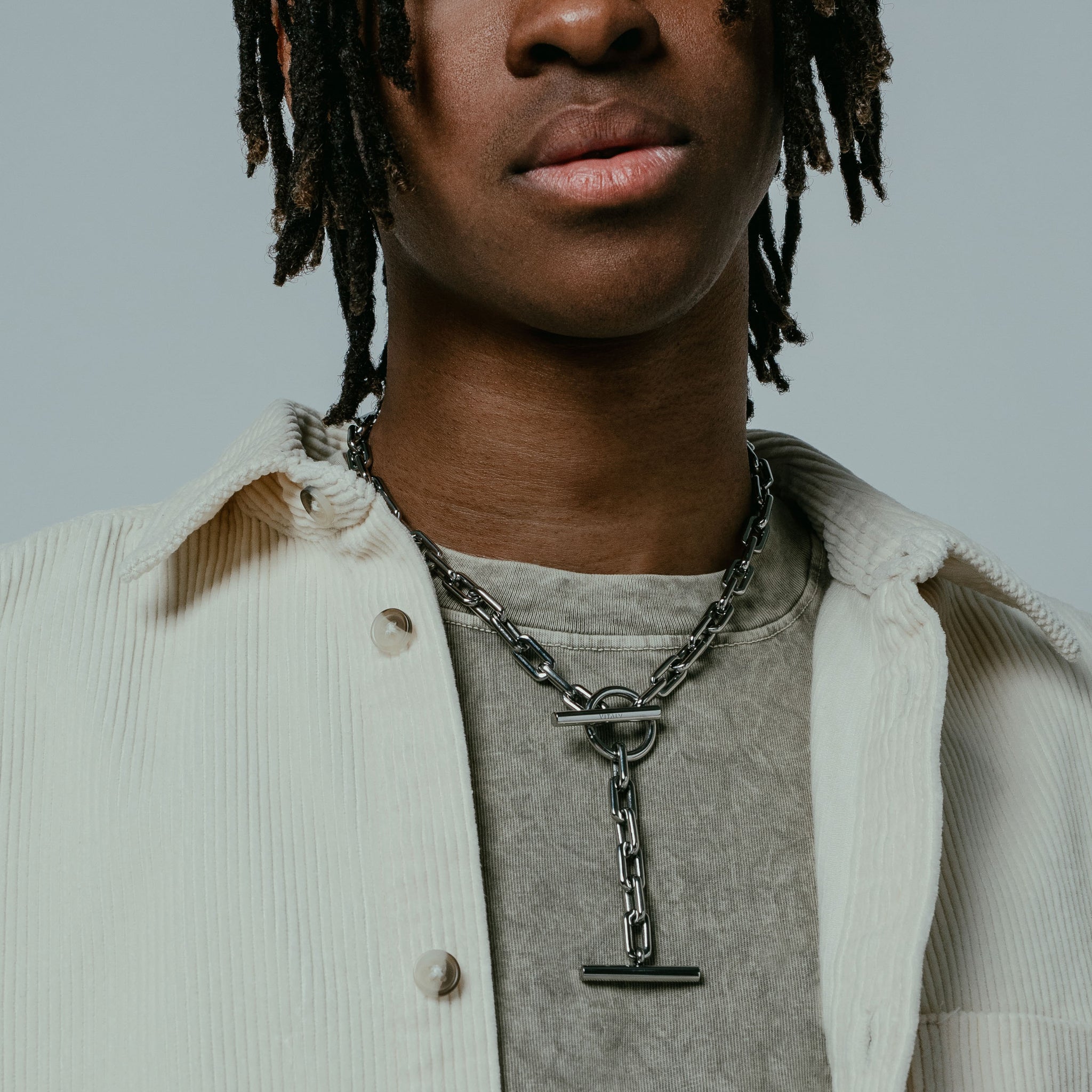 This heavy-duty chain clasps shut with an over-sized toggle and finishes with extra links that hold a polished bar detail.