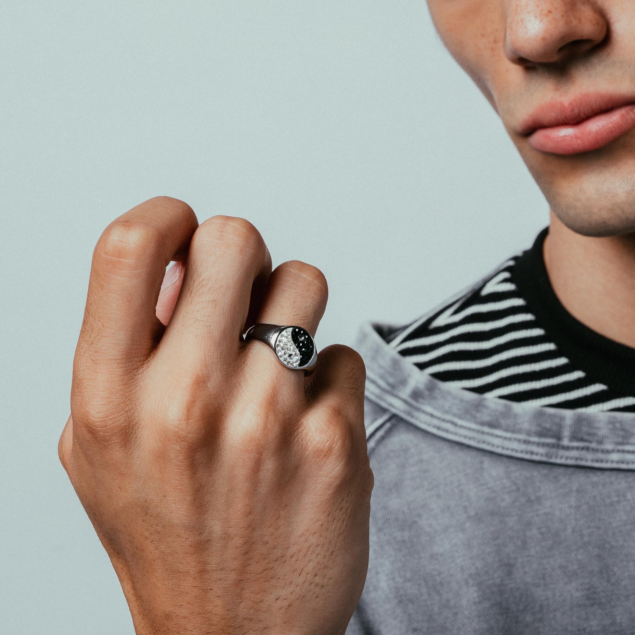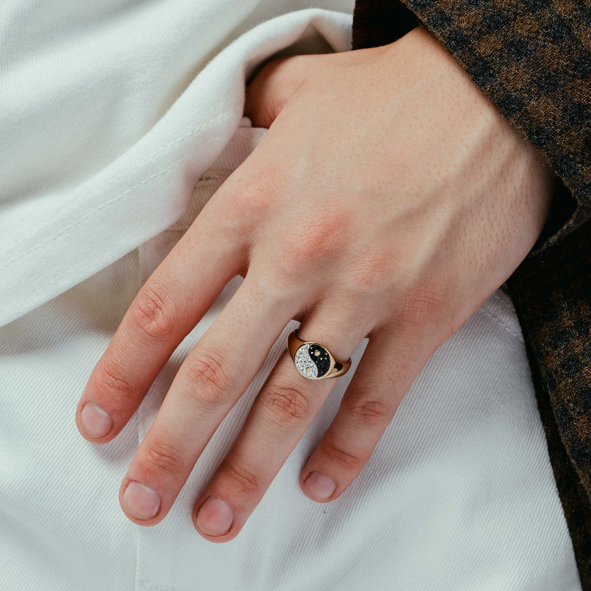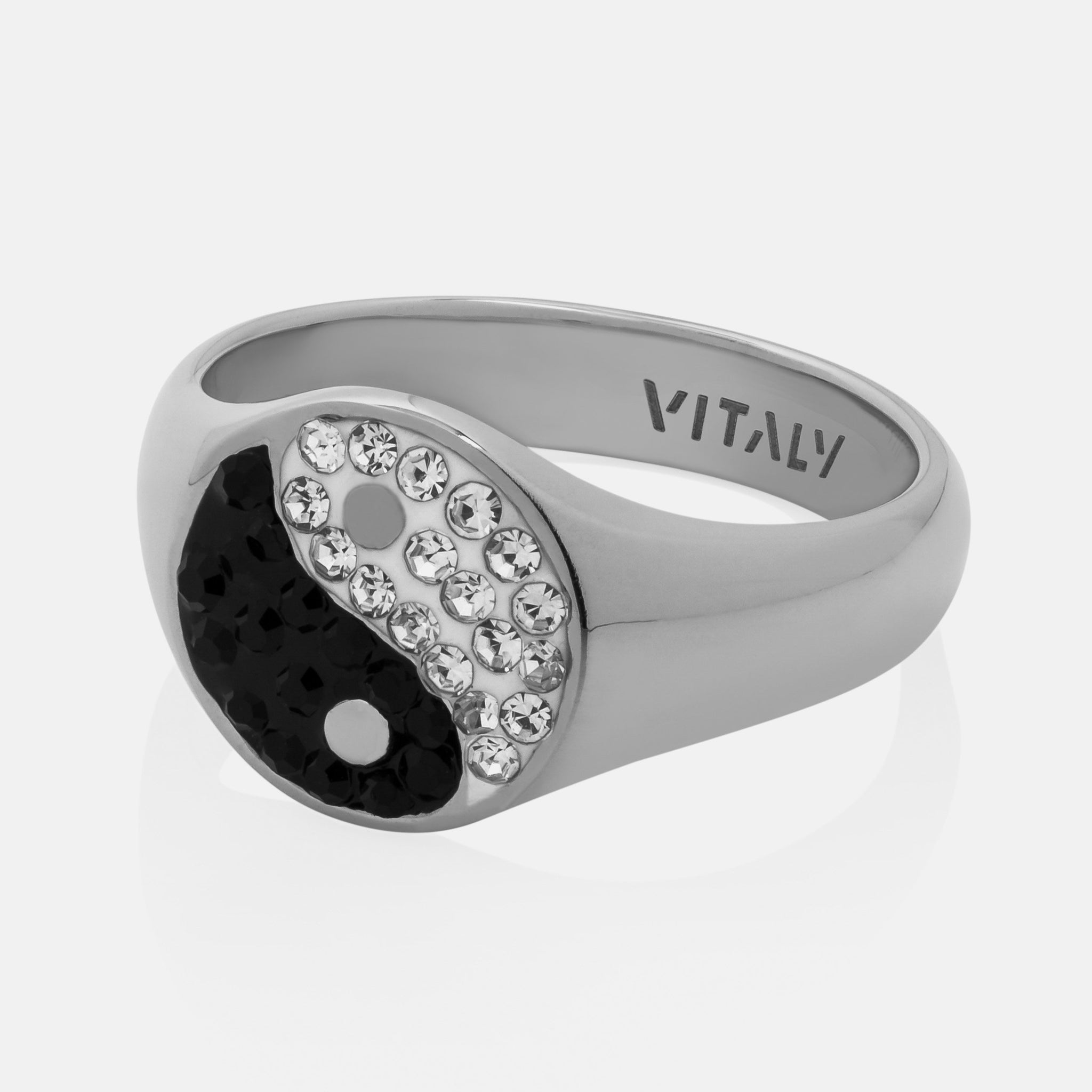 The Dualist features a yin yang design composed of black and white glass crystals. Each crystal is inset on an enamel coating.