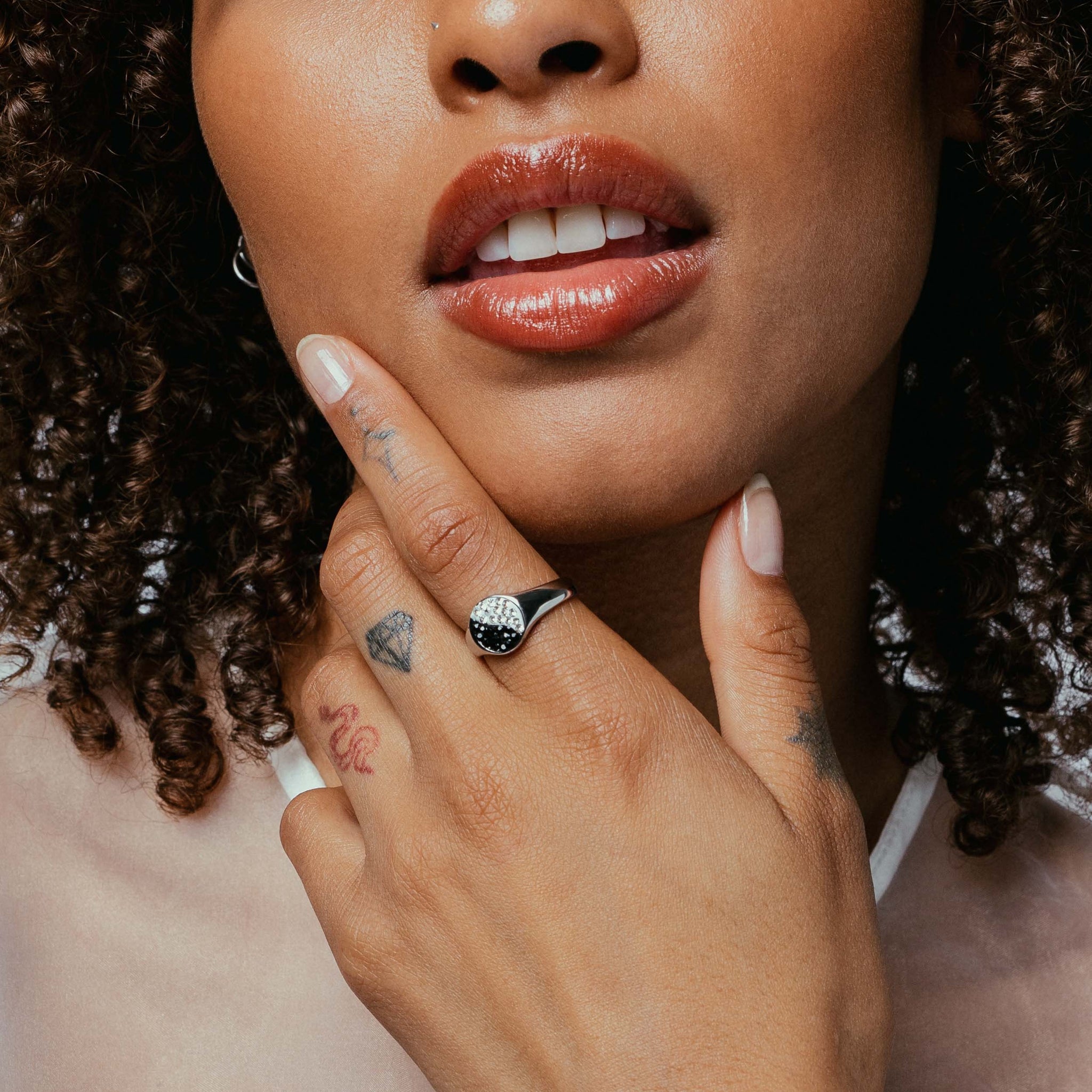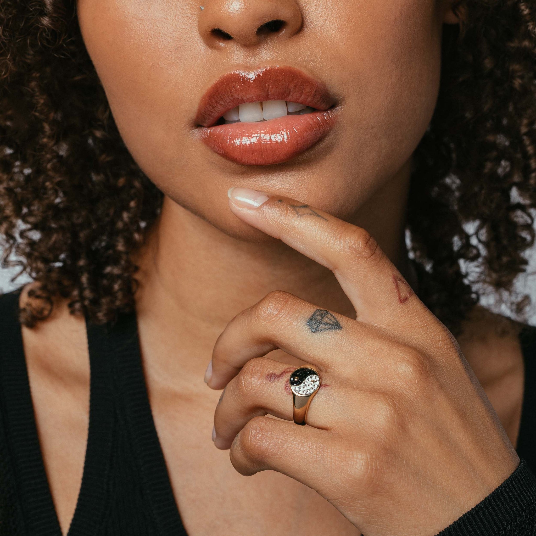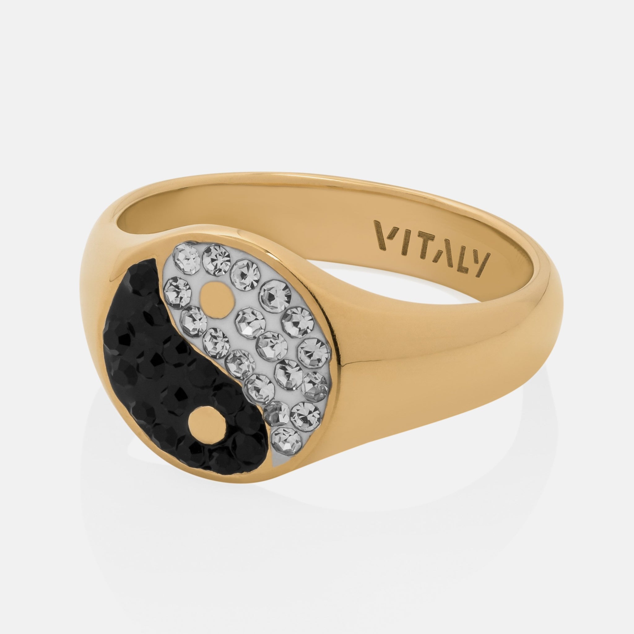 The Dualist features a yin yang design composed of black and white glass crystals. Each crystal is inset on an enamel coating.