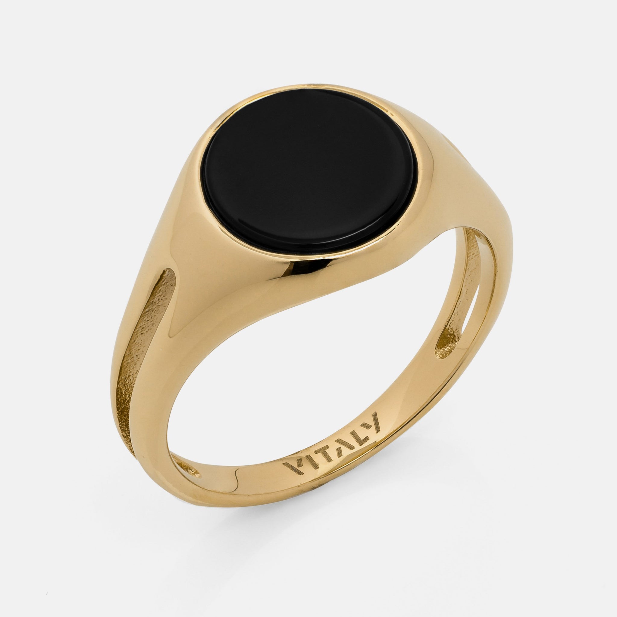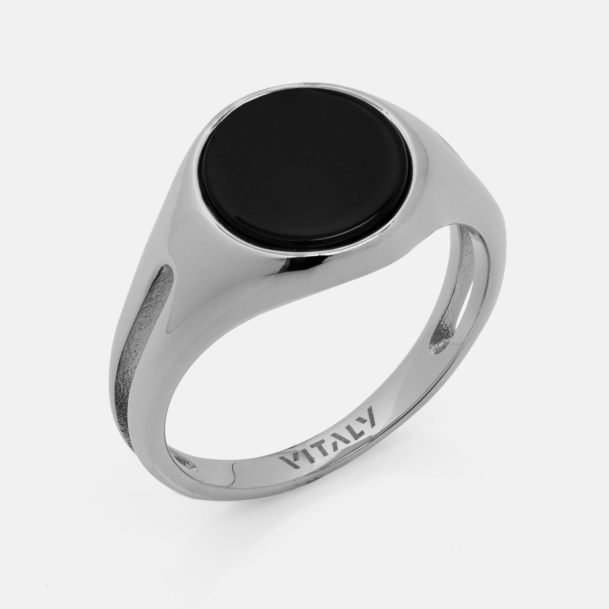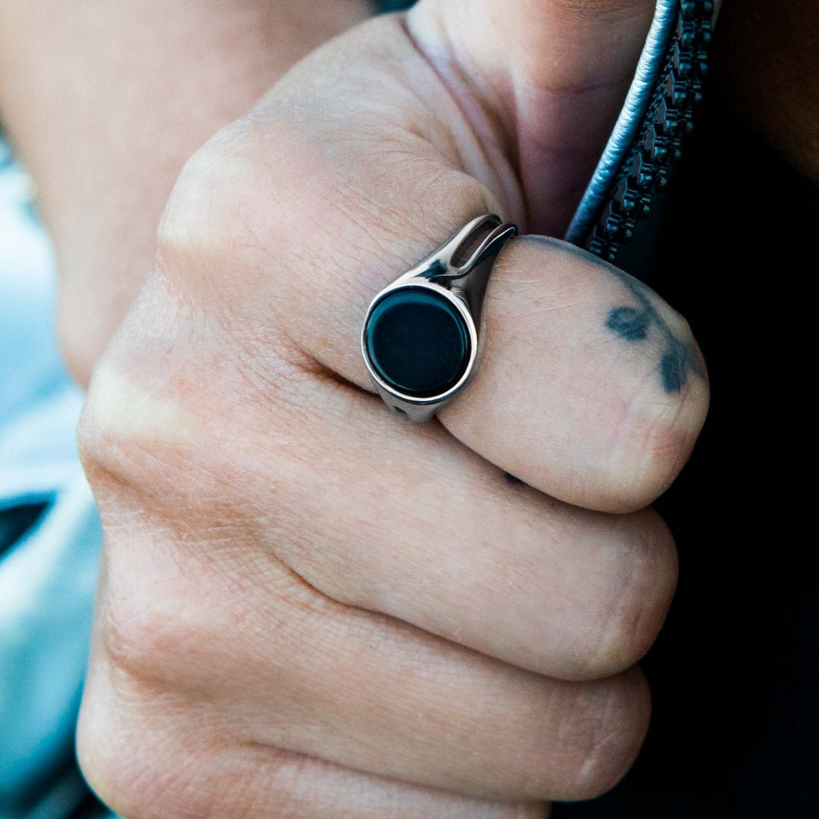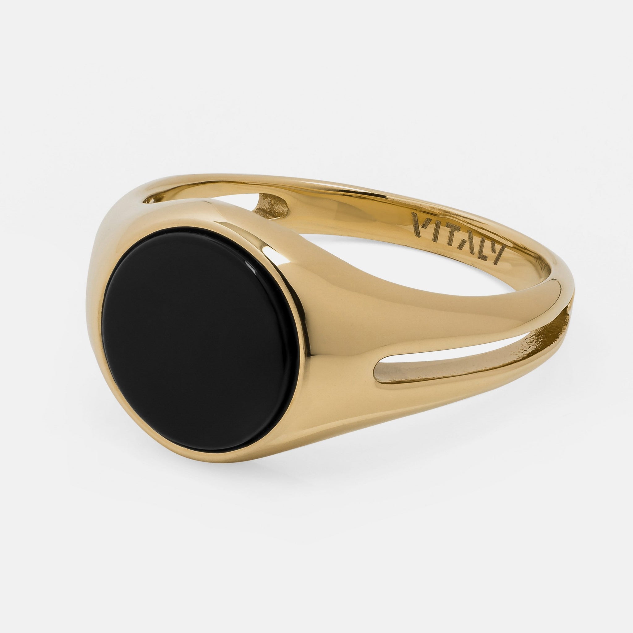 This circular signet ring features a polished black onyx stone and technical cutaways on each side for a streamlined effect.