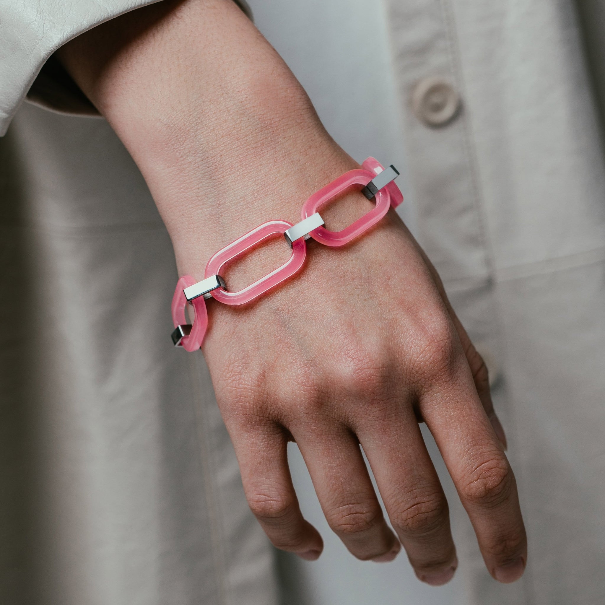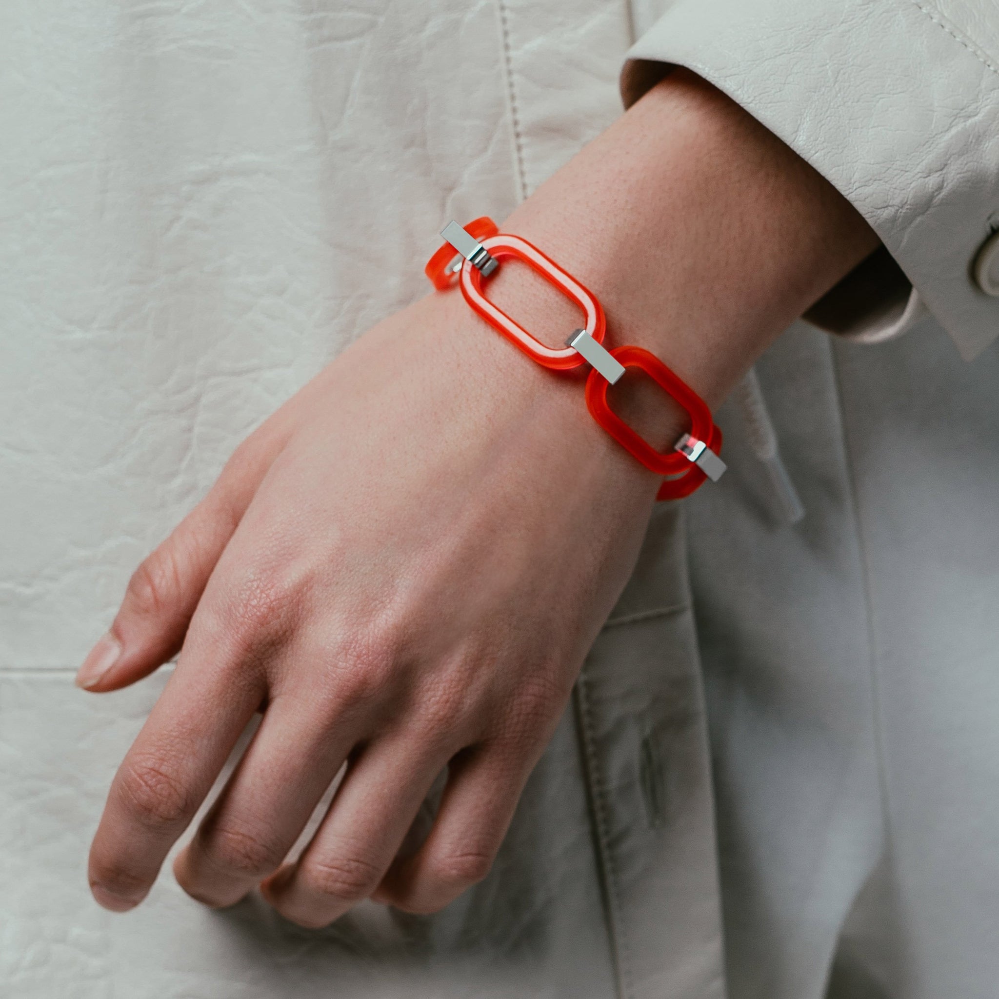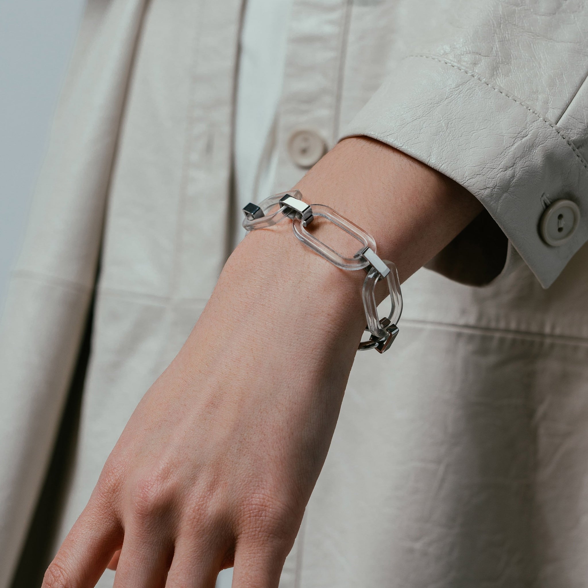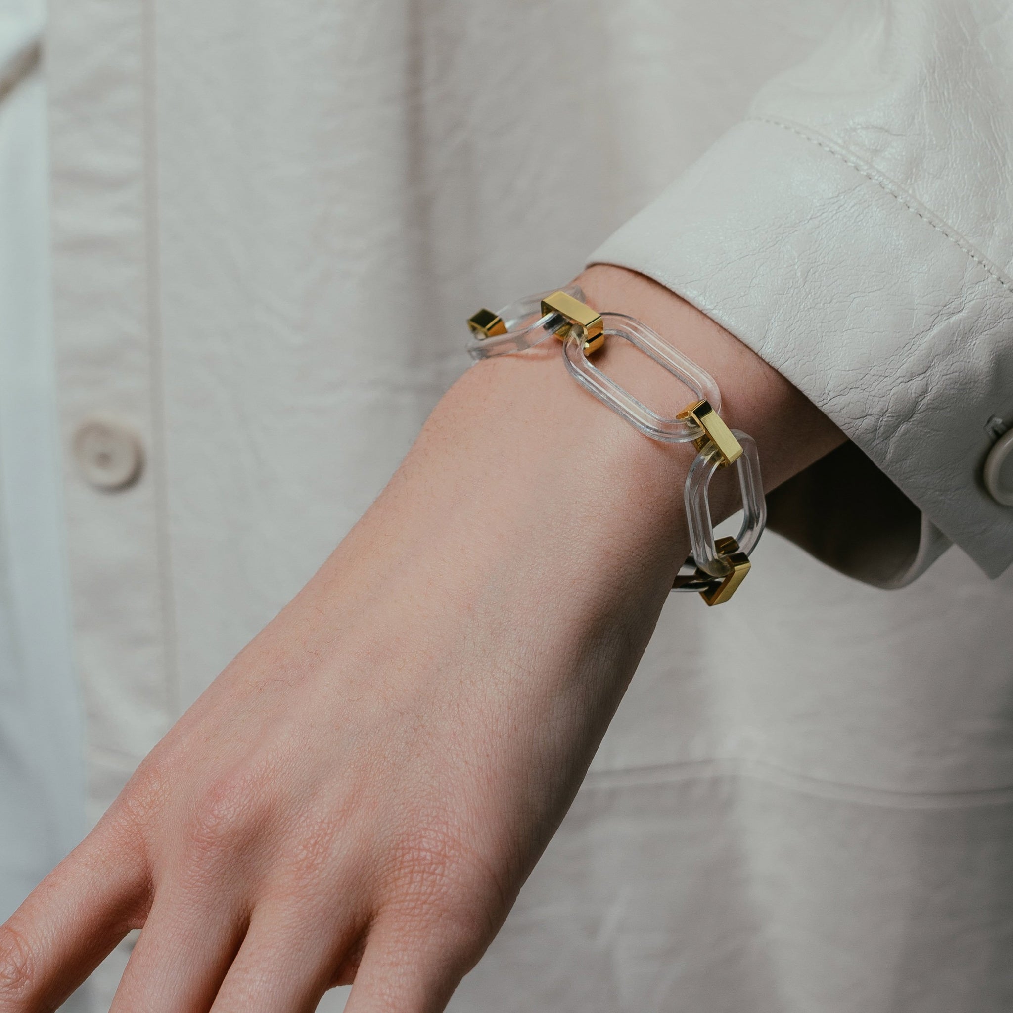 The Gamma features either clear or semi-translucent coloured acrylic links, joined by stainless steel brackets and an oversized, laser-engraved clasp.