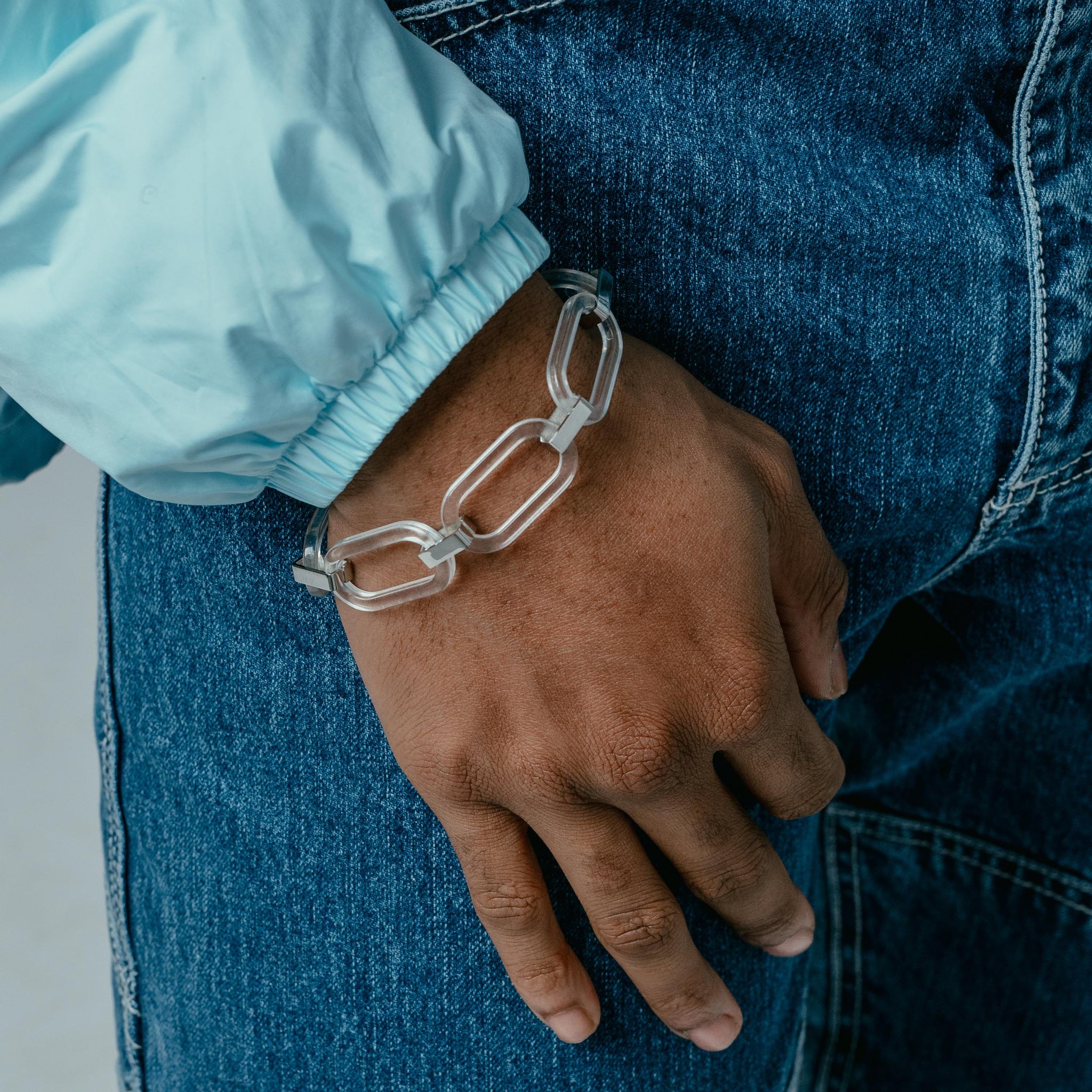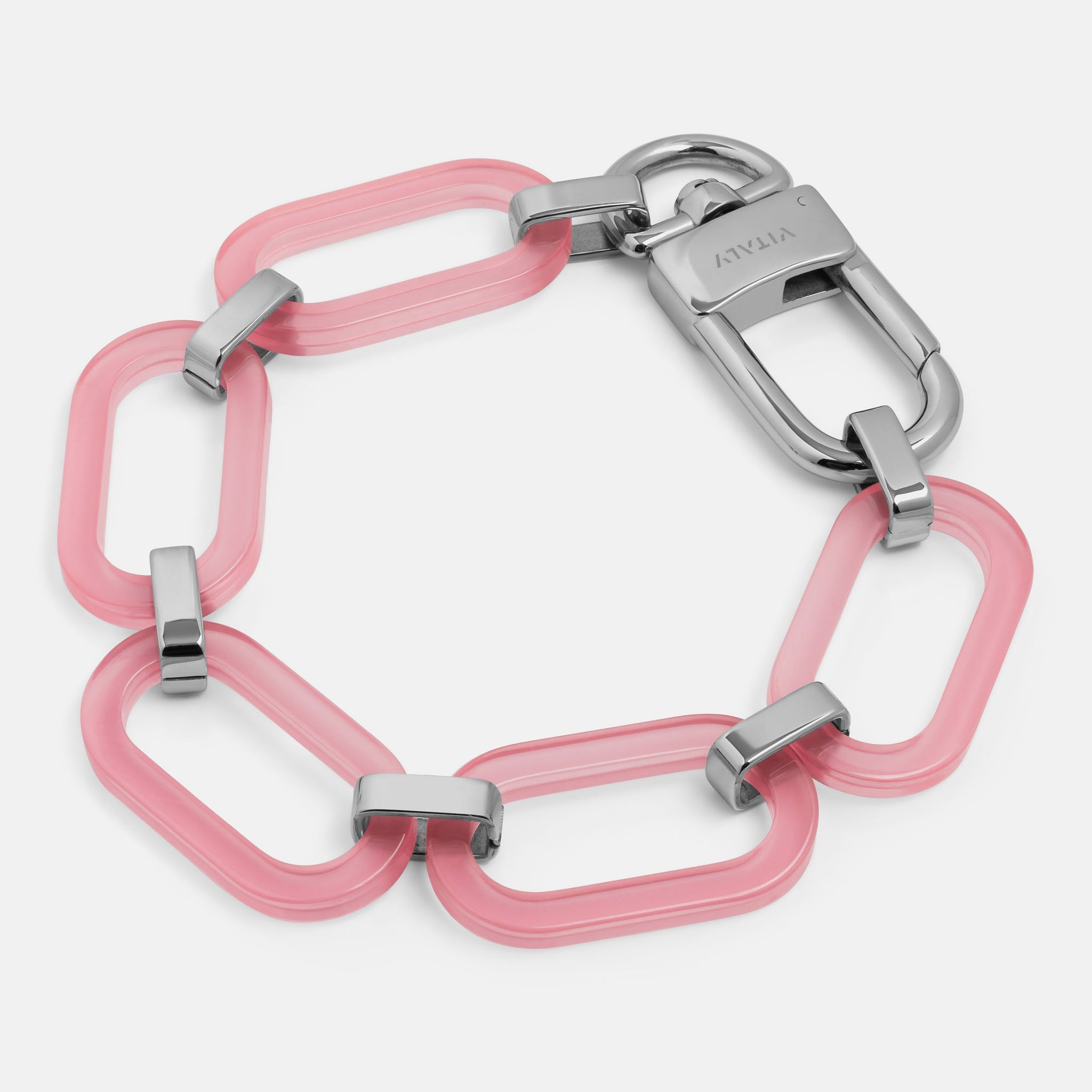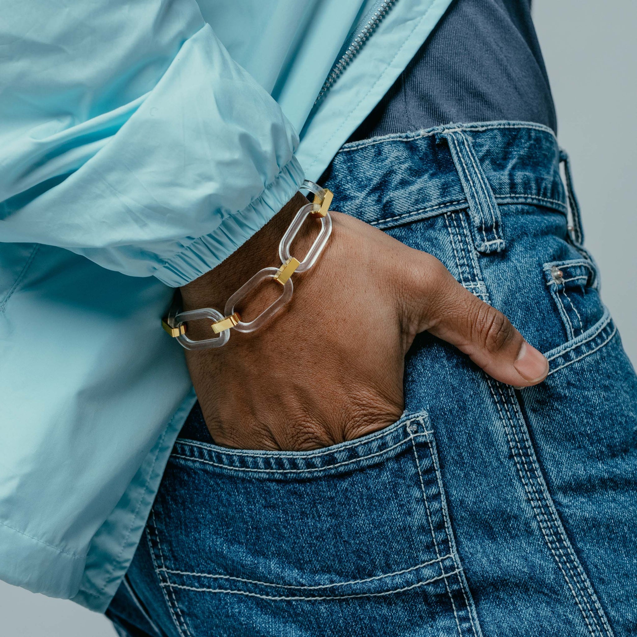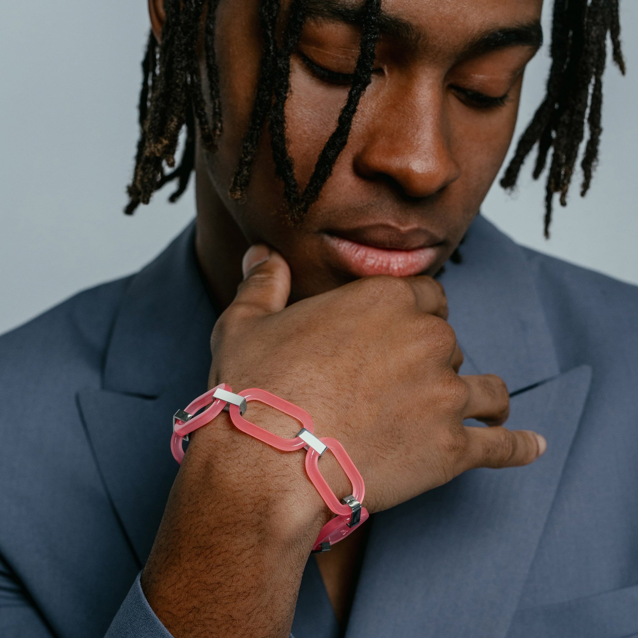 The Gamma features either clear or semi-translucent coloured acrylic links, joined by stainless steel brackets and an oversized, laser-engraved clasp.