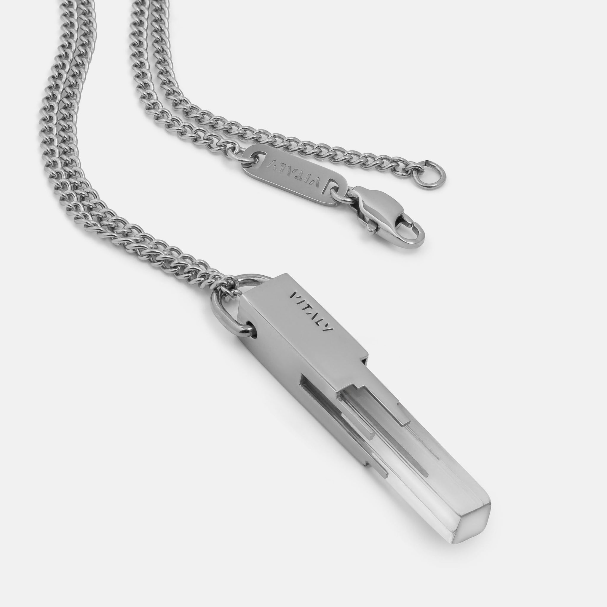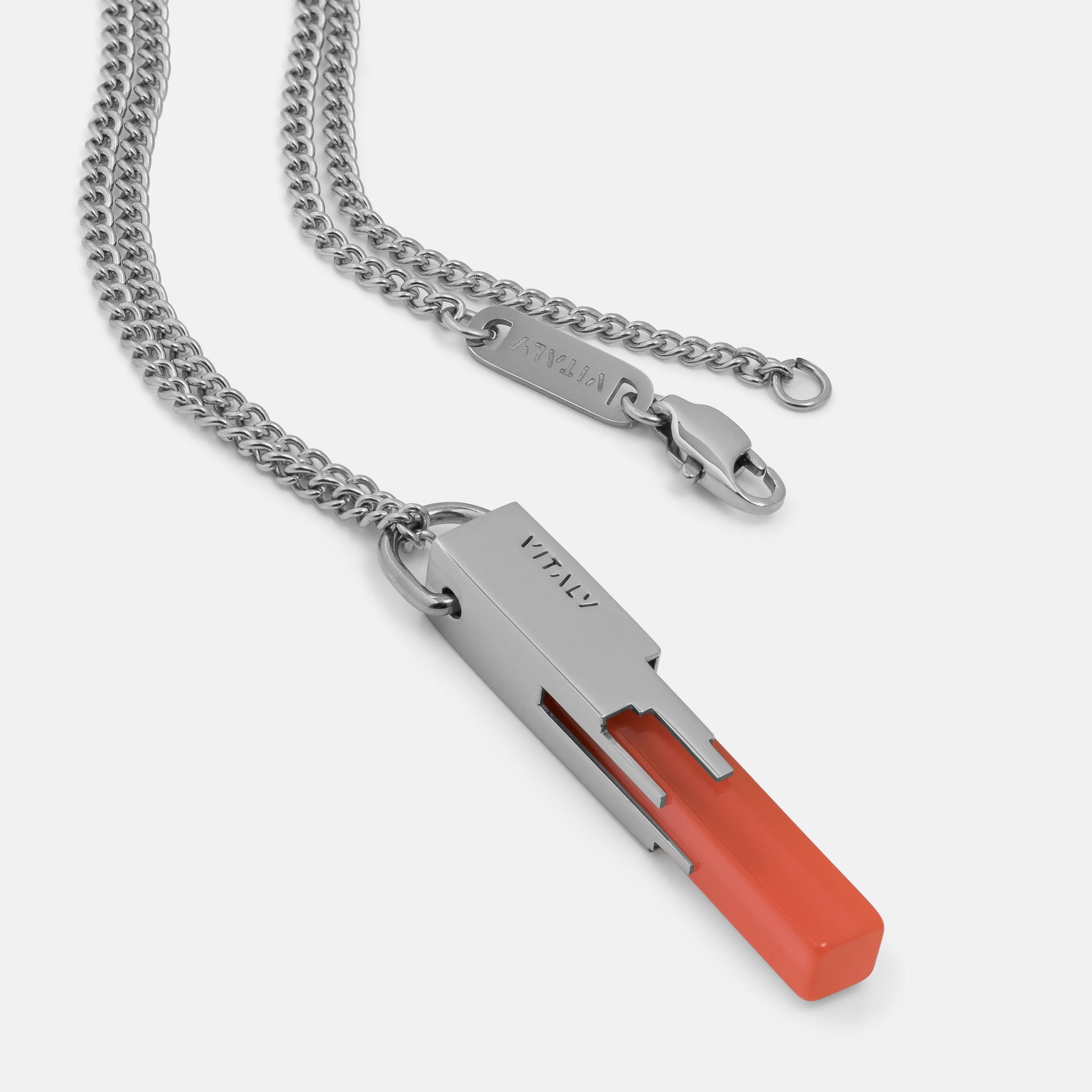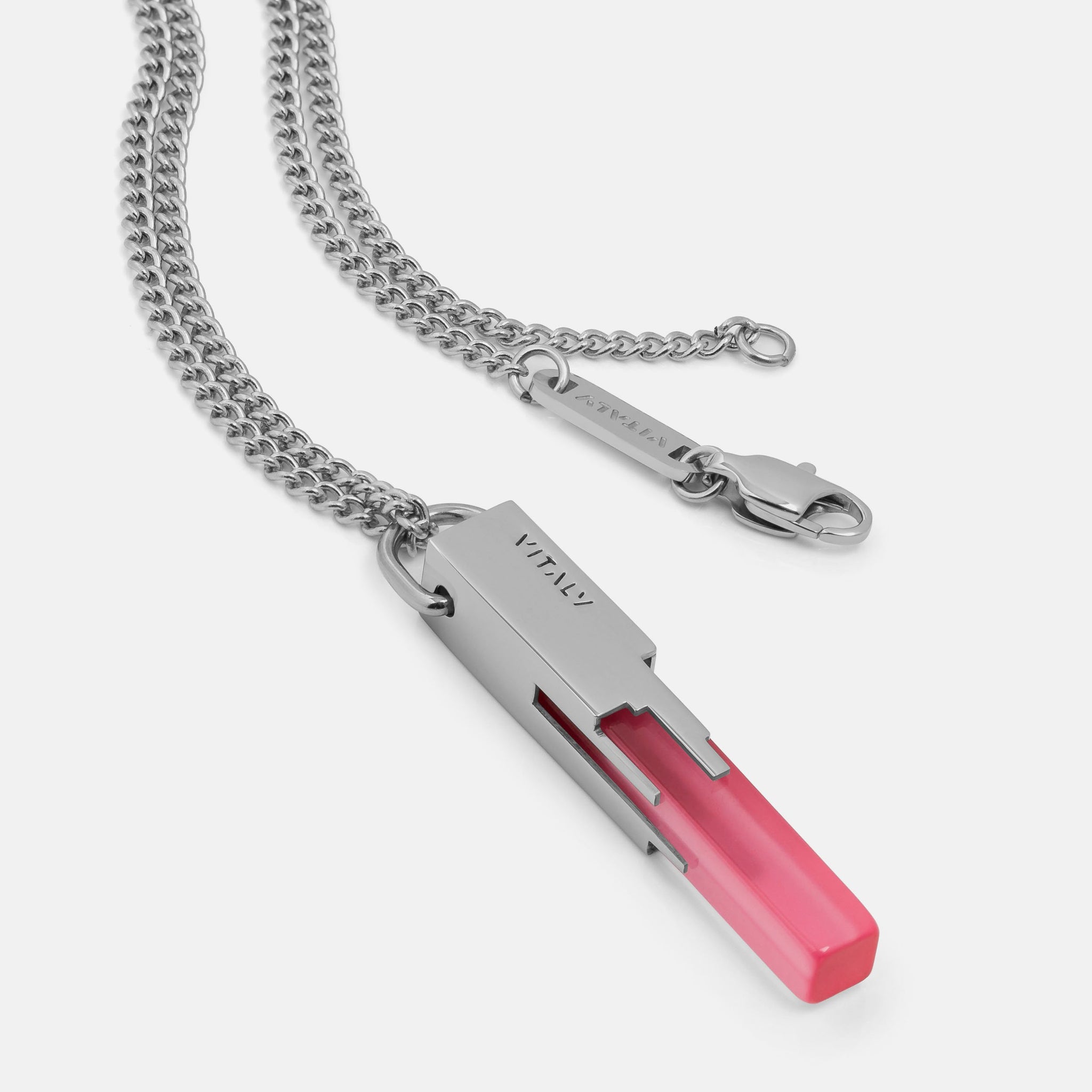 Materials: Stainless Steel, Acrylic. Comes on a 65cm (26") curb chain.