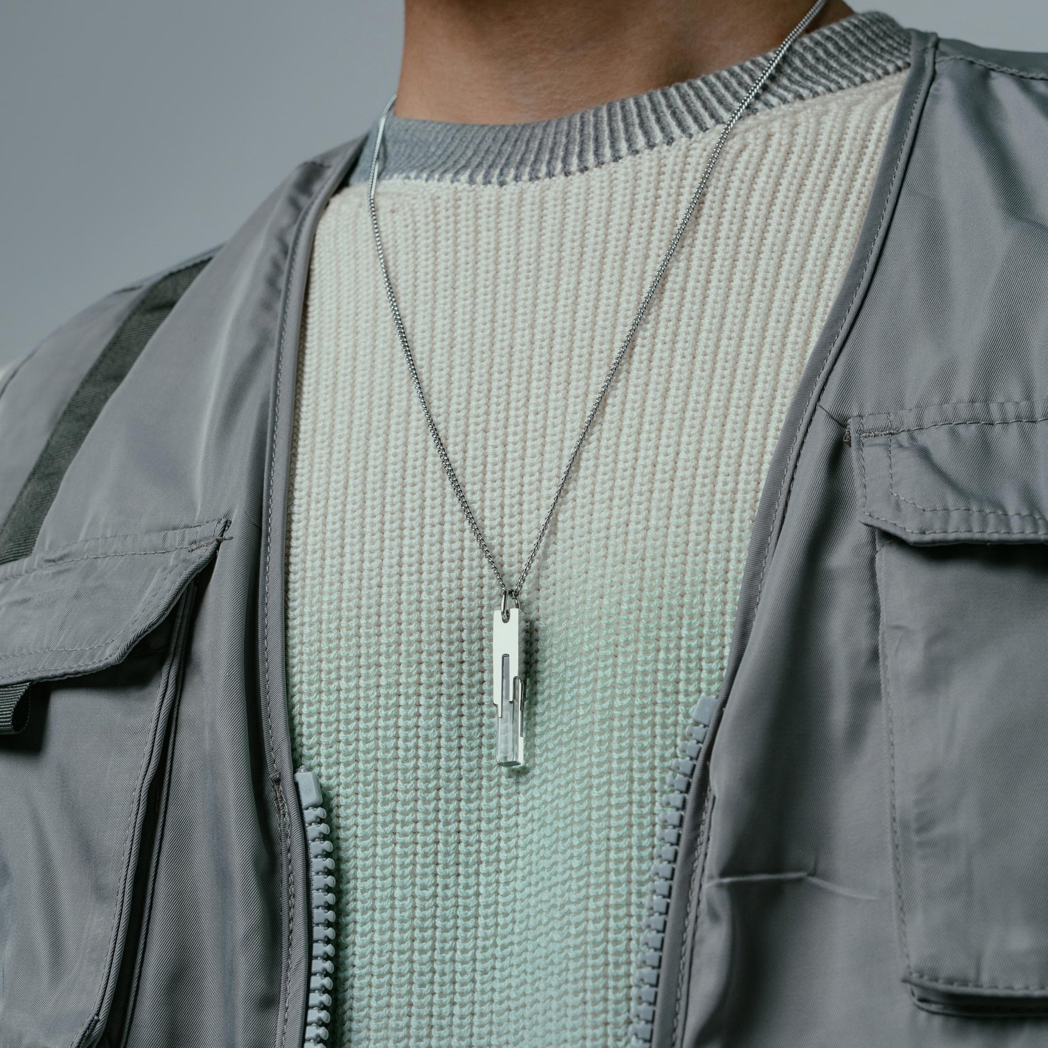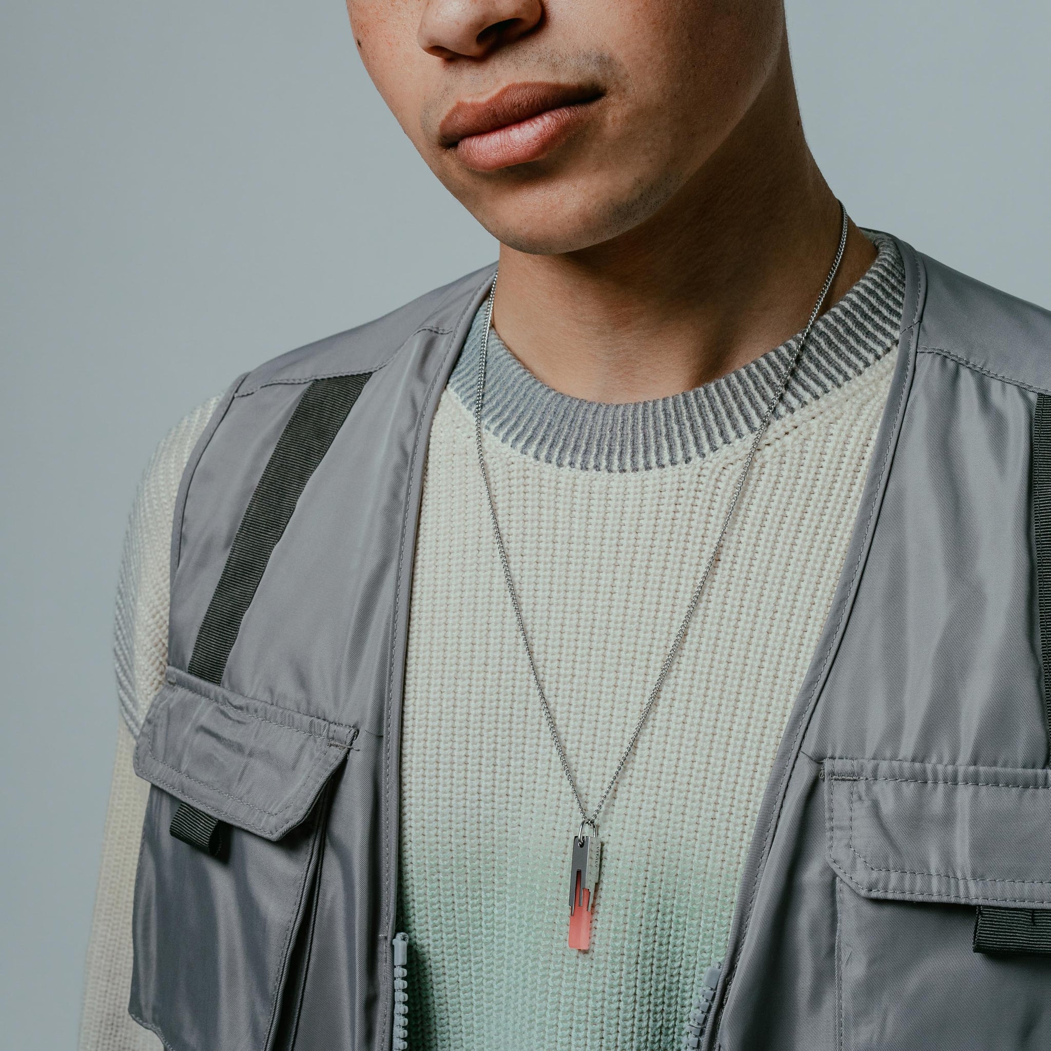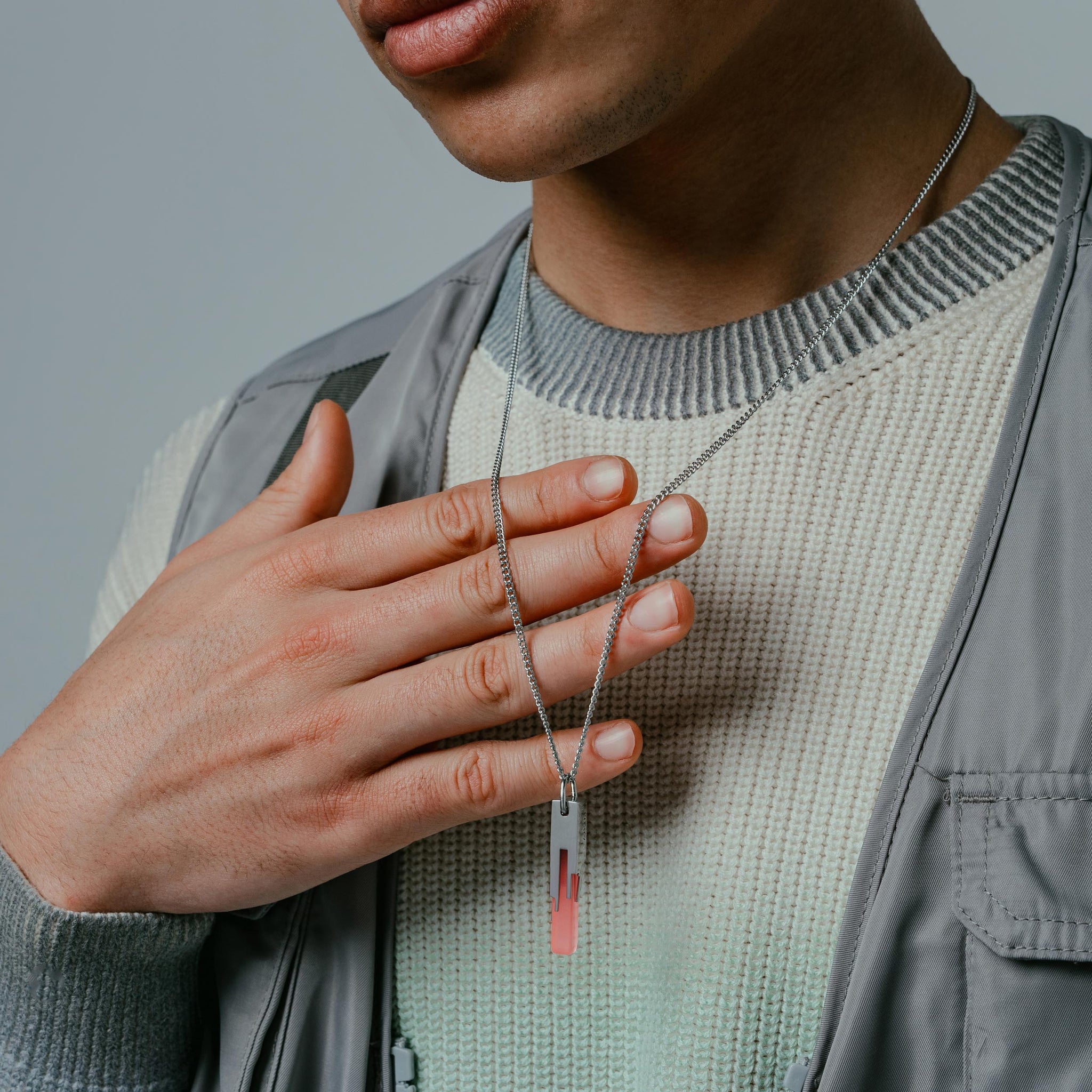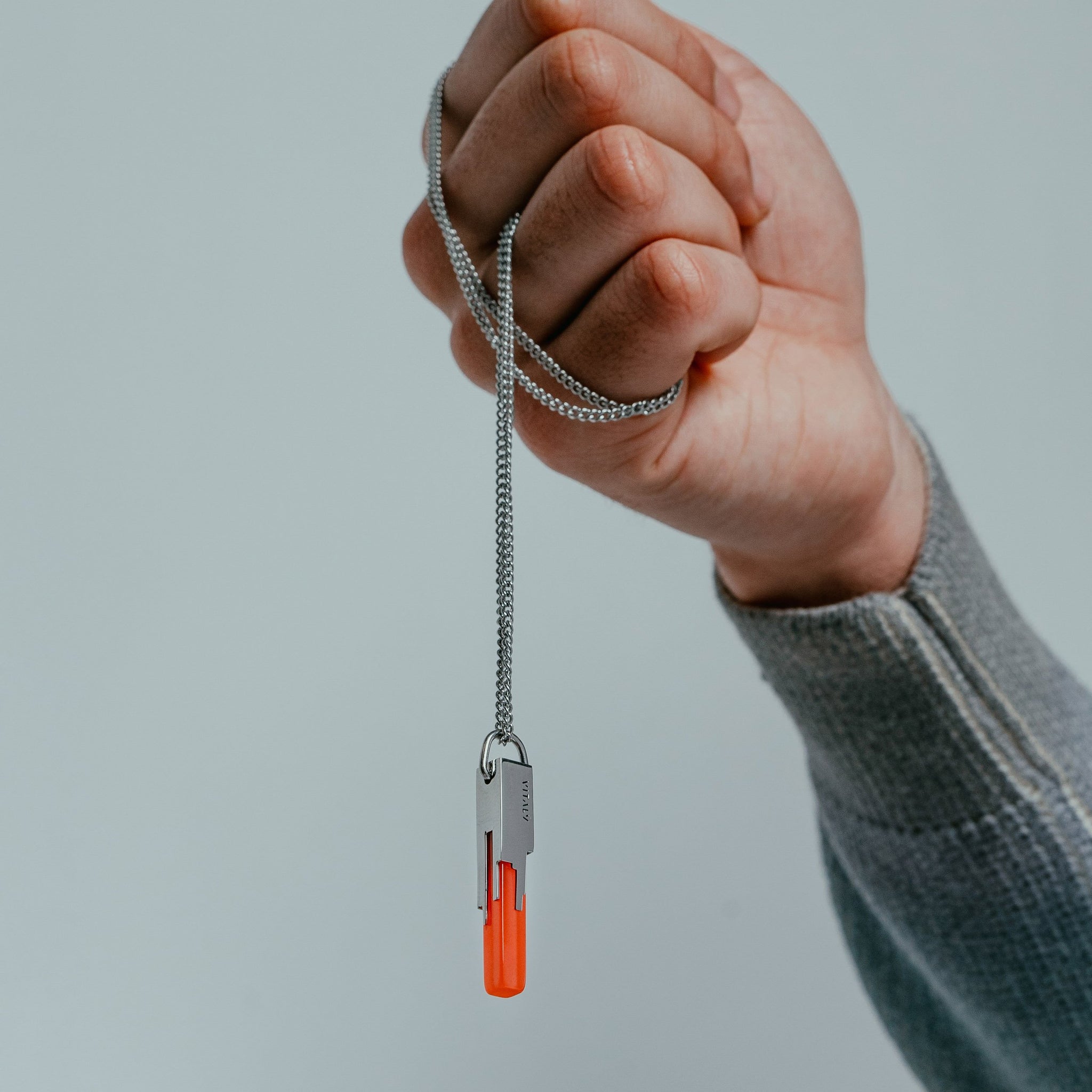 Materials: Stainless Steel, Acrylic. Comes on a 65cm (26") curb chain.