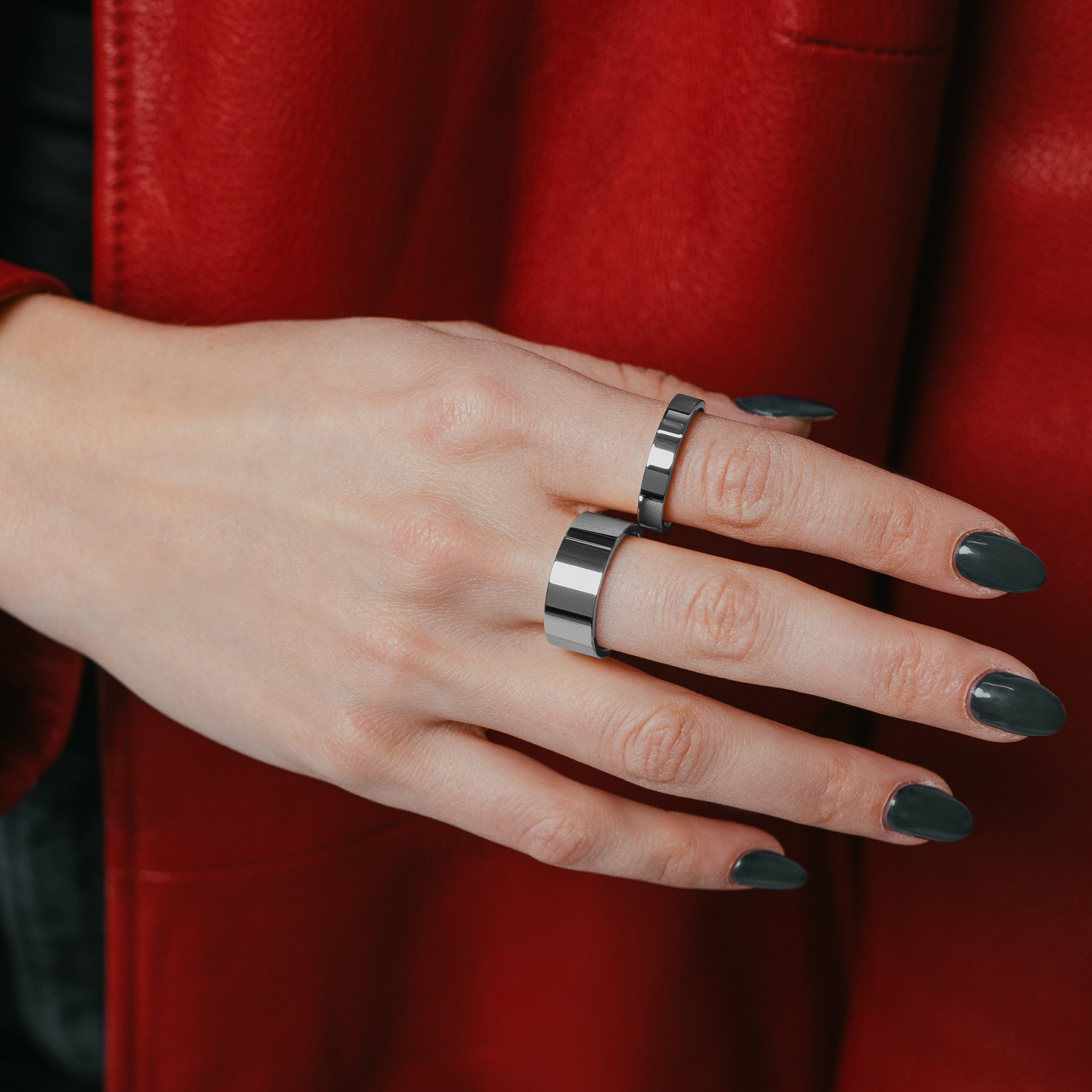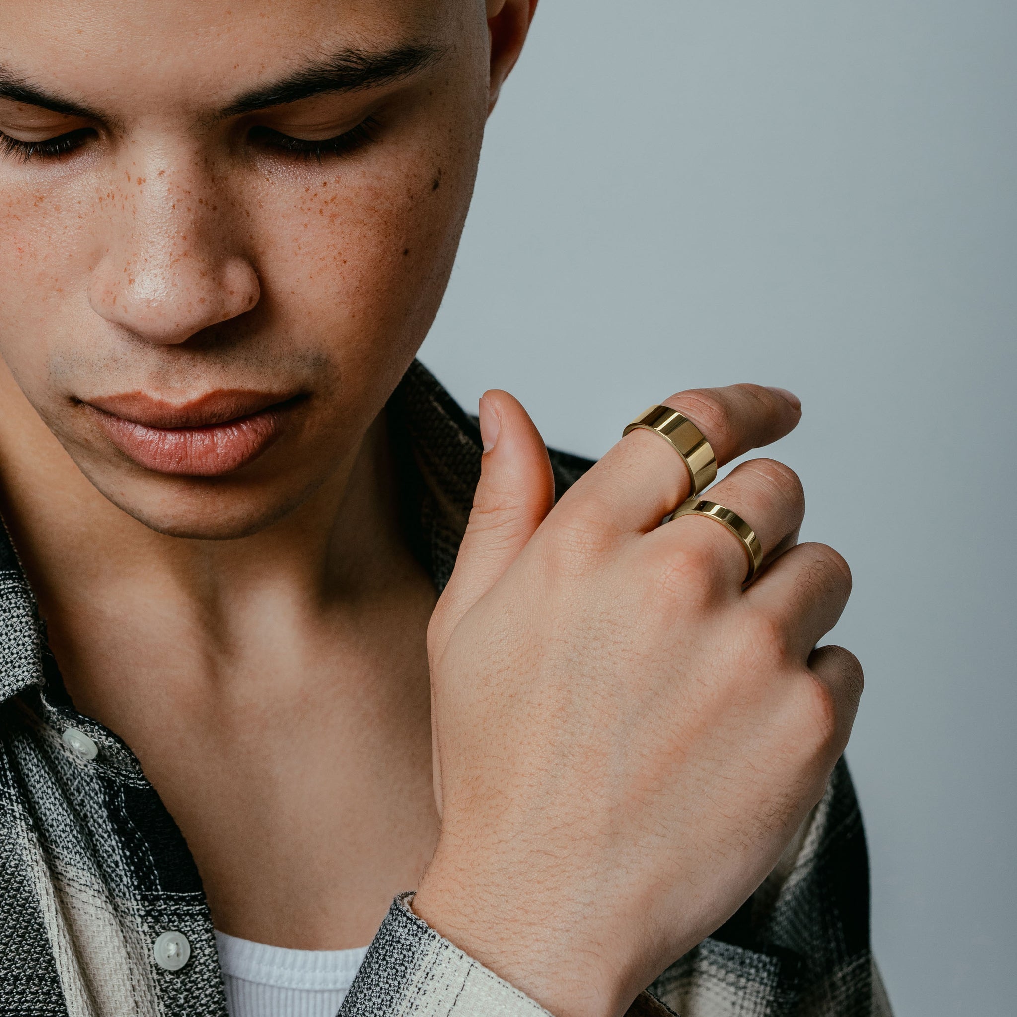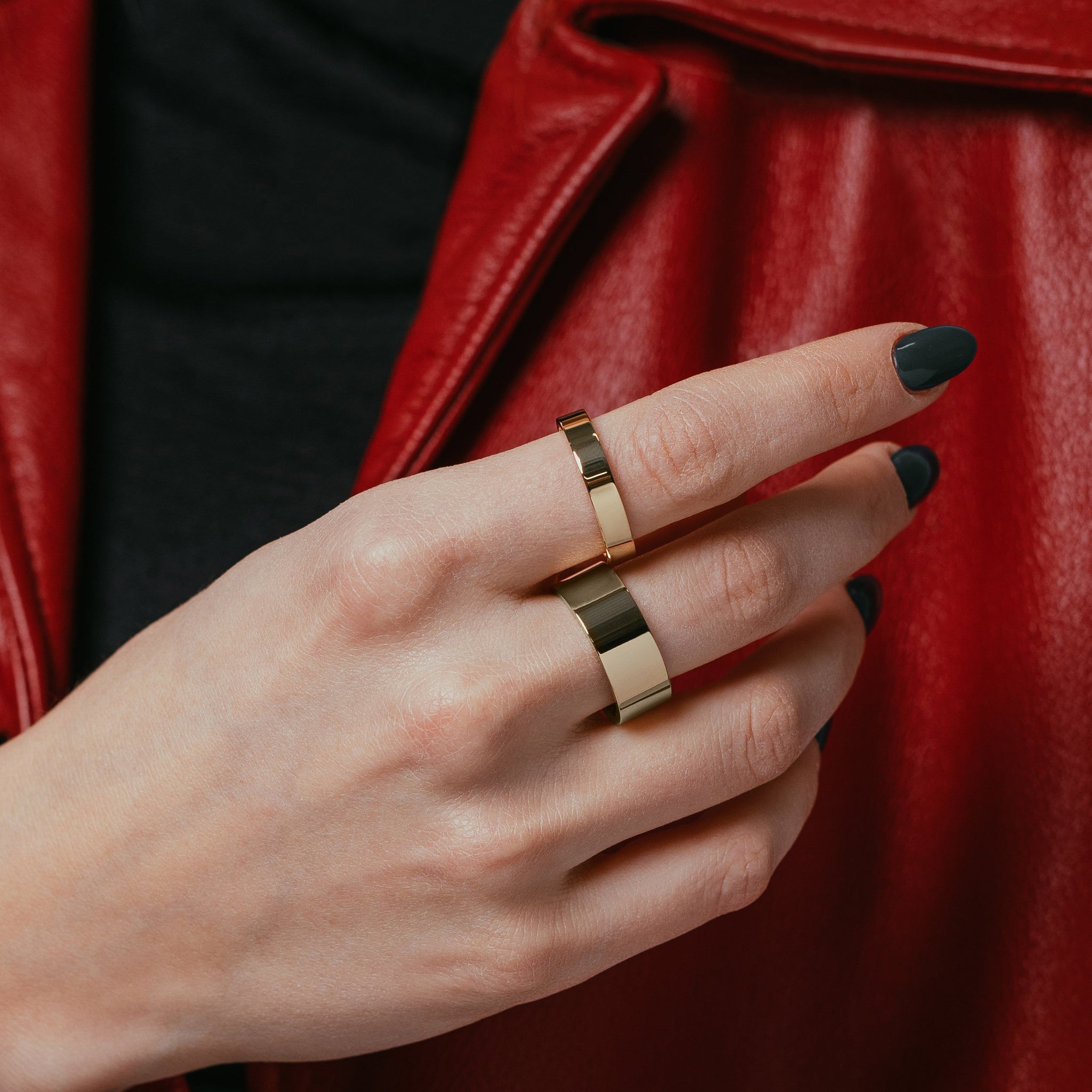 The Grip features a set of two minimalistic band rings of differing width. This essential design can be stacked together or worn on separate fingers.
