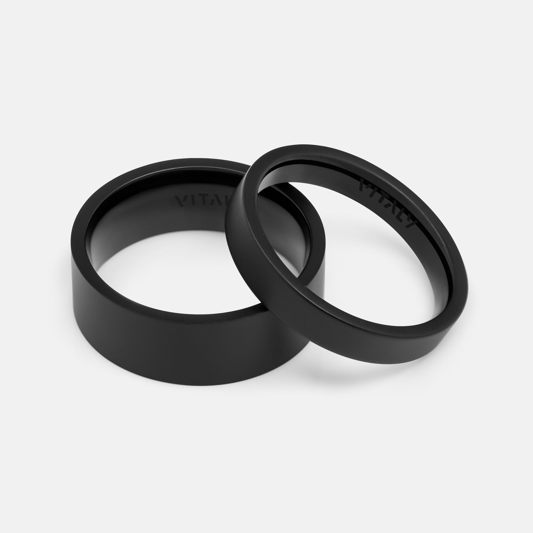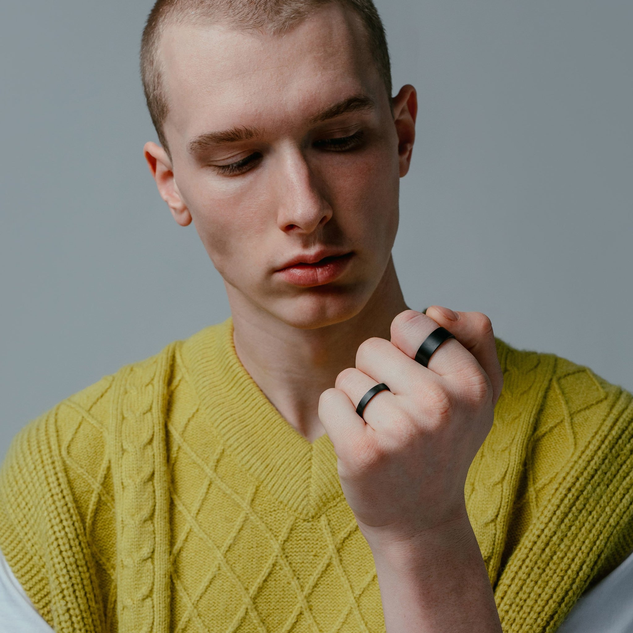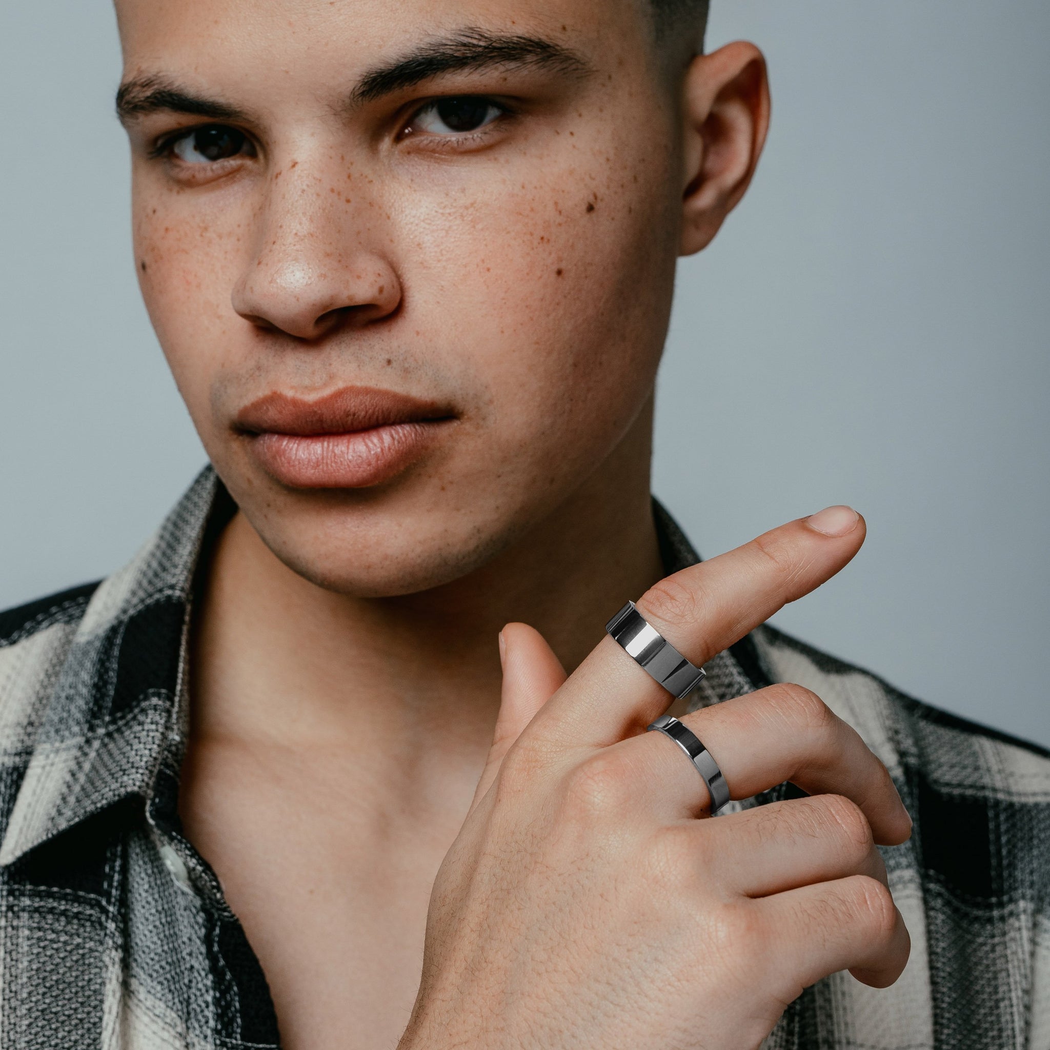 The Grip features a set of two minimalistic band rings of differing width. This essential design can be stacked together or worn on separate fingers.