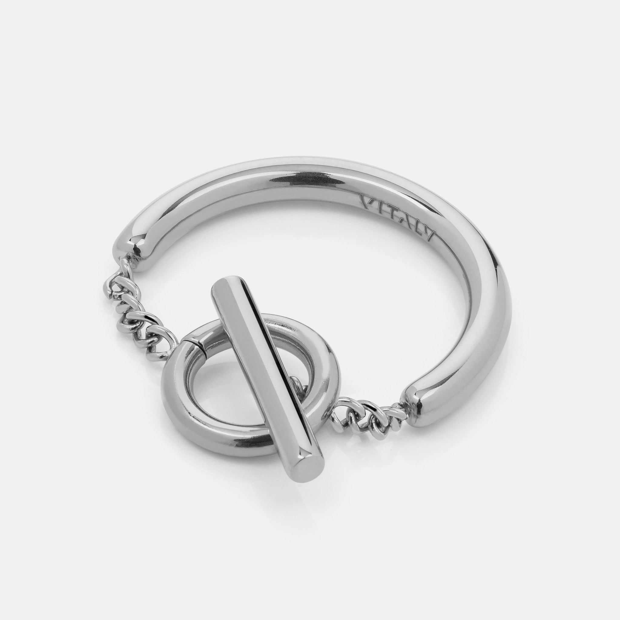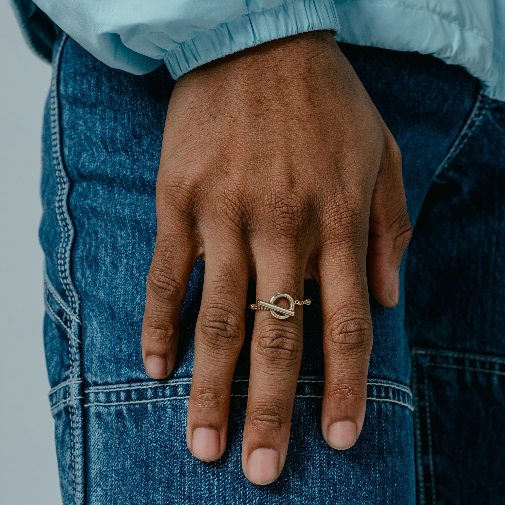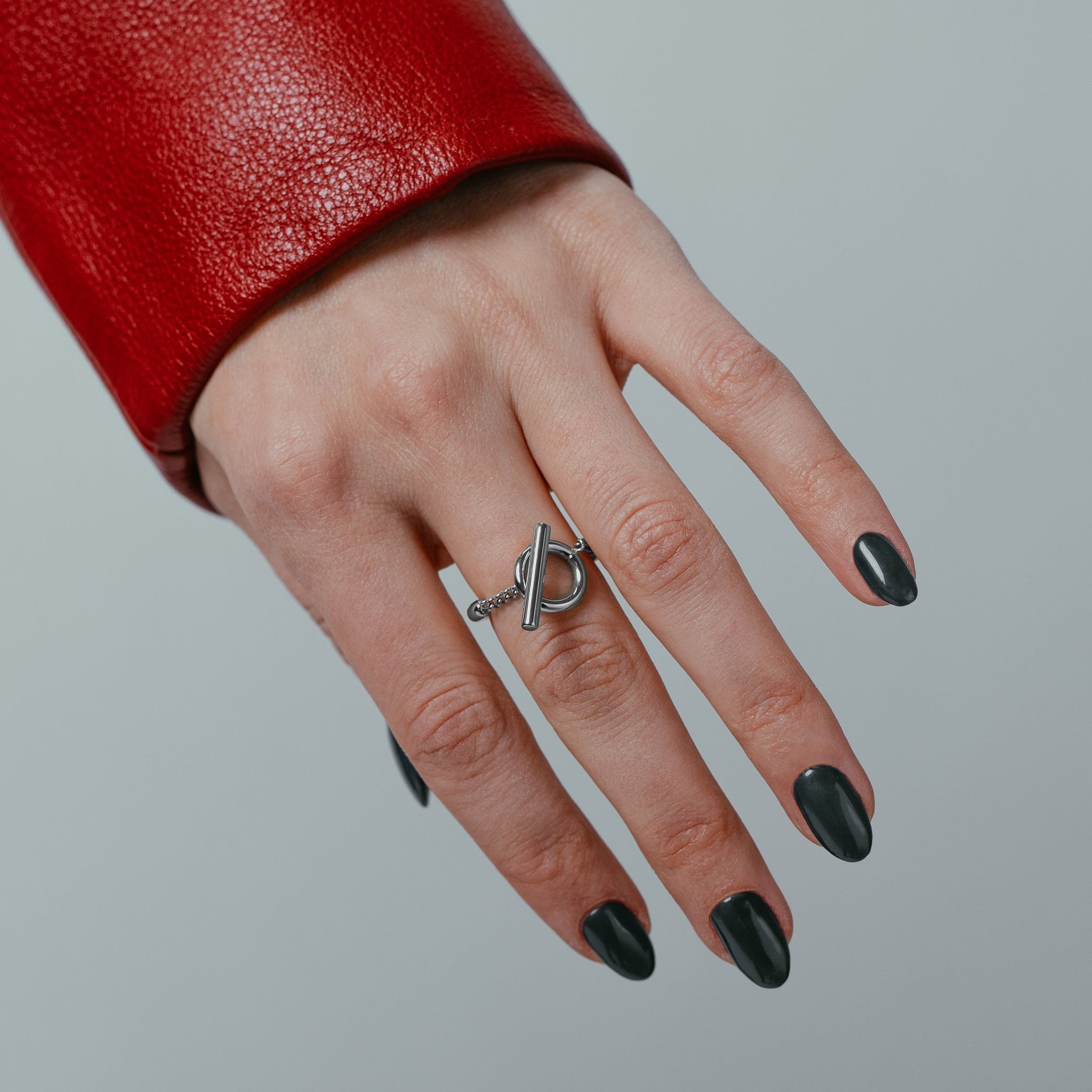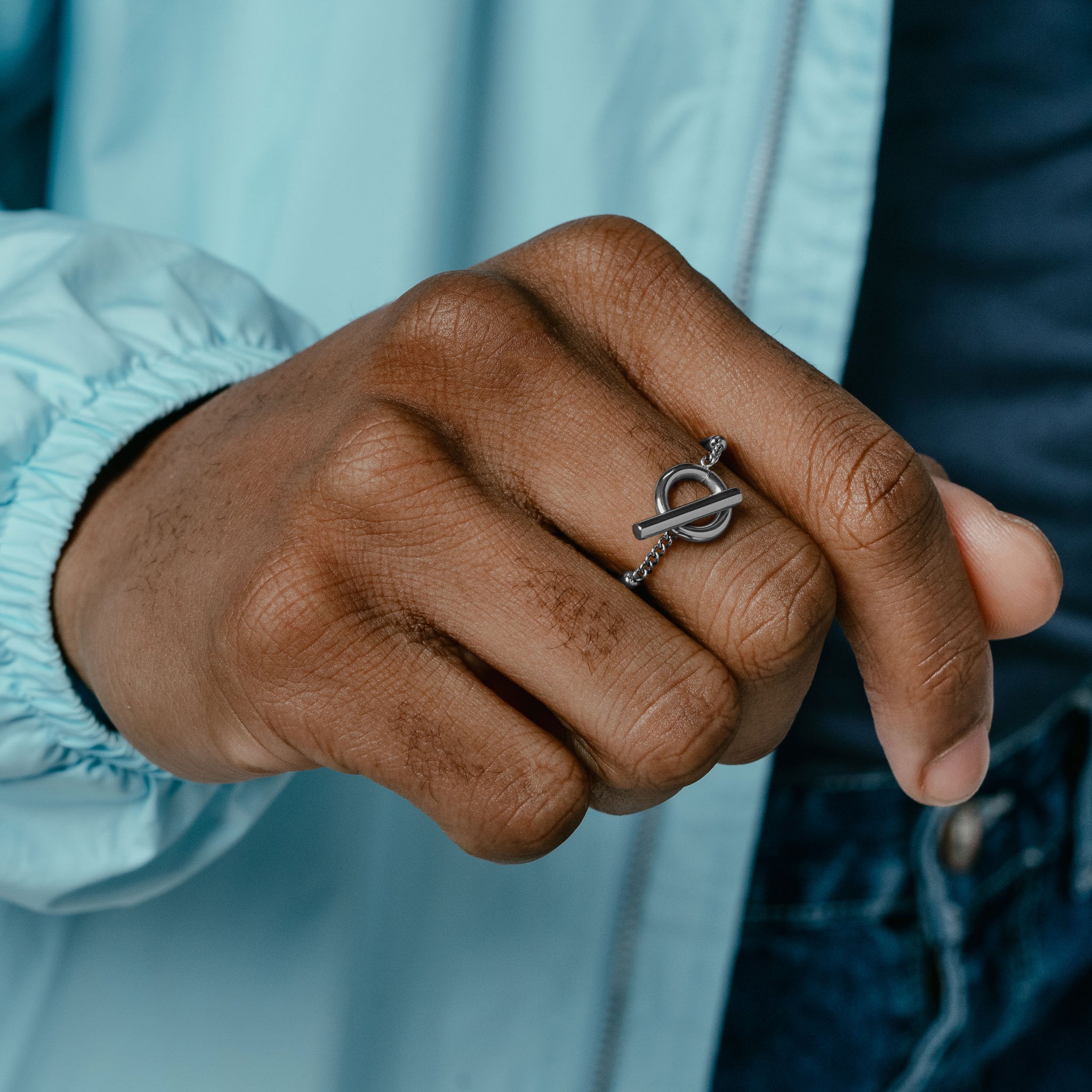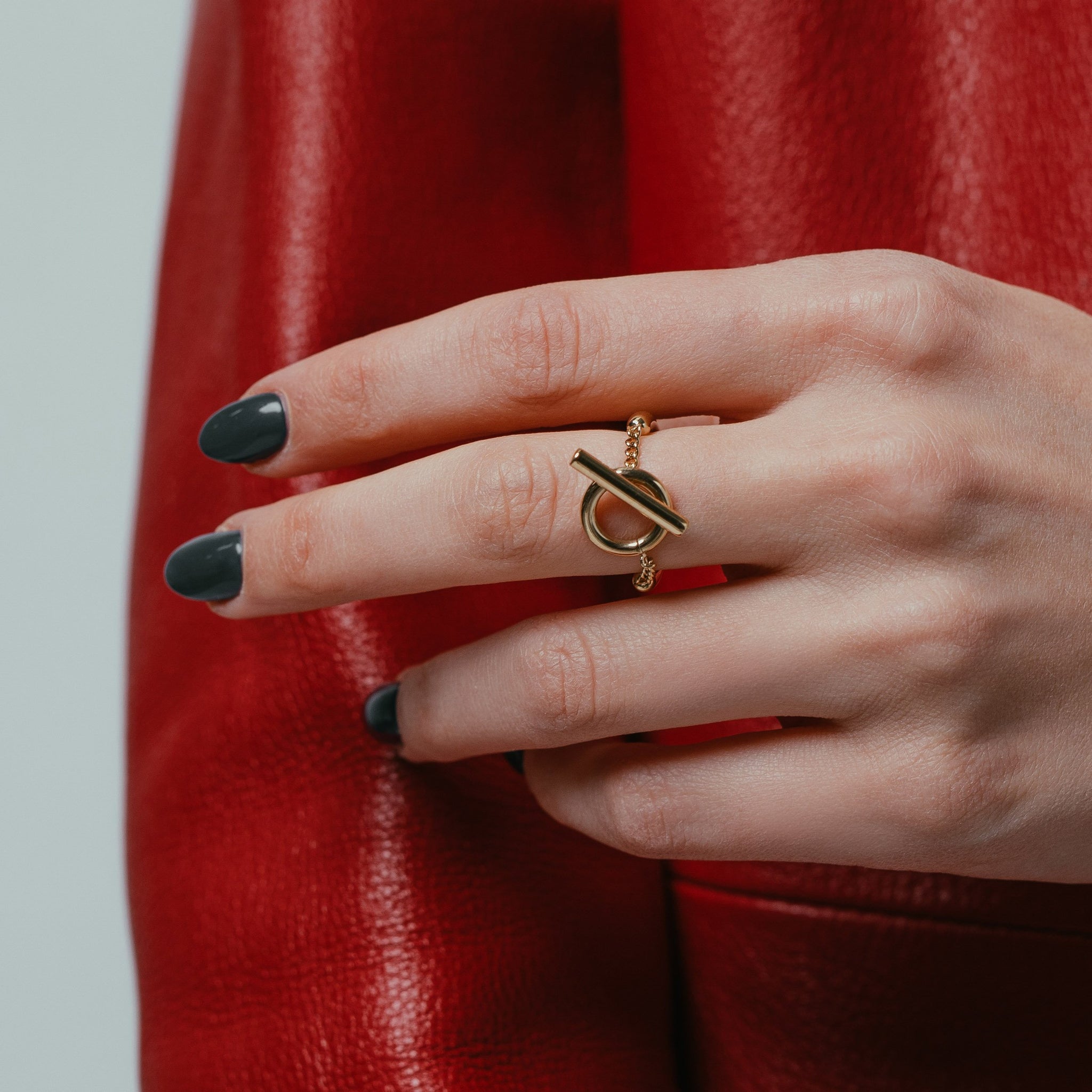 This slender ring features an over-sized toggle-clasp that is joined to the sleek band using Miami-link chain.