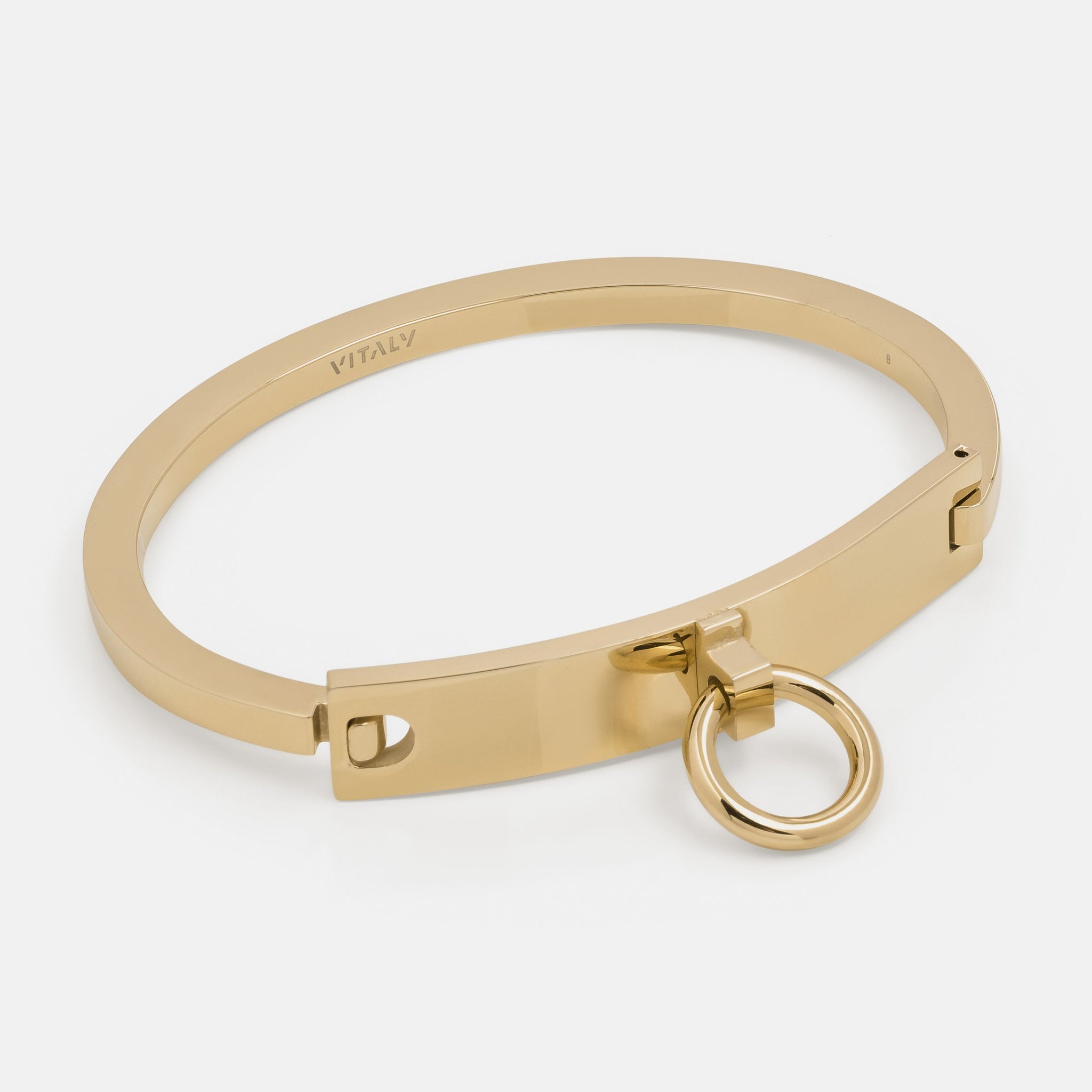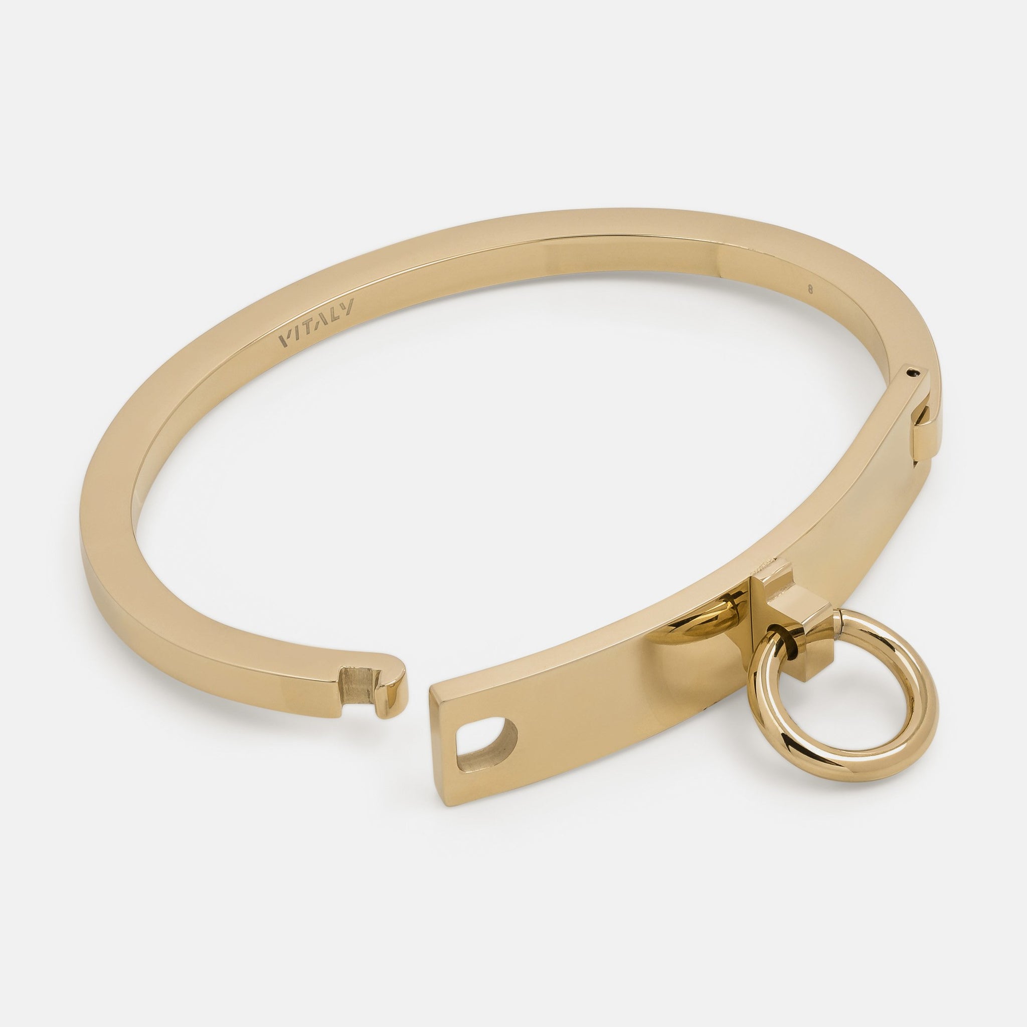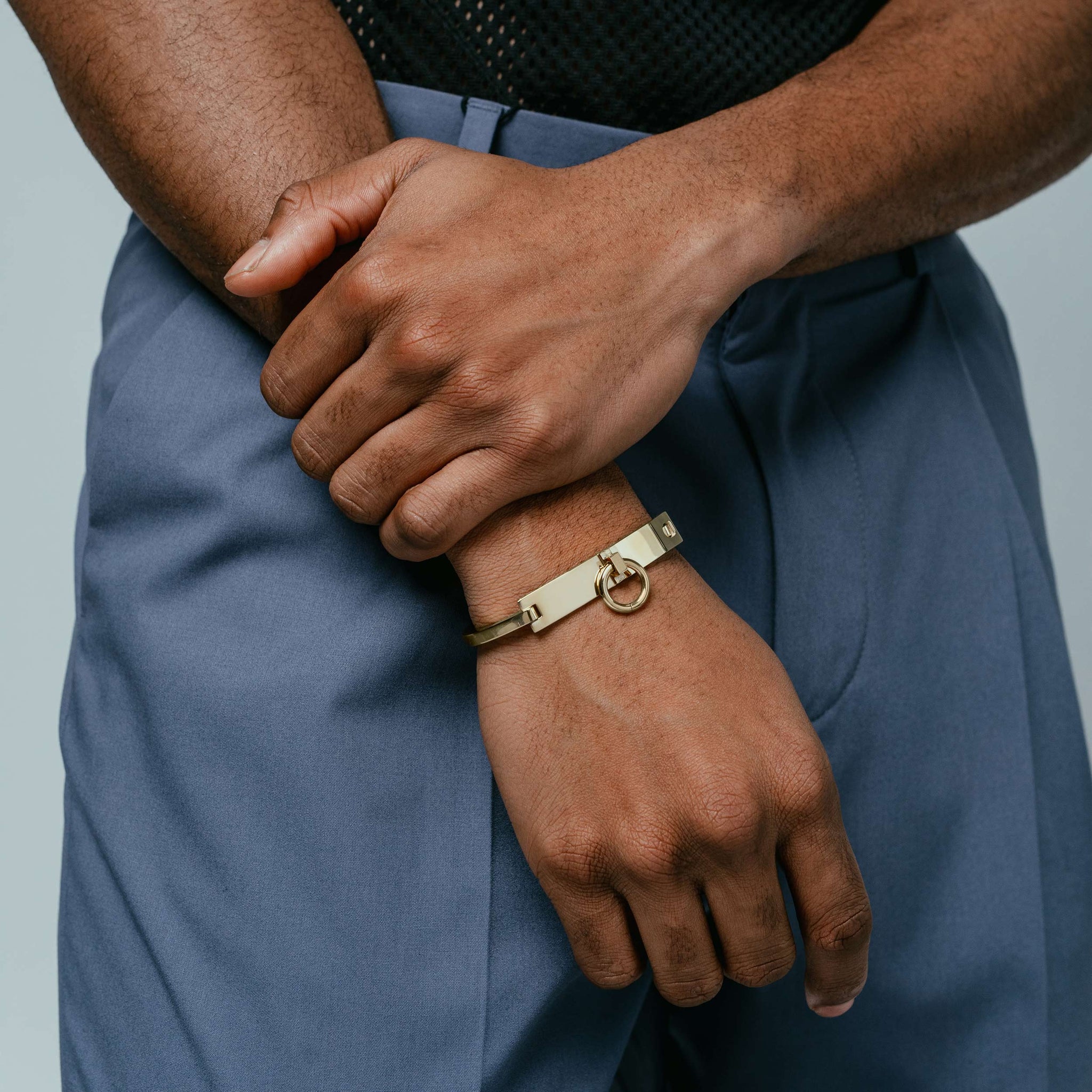 This solid cuff features an articulating ring detail and a hinging top panel with hook-and-latch closure.
