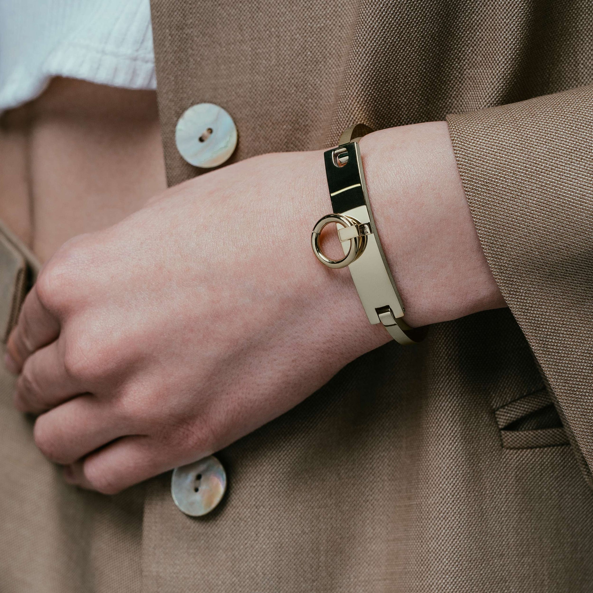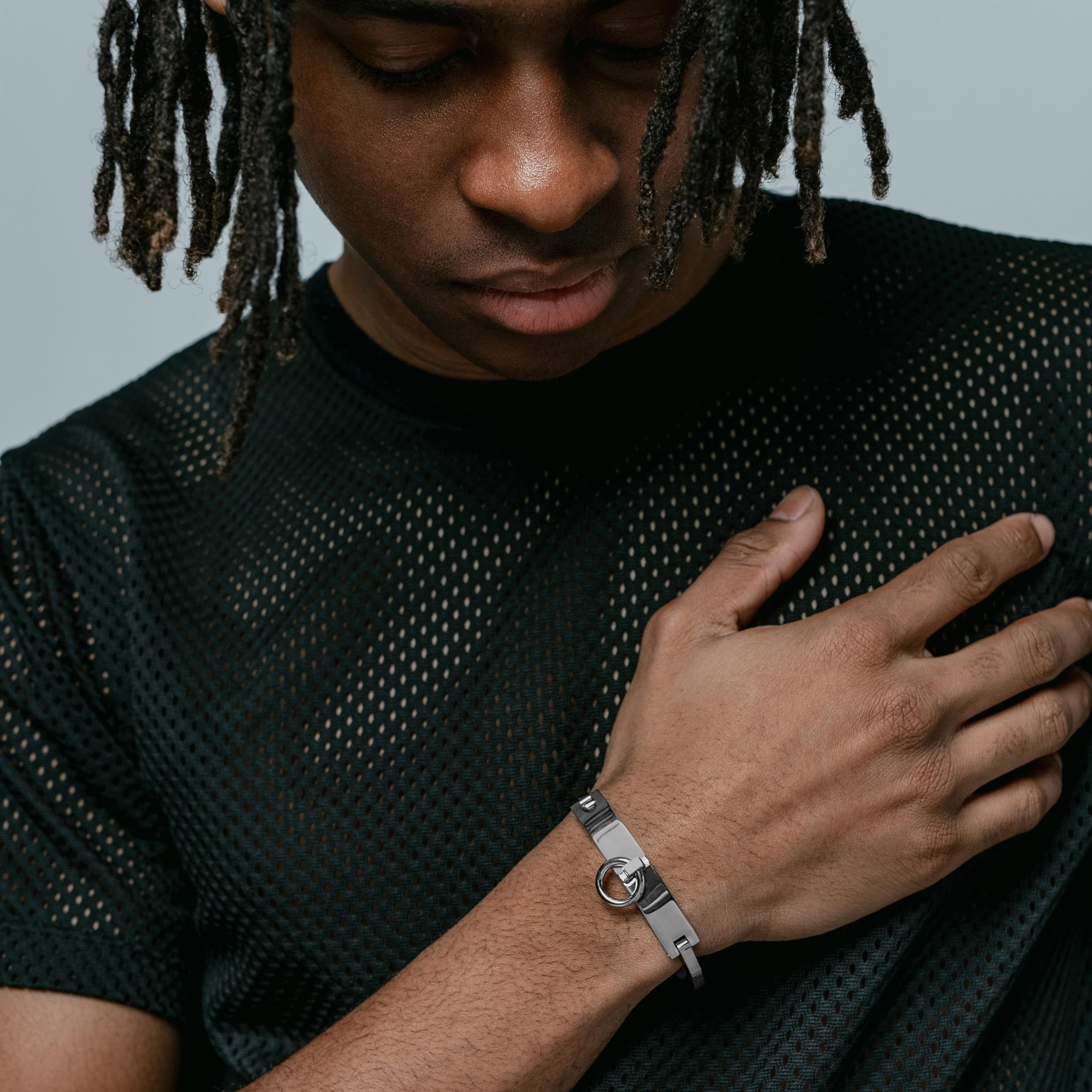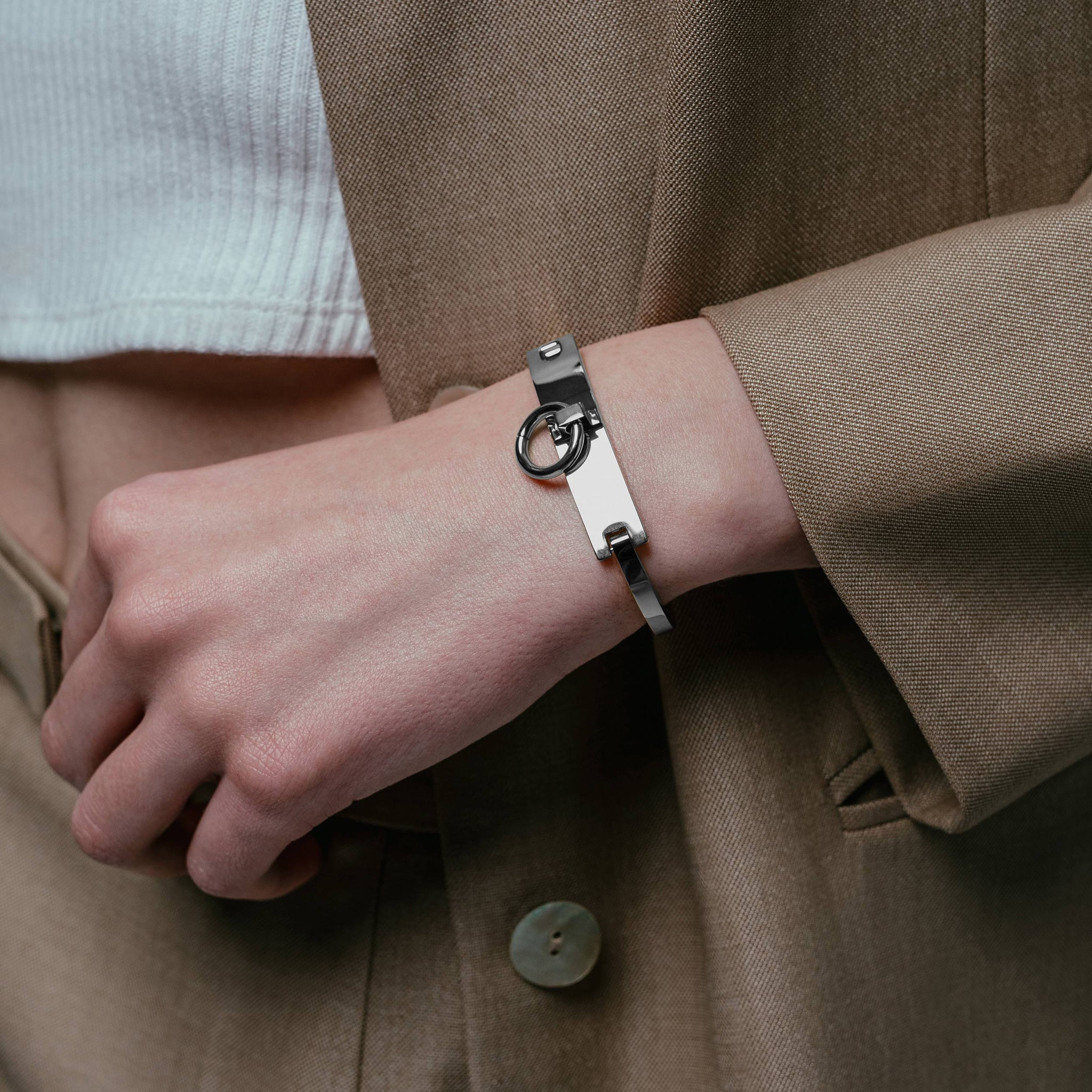 This solid cuff features an articulating ring detail and a hinging top panel with hook-and-latch closure.
