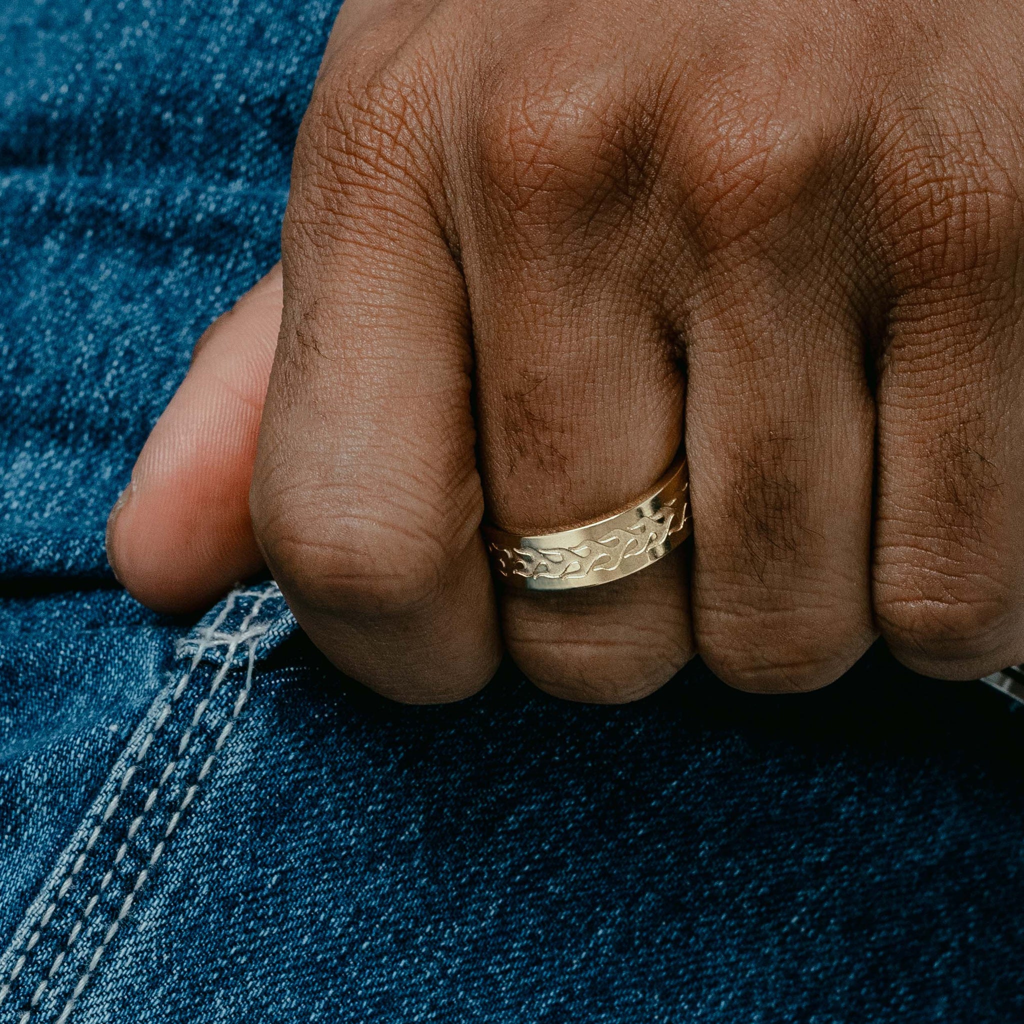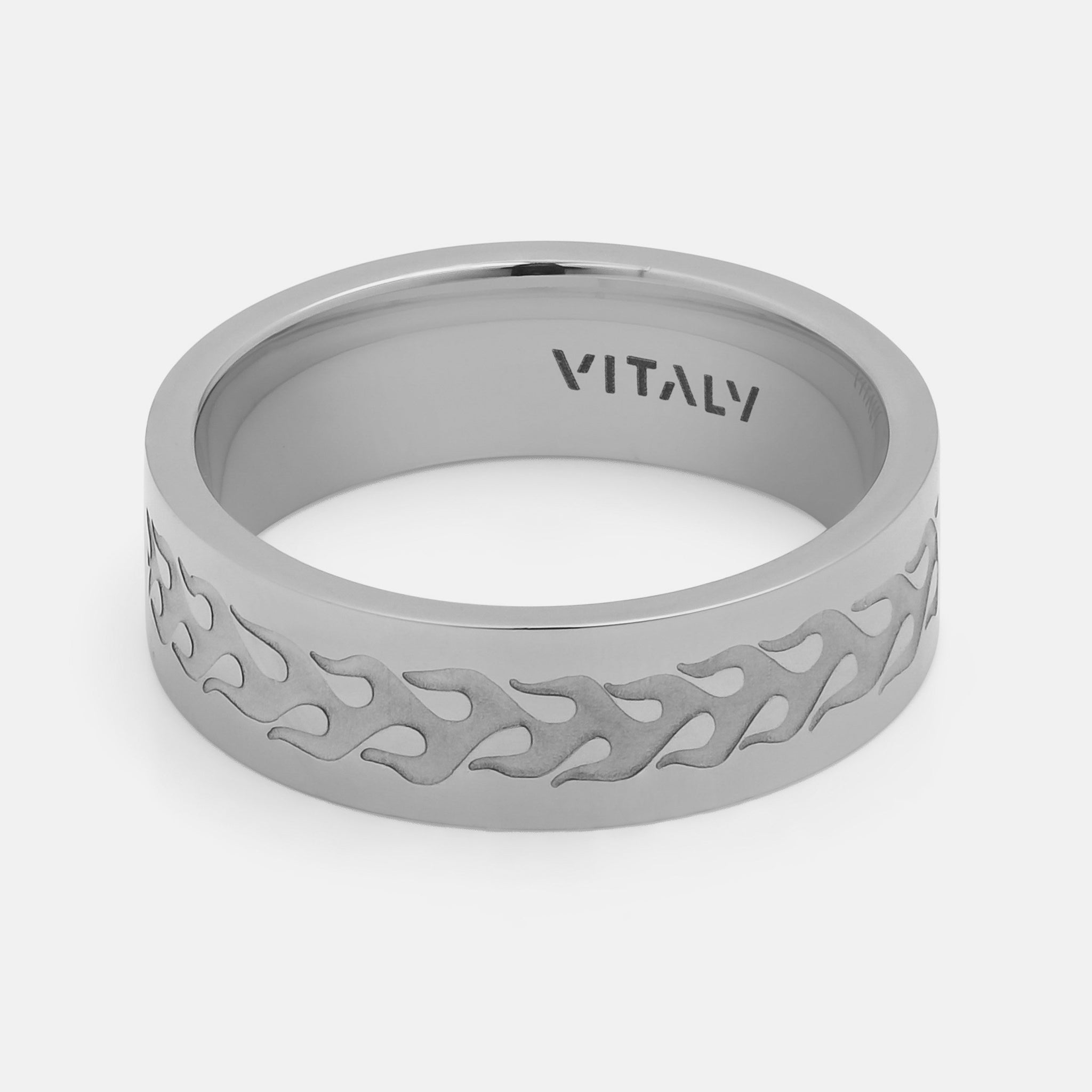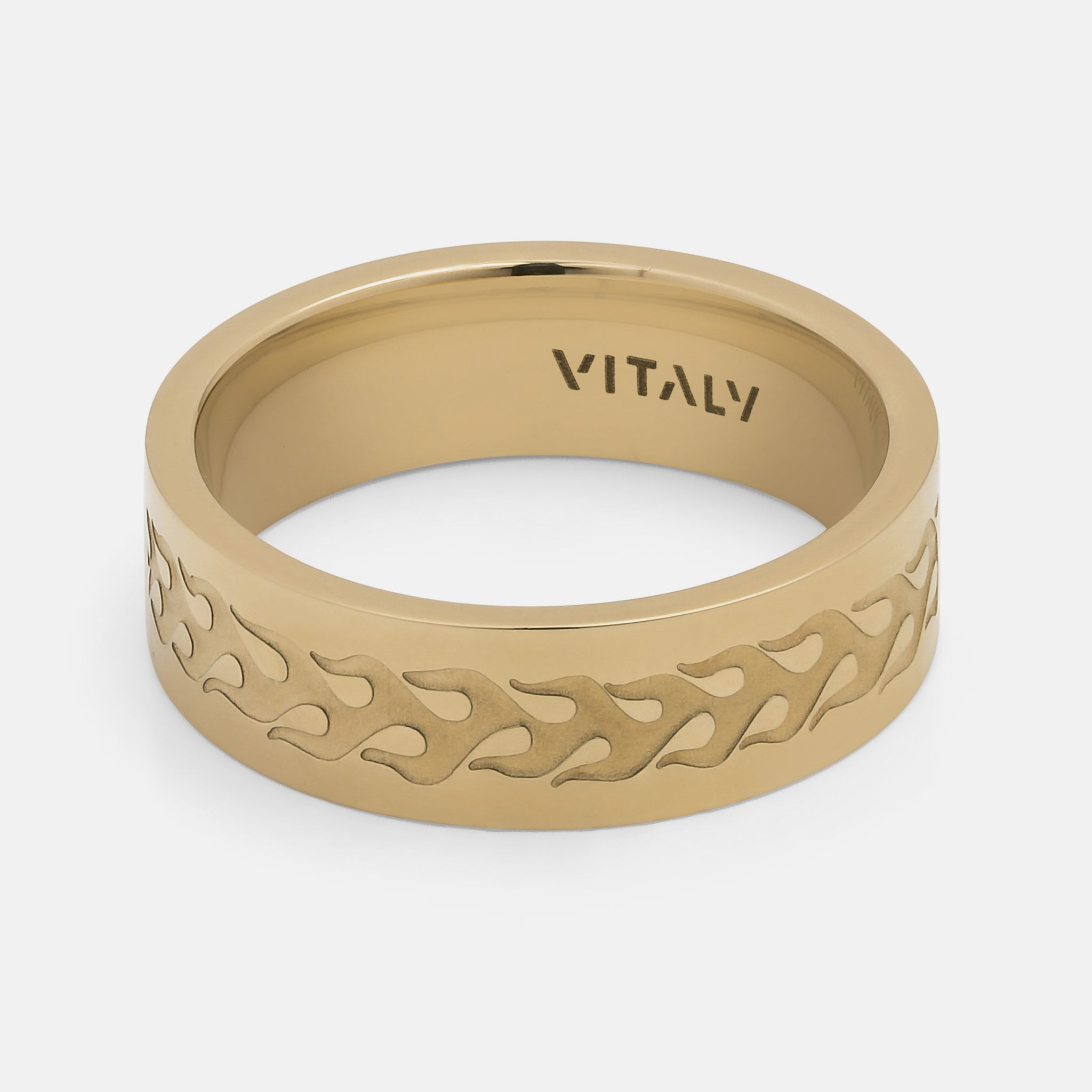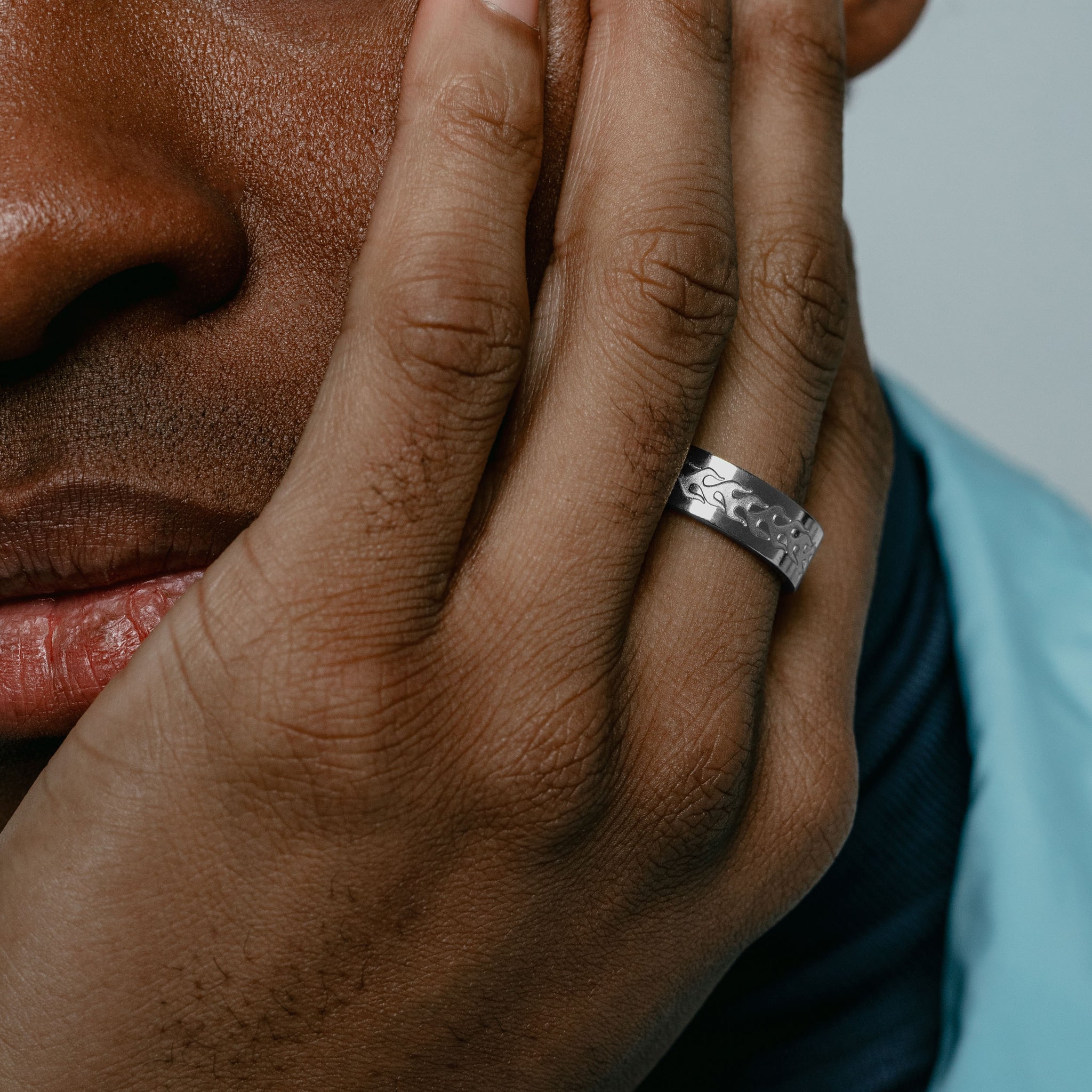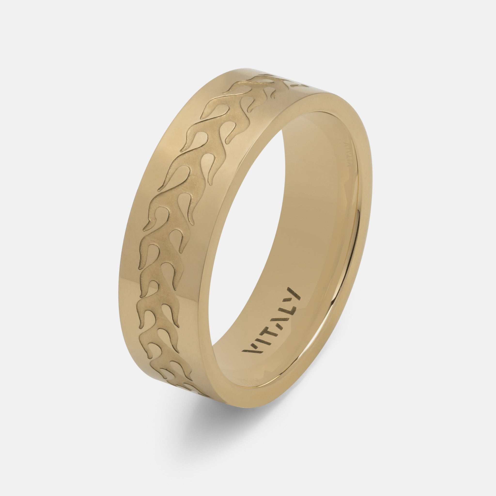 The Pyro is a minimalist band ring with laser-engraved flame detailing.