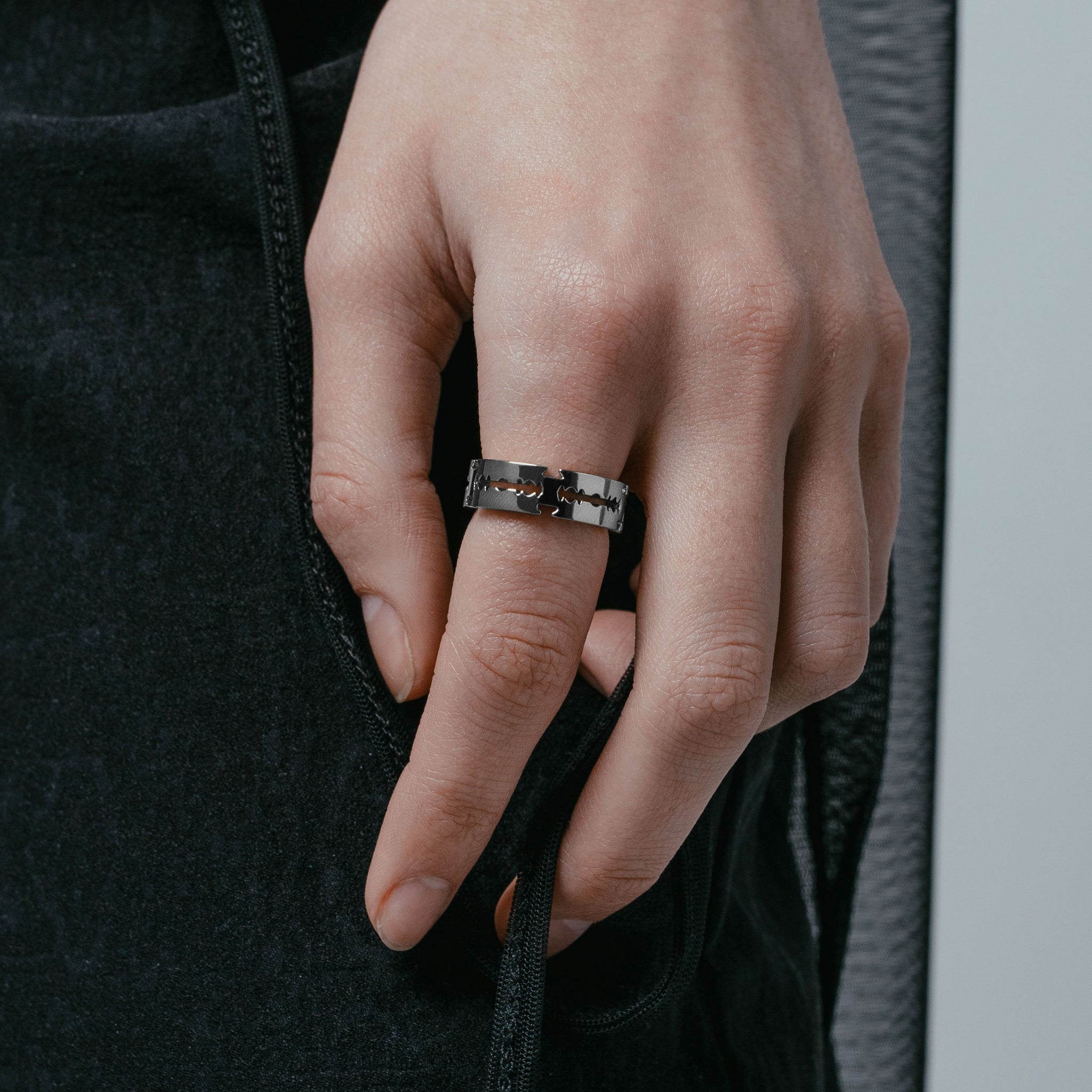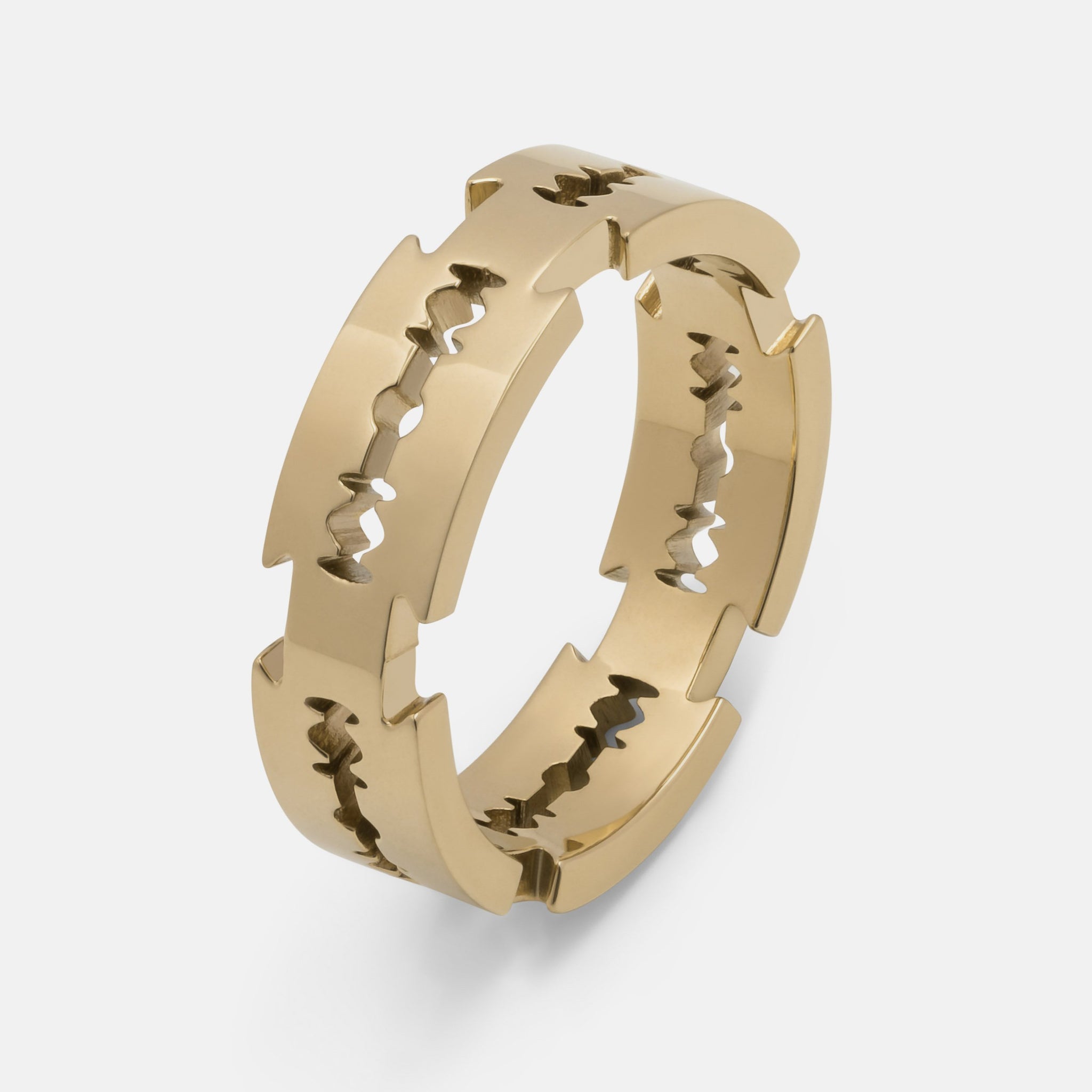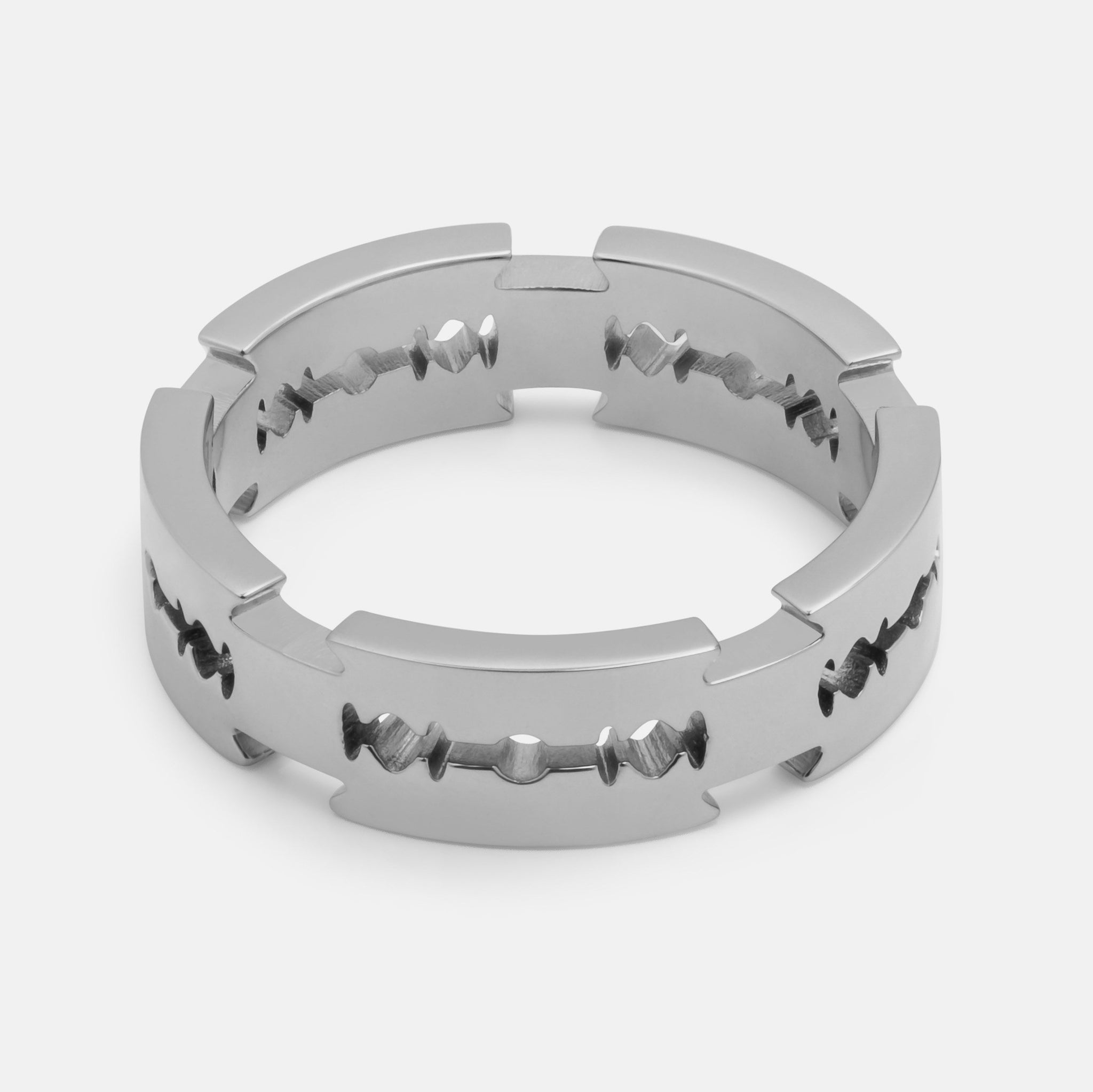This band ring is composed of interlocking razors. Each blade is finished with intricate laser-cut detailing.