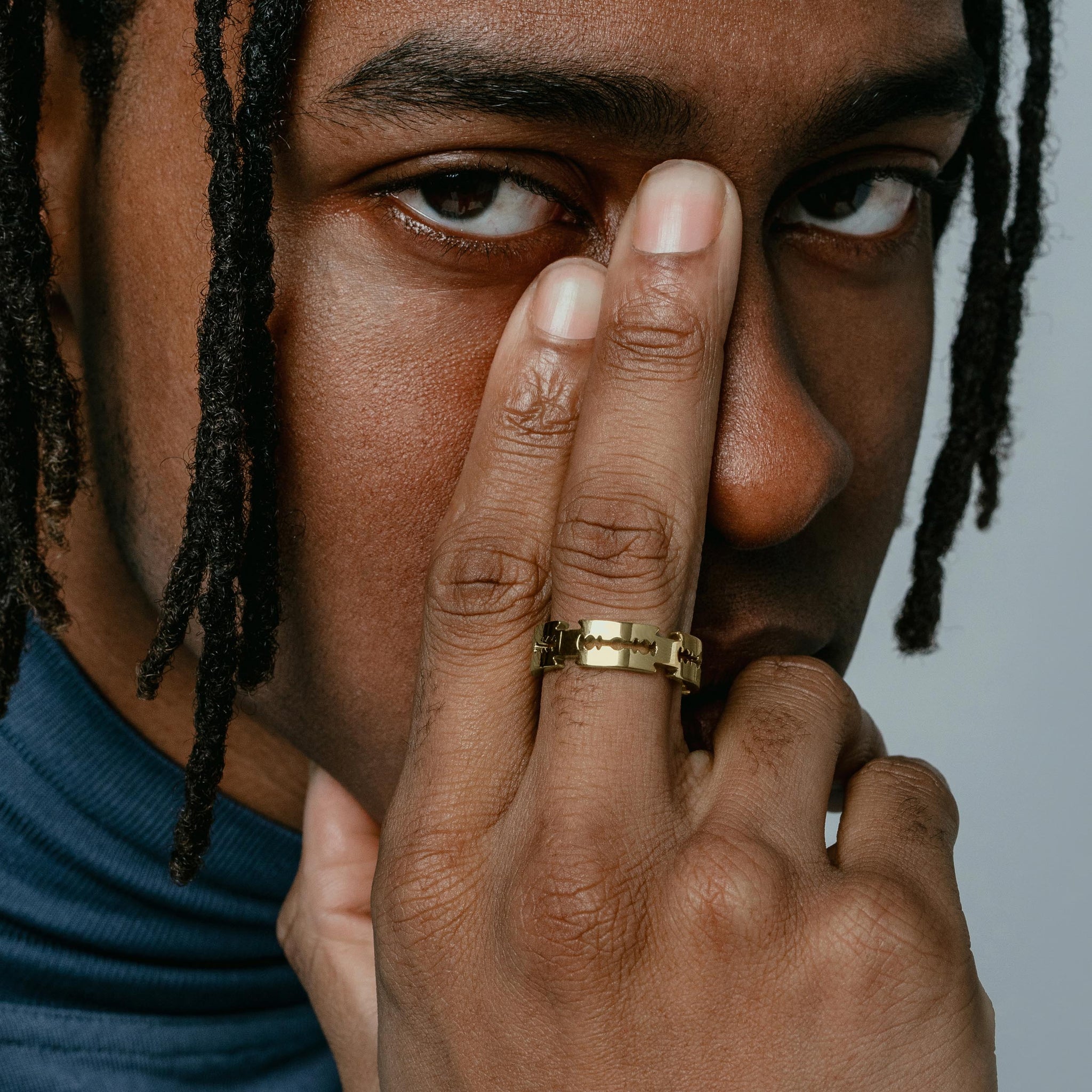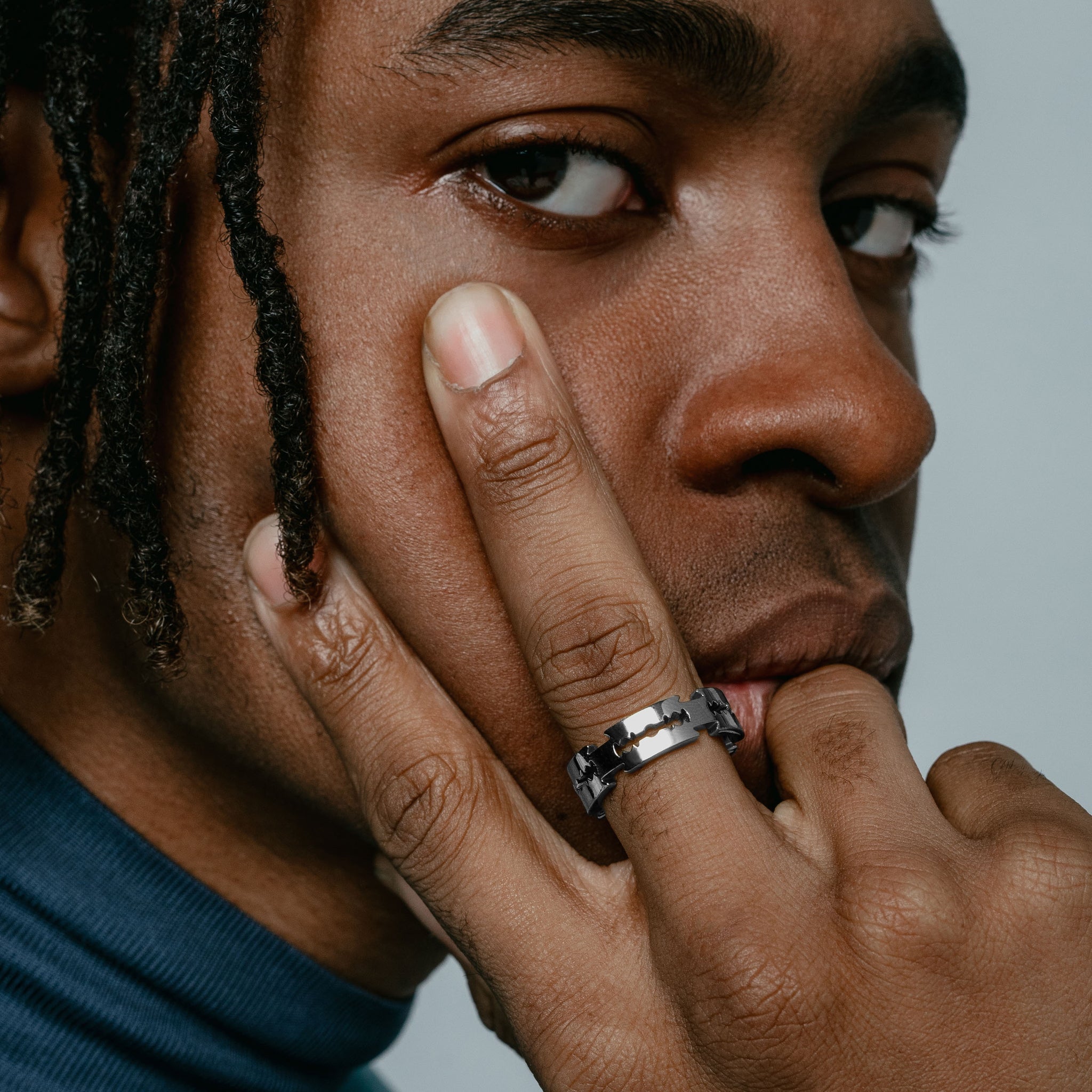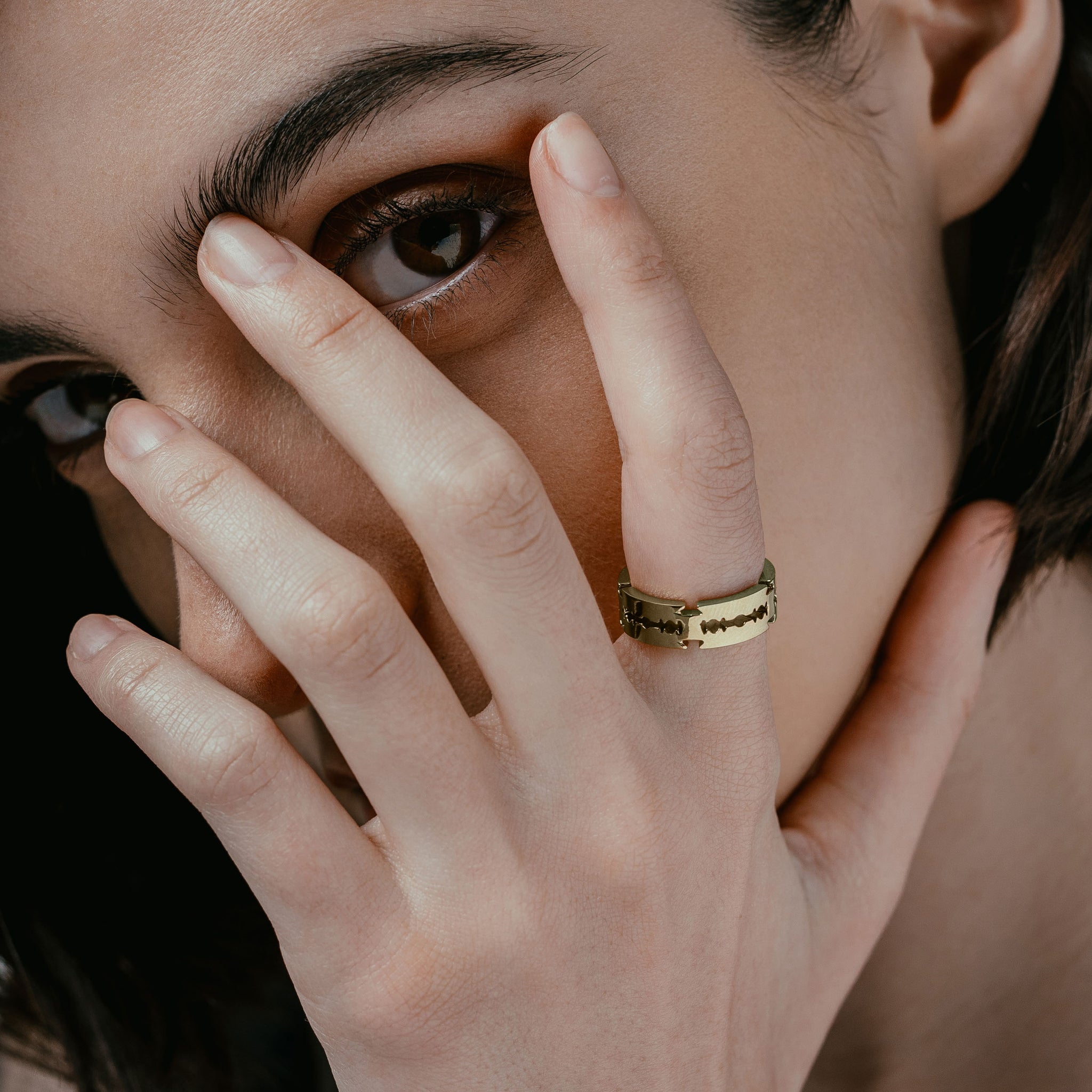 This band ring is composed of interlocking razors. Each blade is finished with intricate laser-cut detailing.