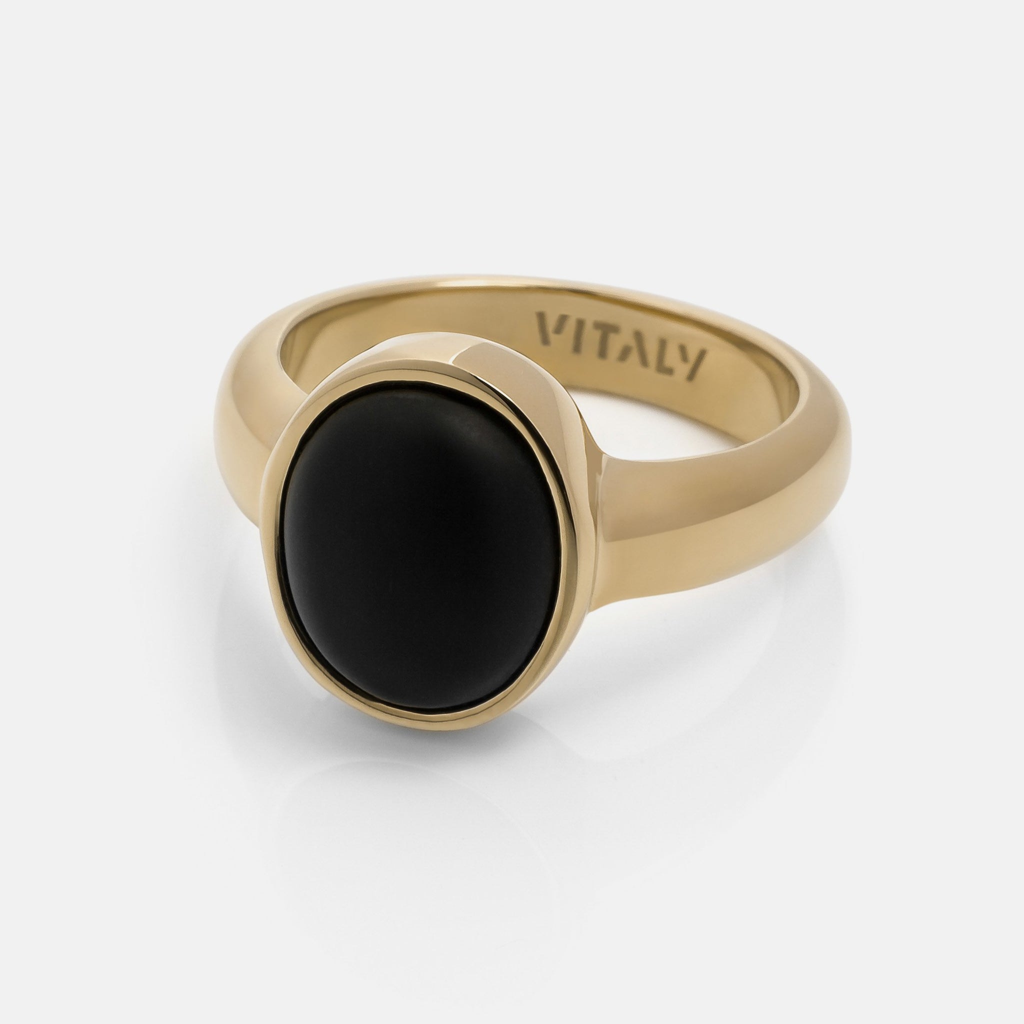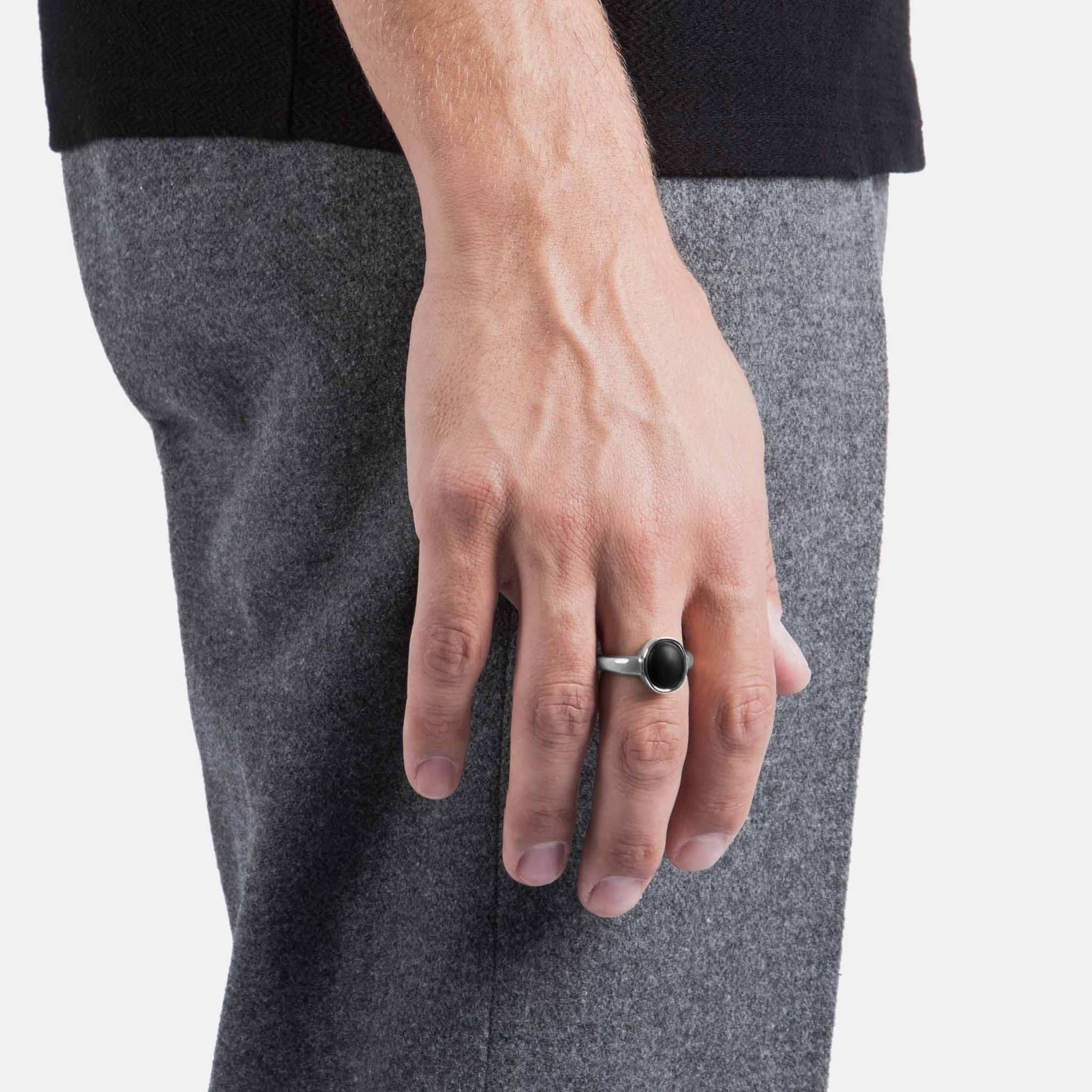 Inspired by the jewelry of nomadic tribes, the name Reika means “wander” in Icelandic. Featuring a domed onyx stone, the oval-shaped casing sits atop a narrow band and gives this ring a shape that is completely different than anything we have released before.