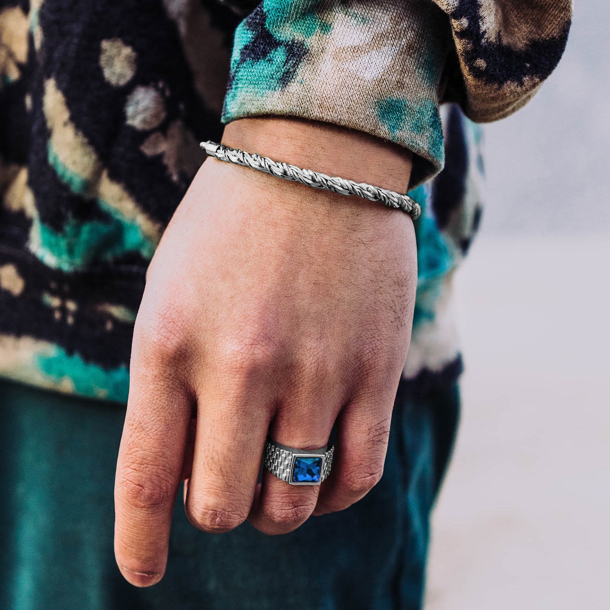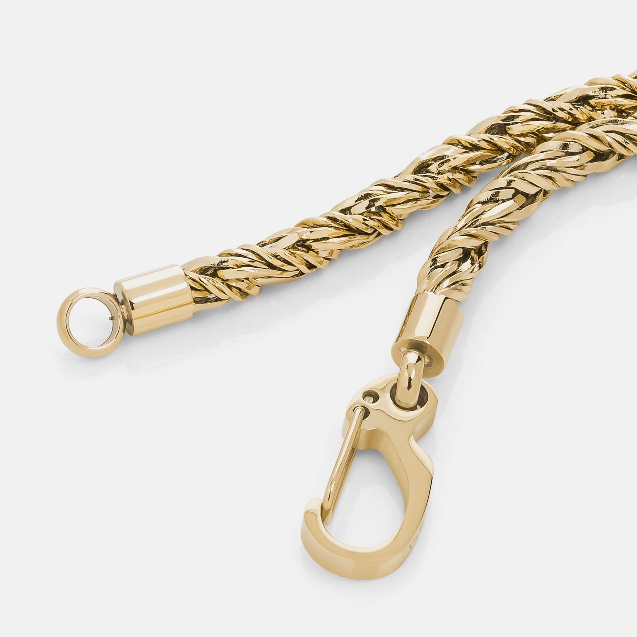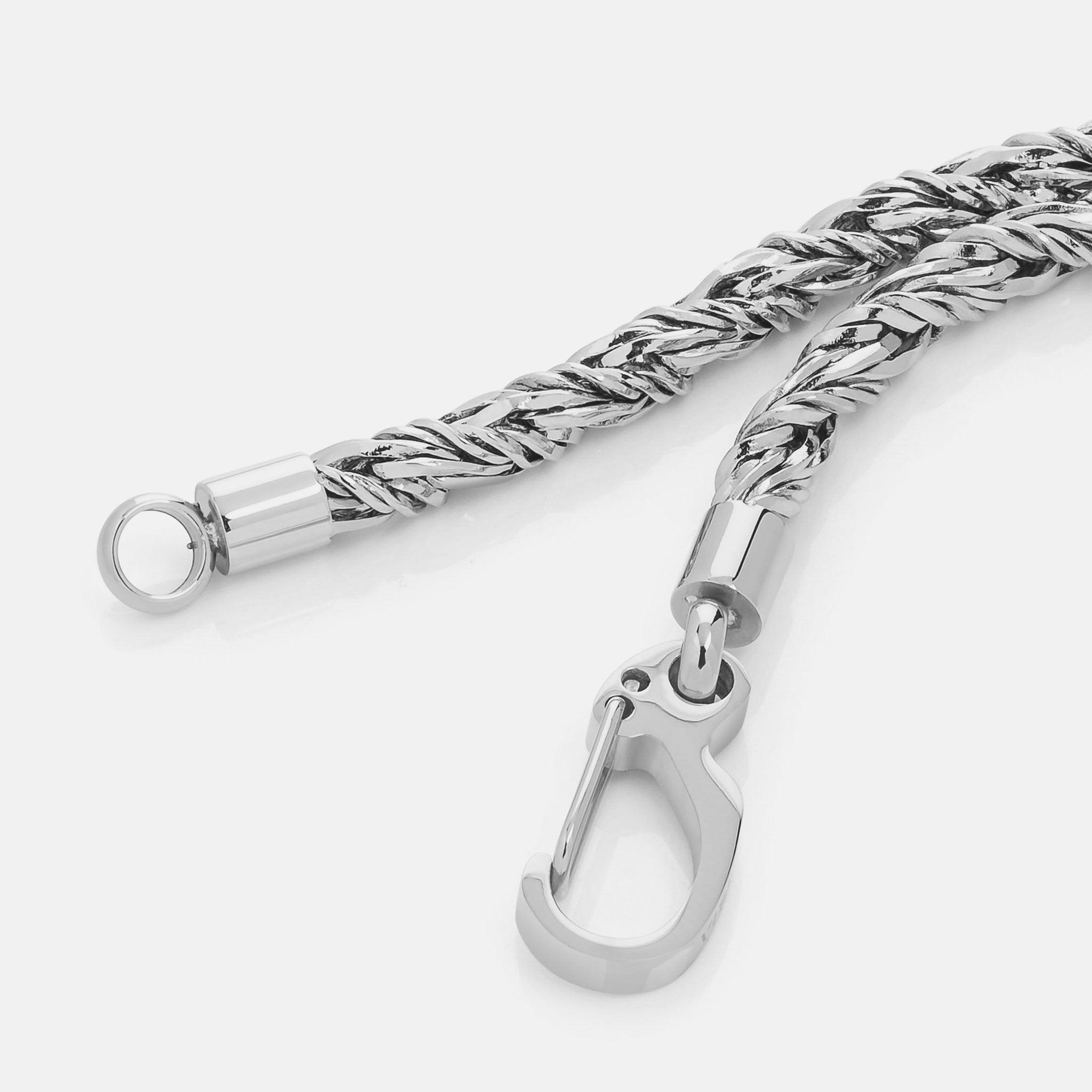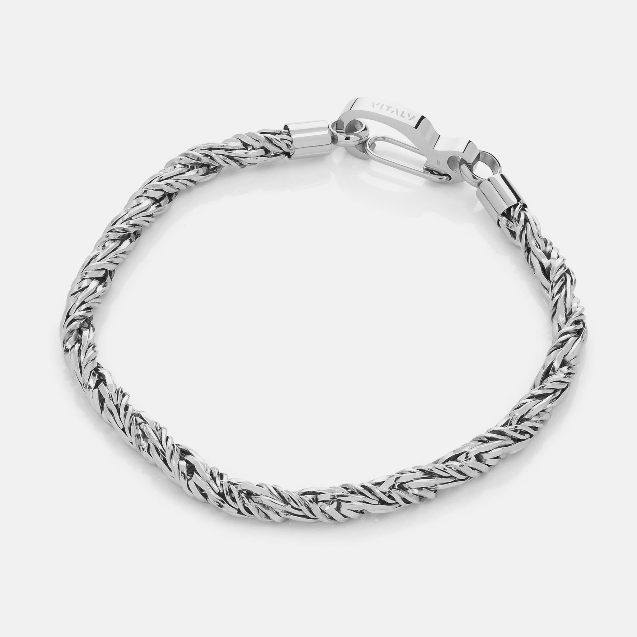 This highly detailed woven bracelet is finished with polished contrast end-caps and a custom carabiner clasp.