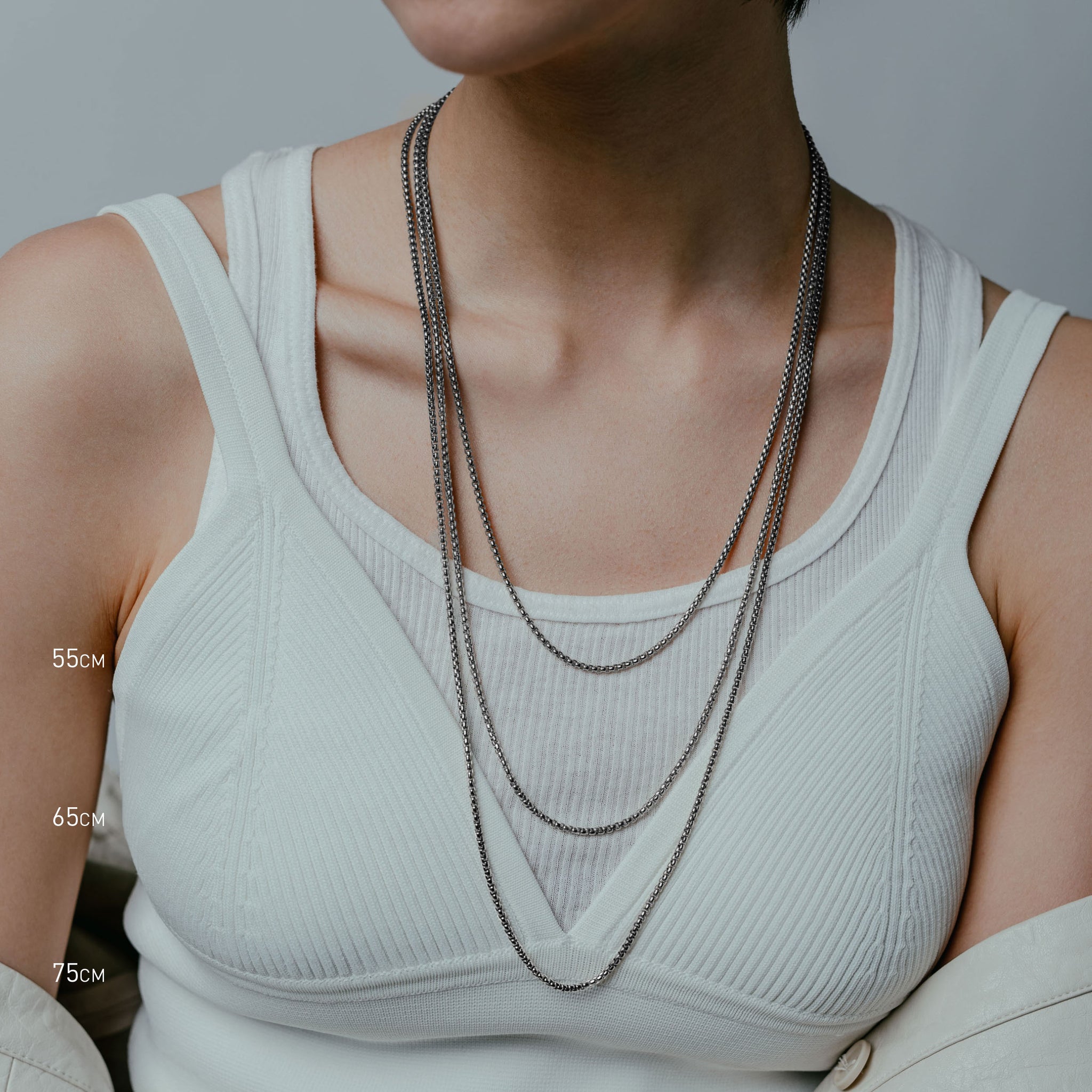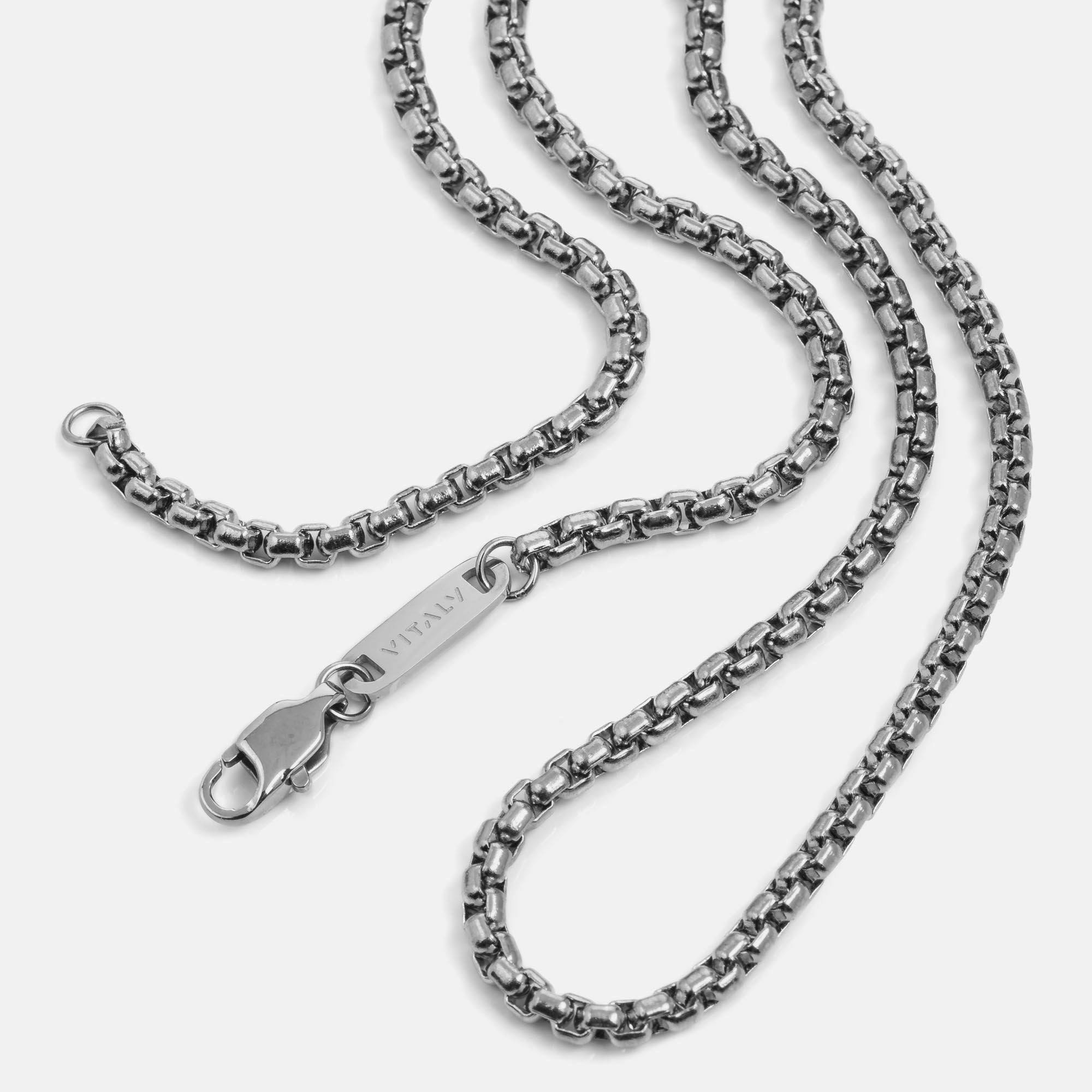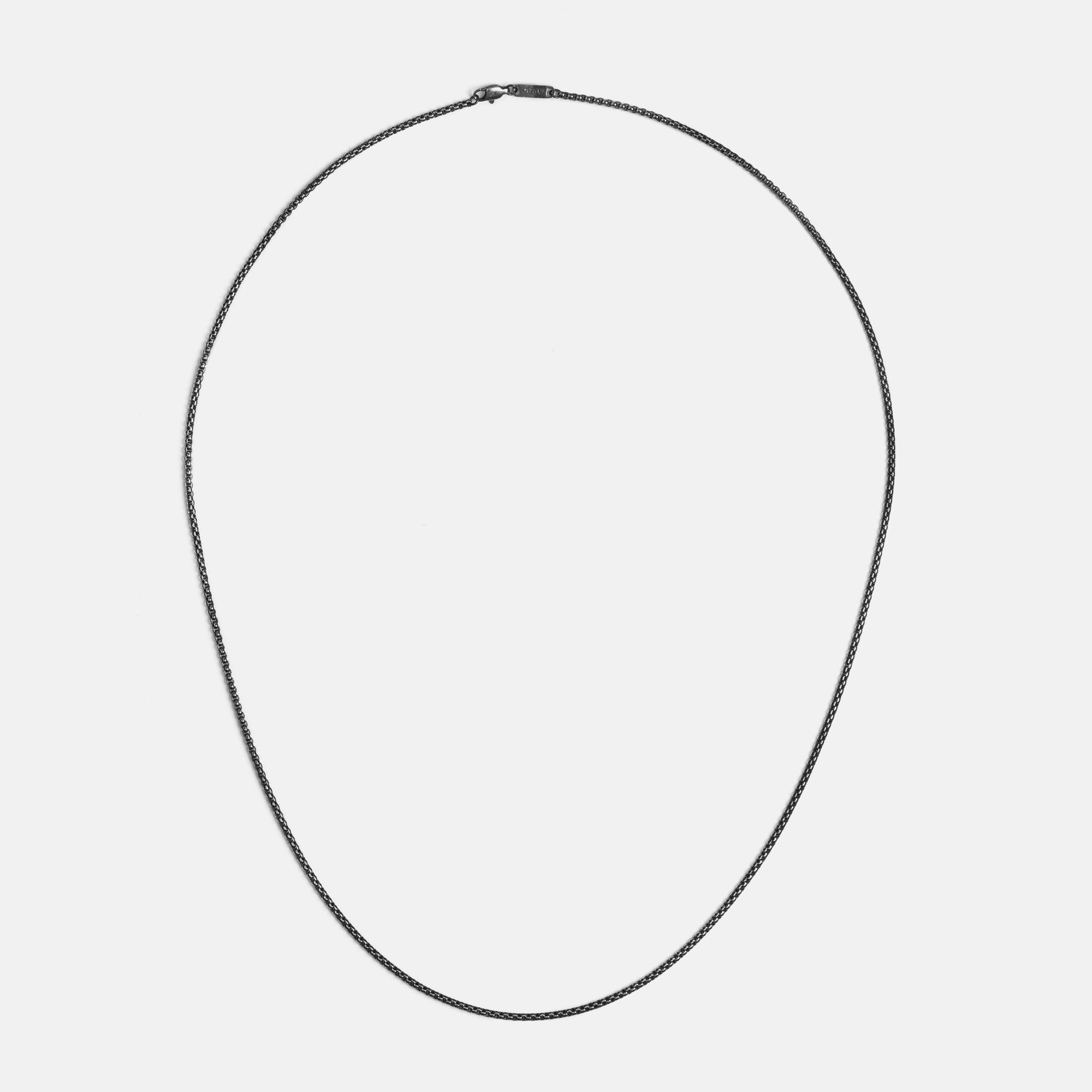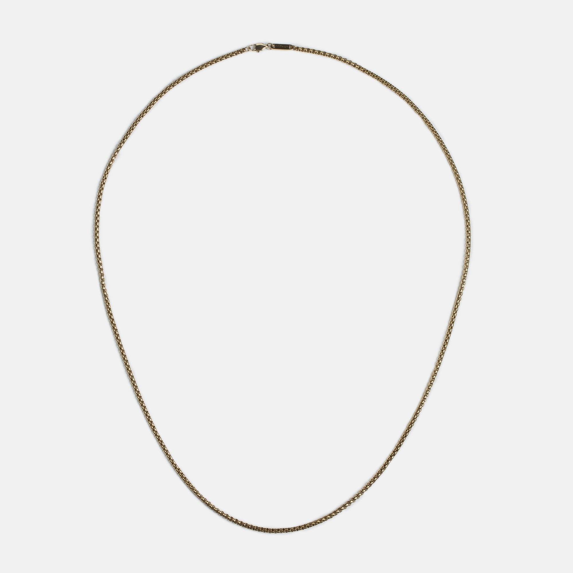 Single 55cm, 65cm or 75cm length rounded box chain. 2.4mm thick. Designed for layering.