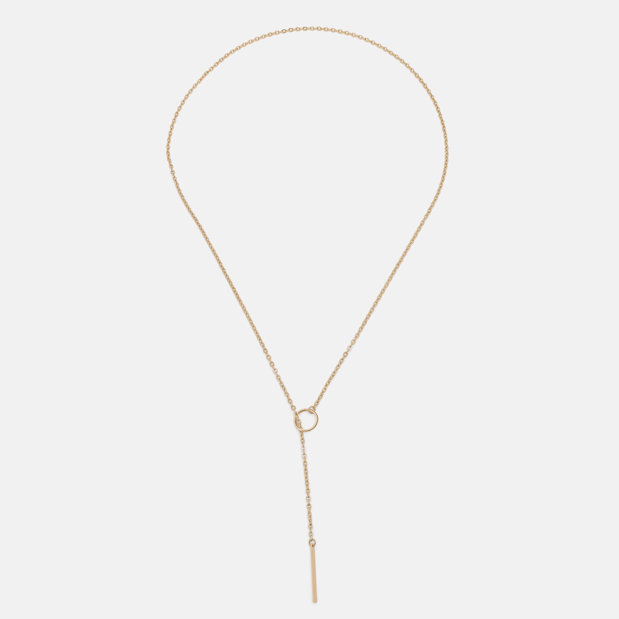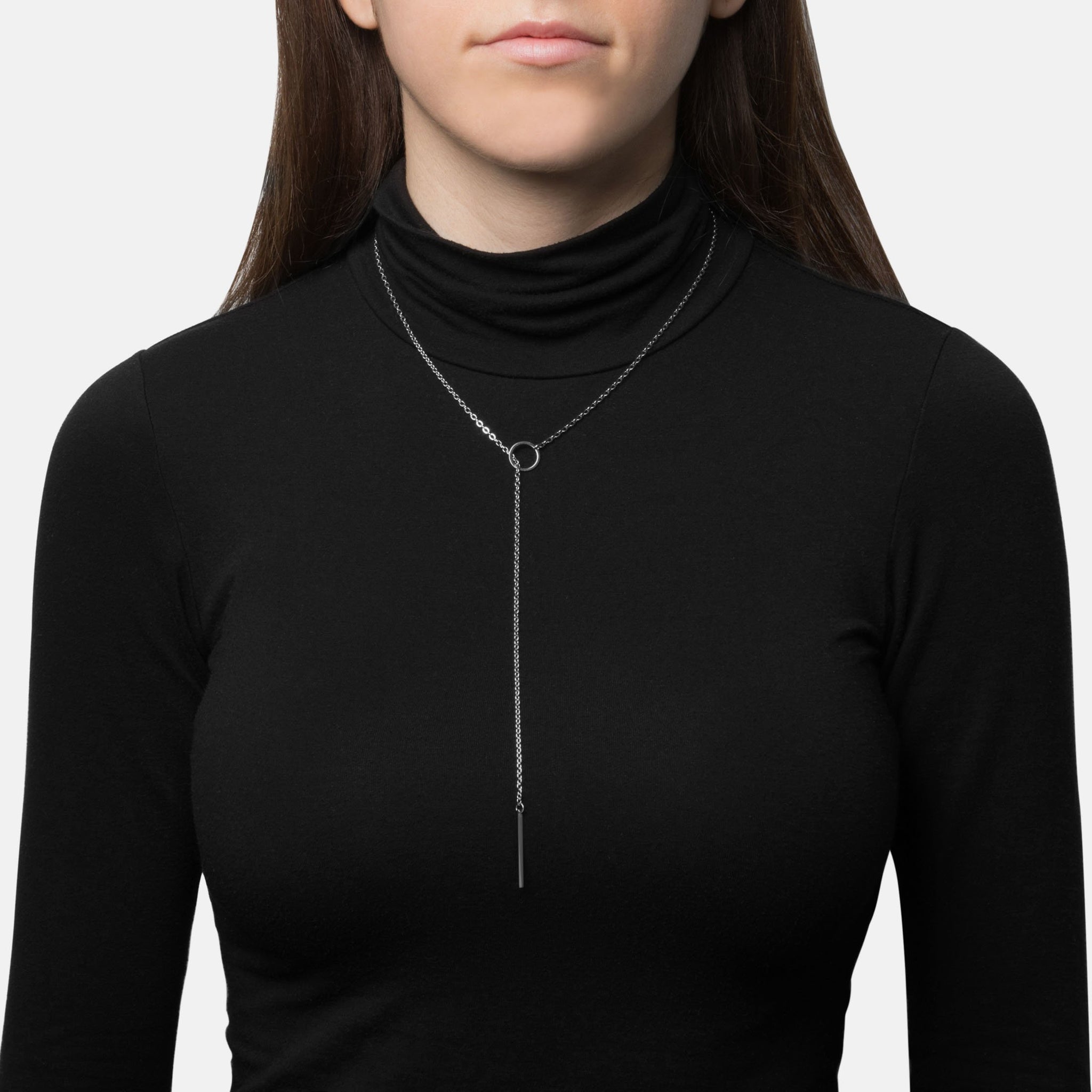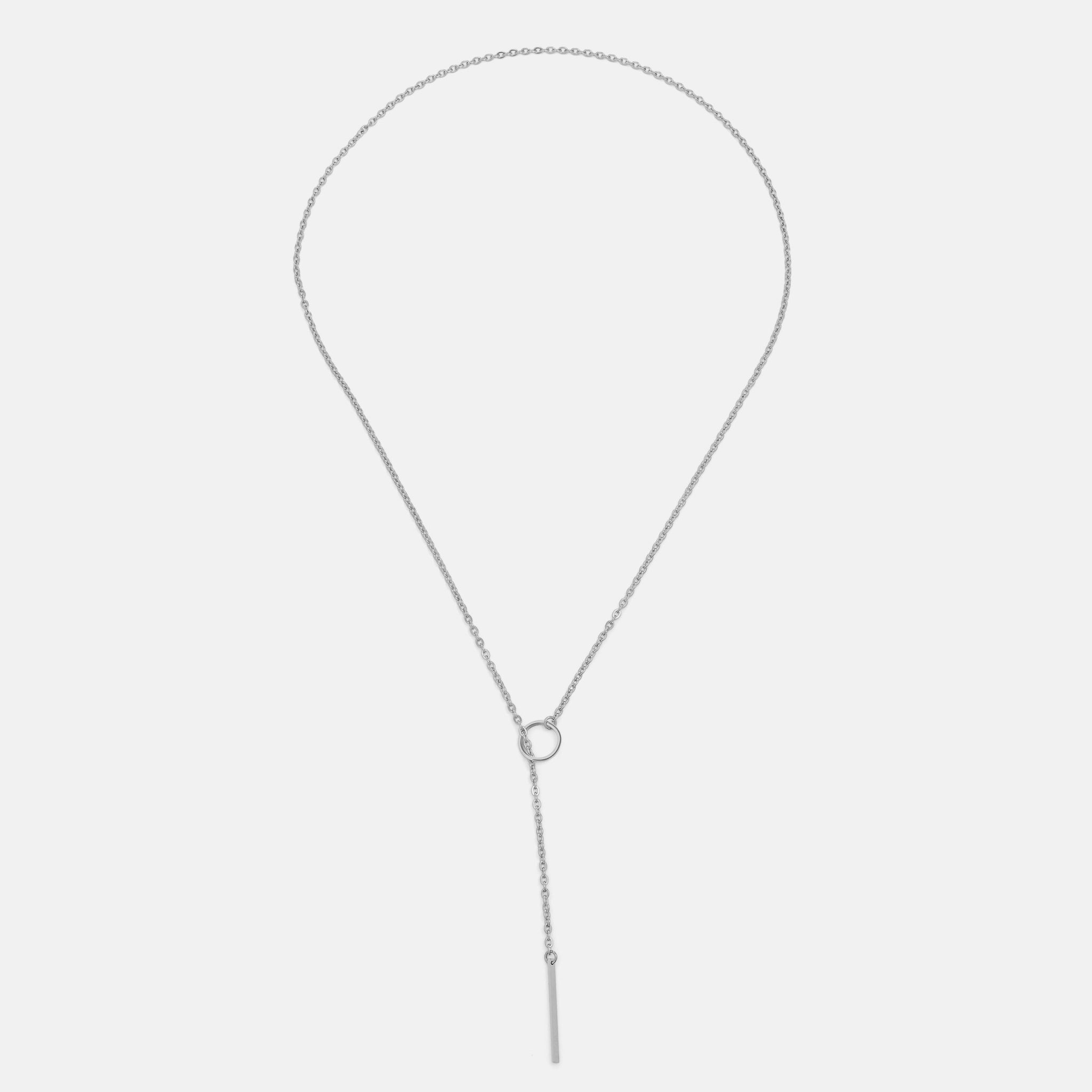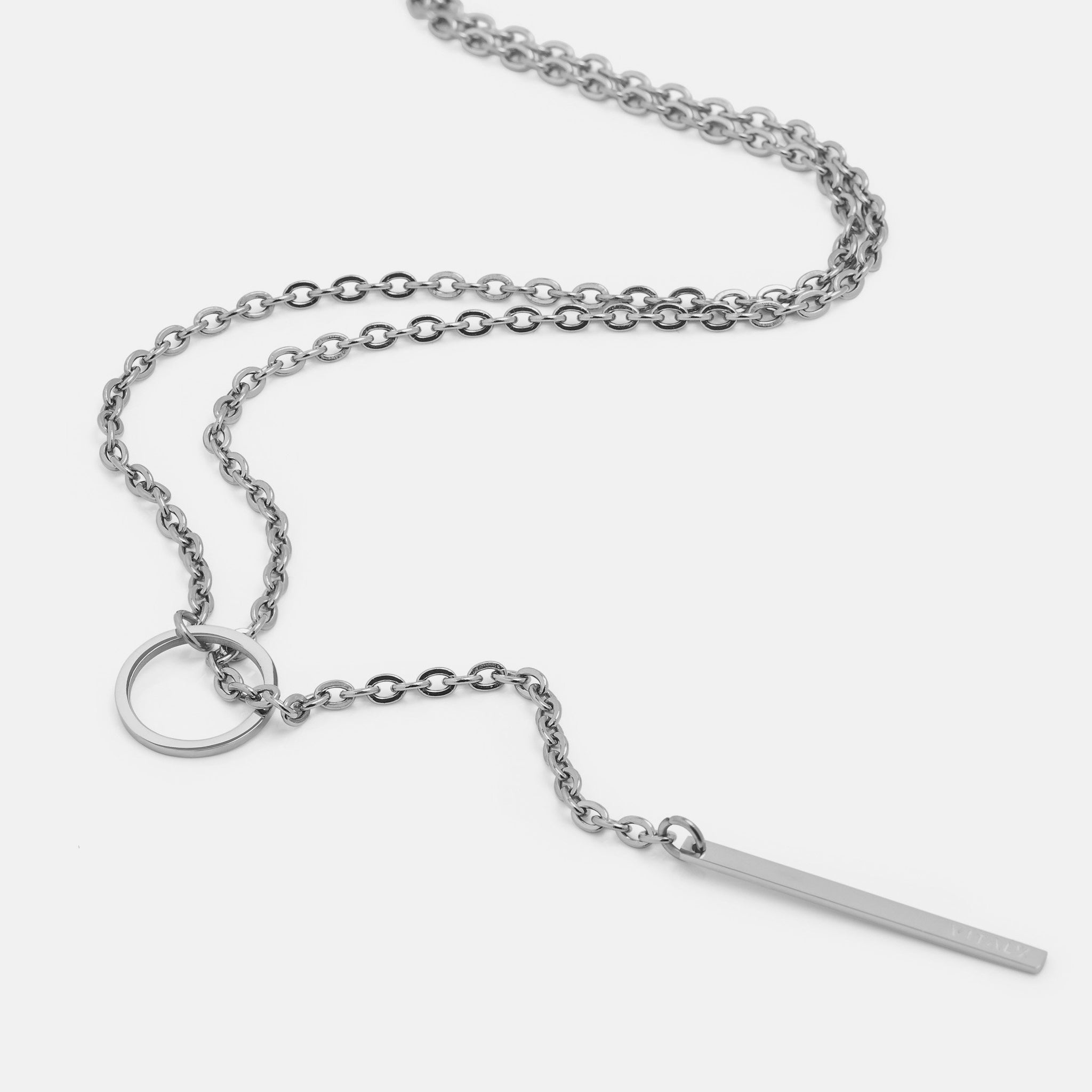 This long, cable-link chain ends with a geometric logo bar that threads loosely through the toggle opening. Length can be easily adjusted by pulling on the bar to create different looks.